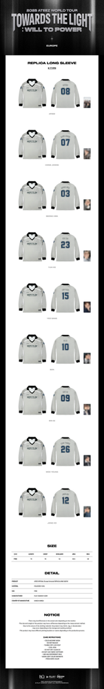 ‼️ Listing will end on 21 February 2025‼️ [PRESALE] ATEEZ Will To Power Towards the Light 2025 World Tour Europe Official Replica Long Sleeve Jersey. Long Sleeve Replica with Official Photocard Variations available: - Ateez OT8 - Hongjoong - Seonghwa - Yunho - Yeosang - San - Mingi - Wooyoung - Jongho ‼️ This is a presale. The items will be shipped by 3 March 2025 ‼️