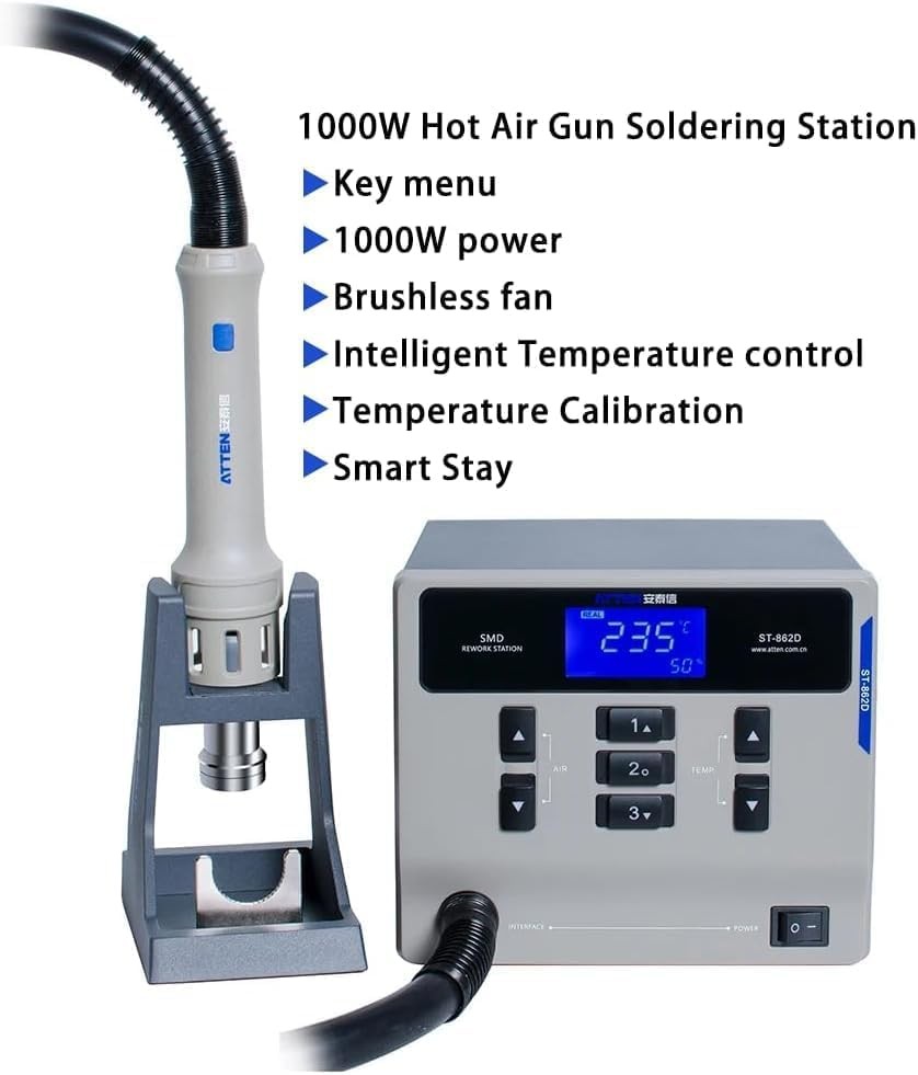 Intelligent constant temperature control system Intelligent constant temperature control, the hot air gun will automatically stop heating when it reaches the specified temperature. During use, it will collide with the air and the temperature will decrease. The hot air gun will automatically heat up and reach the specified temperature Magnetic induction automatic sleep mode The handle is equipped with a built-in magnetic induction device. When the handle is placed on the air gun bracket, the machine stops heating. When picked up and used again, press the switch on the handle to continue heating the air gun. Brushless eddy current fan The brushless vortex fan has a large air flow rate and strong air volume, making it easy to remove various components, including discrete, double row, and surface mount. Quickly replace the soldering iron bracket Quick replacement of air gun nozzle, user-friendly design, easy operation. Plug in heating element High heating efficiency, long lifespan, quick and convenient replacement of heating elements. High power transformer 1000W high power, suitable for high load areas, controllable temperature, able to work continuously, fast temperature recovery speed! Equipped with 4 air nozzles Equipped with 2 straight air nozzles and 2 cyclone air nozzles of different sizes to meet various welding needs. ATEEN 862D handle Ergonomic design, comfortable grip, lightweight and portable, with good insulation effect. LED display screen The large screen displays the working status and realizes visual human-machine operation. key Large buttons for easy operation Product size Compact and easy to place. Static grounding wire Plug and unplug design, with a wire length of about 1M, easy to use.