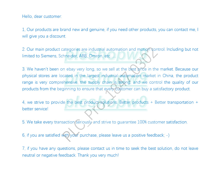 ATV320D15M3C 1PCS Brand New Schneider ATV320D15M3C Fast delivery Payment: We only accept payment via paypal. Shipping: 1. We ship this item within 1-2 working days after payment cleared. 2. Please leave a telephone number for on-time delivery. 3. We ship to worldwild. But if you are in exclude locations, please contact us for calculating the shipping cost. Return Police: 1. If you are not satisfied when you receive the item, please return it within 14 days for a replacement or money back. Please contact us before you return it. 2. If your item is defective in 14 days, We will send you a replacement without extra charger, or refund your money after we receive the defective item. 3. If your item is defective after 14 days, you can still send it back to us. We will send you a new one after receiving the defective item. But you need to pay the return shipping fee. Feedback: Since your feedback is very important to our business's development, we sincerely invite you to leave positive feedback and 5 stars for us if you are satisfied with our product and service. It will just take you 1 minute. Thank you! Question: Please don't hesitate to contact us if you have any questions or concerns before or after your purchase. We are committed to your 100% satisfaction. ATV320D15M3C 1PCS Brand New Schneider ATV320D15M3C Fast delivery Sales Policy 1. Your bid is a contract - Place an auction only if you are seriously considering buying the item. If you are the highest bidder, you will need to purchase a legal bid to purchase the item. If the payment is not received within 7 days, the item may be offered to the last bidder or put up for sale at the sole discretion of the seller. 2. The product at fixed price, please pay as soon as possible after the purchase. Please confirm the quantity you need, if the quantity is insufficient, please contact the seller for confirmation. Please do not buy products repeatedly, but not to pay. 3. Please confirm that you really need the product and the model. If you buy the wrong product, please contact the seller to cancel the order. Shipping Detail Standard: 10-25 days Accelerated: 3-7 days 1. Item will be shipped within 3 working days after receiving full payment. You should receive the item within 2-4 weeks. Send us an e-mail if you do not receive the items after 21 hours of work after full payment. 2. If there is a holiday in China or a weather anomaly, the shipment will be delayed, rest assured that we will organize the expedition as quickly as possible, thank you for your understanding and your support. 3. We ship only to the approved address specified in the PayPal payment. Make sure the payment address in PayPal is correct. Any item not received due to an invalid address registered on PayPal is not part of our full refund or replacement policy. 4. Please provide your phone number, it will allow you to receive the goods faster, no phone number, we can not deliver the item to you. 5. For highly magnetic products, we can only through the EMS delivery, as the servomotor. Payment method 1. We accept PayPal only. We ship within 3 business days of payment. 2. Serious bidders only, please. Orders will be canceled and a dispute over unpaid items will be filed if payment is not received within 16 days of purchase. Therefore, make sure you need it before buying the product. After purchase and if you no longer wish to pay, please contact the seller to cancel the order as soon as possible. Return policy 1. Please note that do not revise or open our product, if it has any questions, please contact us. If, without our authorization, we do not review or open our products, we will not accept the refund. 2. If your purchase does not suit you, we will be happy to exchange or refund the product within 14 days of your purchase. For any exchange or refund, we need the original receipt and the product must be in original condition, including box, packaging and all accessories. Please allow a maximum of 10 business days for return processing. 3. Shipping and handling charges are not refundable. You should pay for the shipping costs returned. Then we can fully refund you once the returned item has arrived at our warehouse. Comments and contact us 1. When you are satisfied with our products and services, leave us your comments. It's very important, we need it. 2. In case of any problem, please contact us immediately by e-mail, we will answer you as soon as possible and to discuss with you the right solution. We do not accept without contacting us who leave neutral and negative feedback. 3. Simply contact us via the "Ask the seller" link on eBay. On Sep 19, 2025 at 01:09:48 PDT, seller added the following information:
