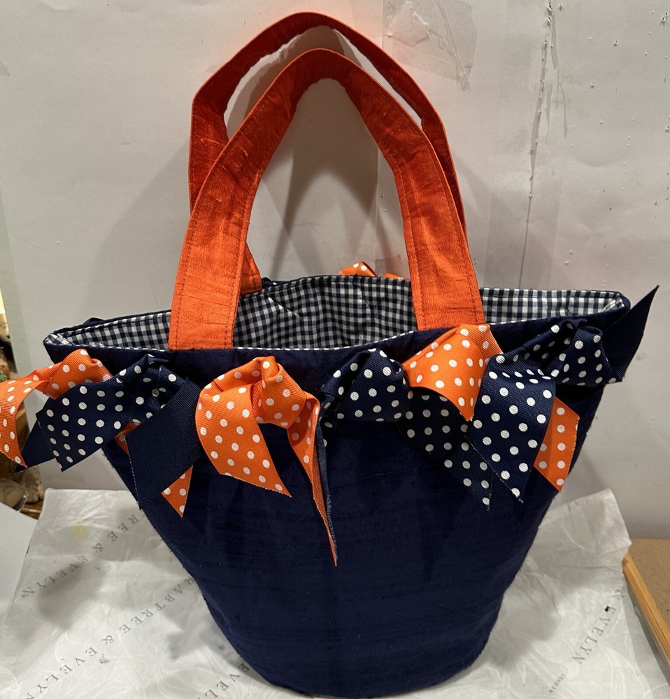 AUBURN UNIVERSITY Navy Orange Ribbon Satin Tote Medium size, approx. 7" bottom/14" wide top x 11" High x 4" deep Beautiful ribboned top. Inside pocket Great condition! Items will always be mailed within one business day of purchase, and by using the most reliable and cost efficient method, usually Priority. If there is a huge difference in price, you will receive a shipping credit. I want to foster great lines of communication with my buyers. Please check out all photos, and feel free to ask questions before purchase. Thanks for looking, and check out my other fab handbags for sale.
