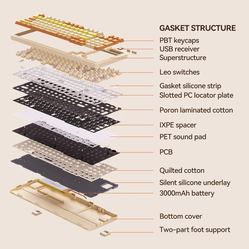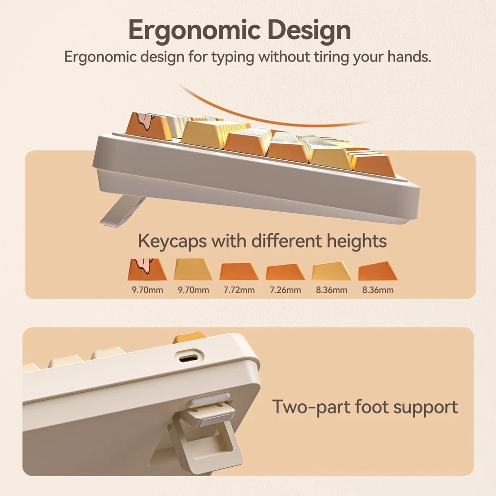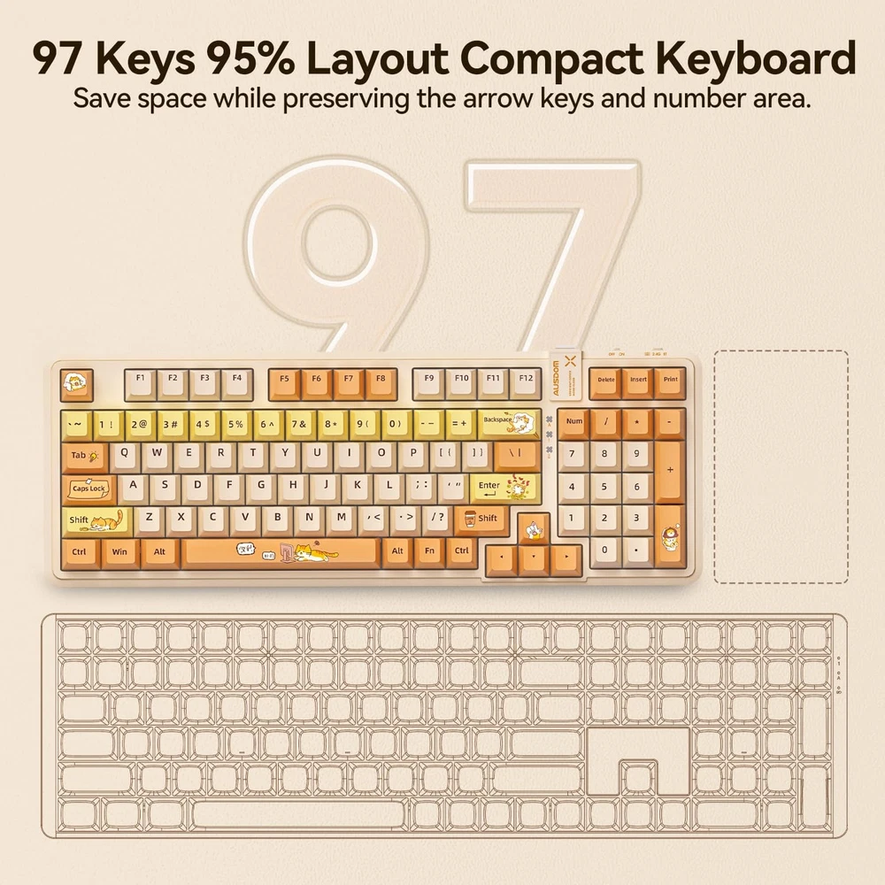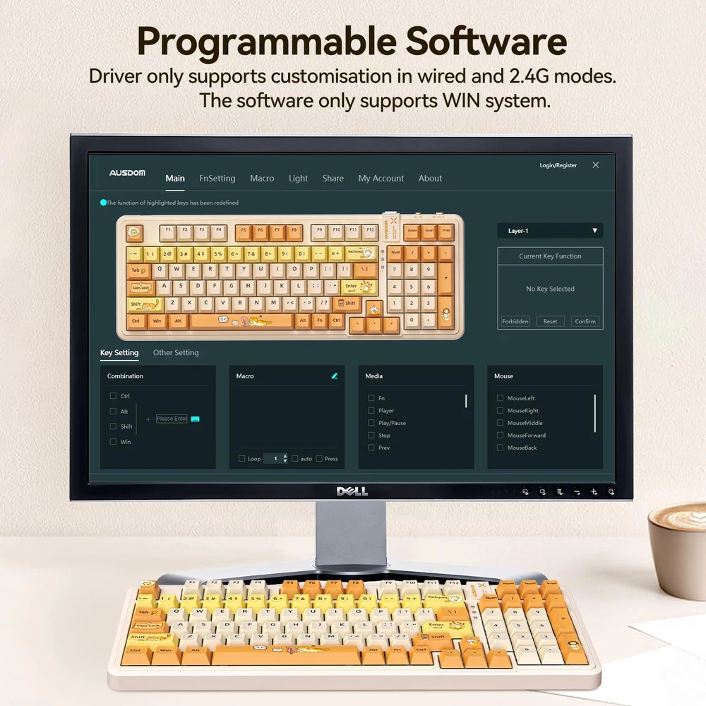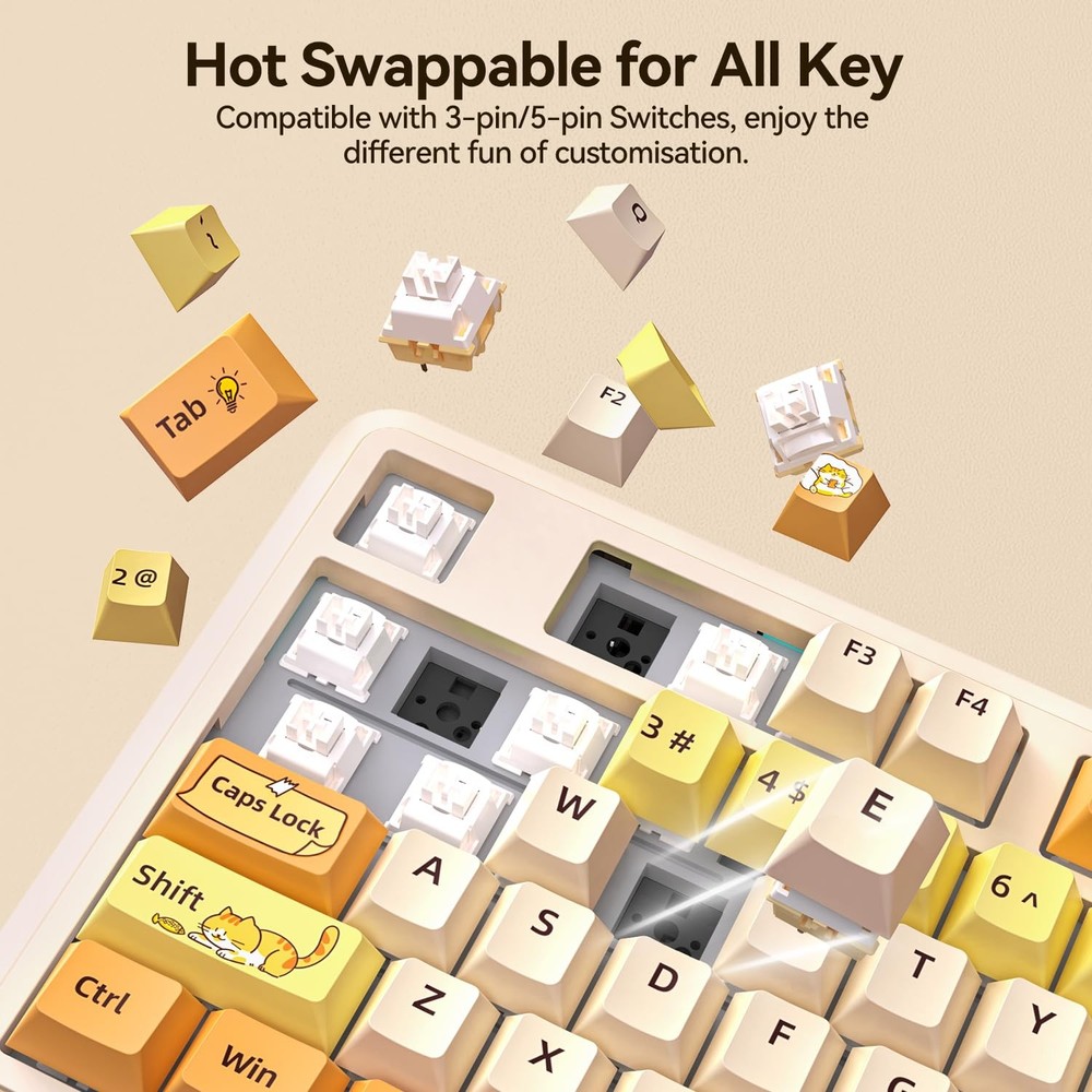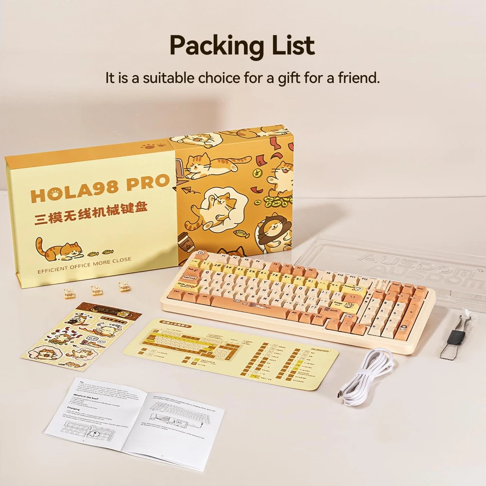 AUSDOM 98Pro Customized Mechanical Keyboard Tri-mode Wired/Bluetooth/Cordless Gaming Office All Keys Hot Swappable gasket Structure Heat Sublimation Multi-device connectivity: The bluetooth keyboard provides Bluetooth, 2.4GHz wireless and wired USB connectivity, supporting simultaneous connection of up to five devices and easy switching between devices via the FN+ key combination to meet different usage needs at the same time. Comfortable Typing Experience: This wireless gaming keyboard comes with gaskets and sound-absorbing shock-absorbing layers. This structure effectively reduces keyboard shaking and provides a focused typing experience. The thocky keyboard comes with dual height adjustment brackets, you can adjust the comfortable tilt according to your personal habits This cat-themed wireless mechanical keyboard combines a fresh, bright colour scheme with vibrant cat patterns to add a touch of colour to your desktop. This cute keyboard brings warmth and cuteness to your entire desktop. Custom Keyboard: Ausdom 98 Pro is a hot swappable mechanical keyboard that allows you to change the axes and keycaps after a period of time, allowing you to personalise the feel and look of the keys. Adjustable Backlight System: The Ausdom 98Pro is a premium backlit keyboard for work and play. 16 lighting effects create a great gaming atmosphere in the gaming room. 4 backlight levels can be switched at will, allowing you to work or play in any lighting condition. DURABLE & NON-FADE: This mechanical keyboard with number pad features high-quality PBT keycaps, which are more wear-resistant and oil-resistant than the traditional ABS material, and the characters are still clearly visible even after a long period of time, making it easier for you to type with ease. DURABLE & NON-FADE: This mechanical keyboard with number pad features high-quality PBT keycaps, which are more wear-resistant and oil-resistant than the traditional ABS material, and the characters are still clearly visible even after a long period of time, making it easier for you to type with ease.