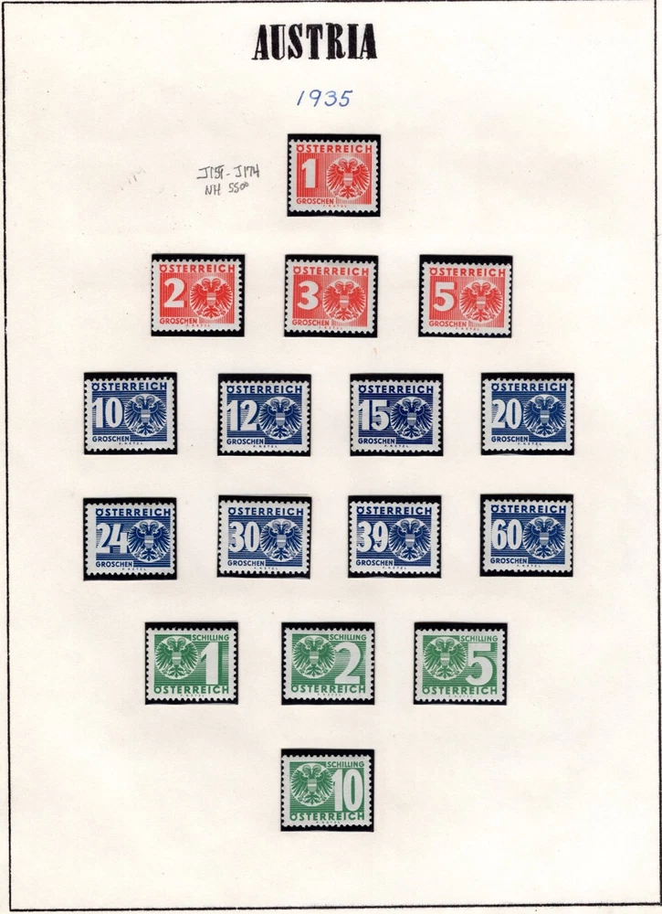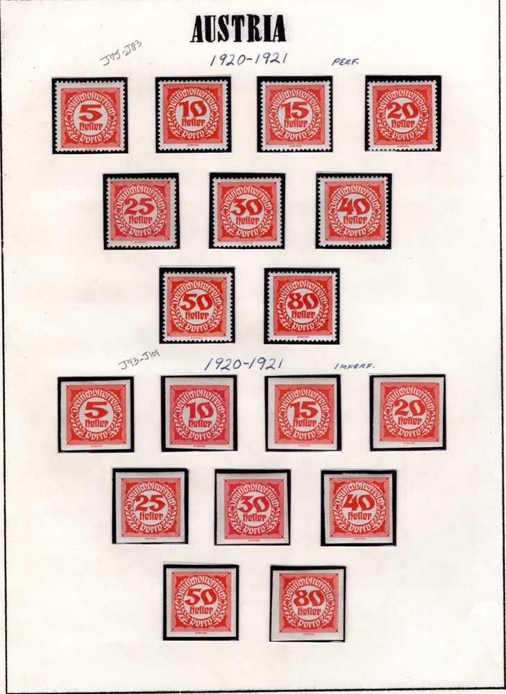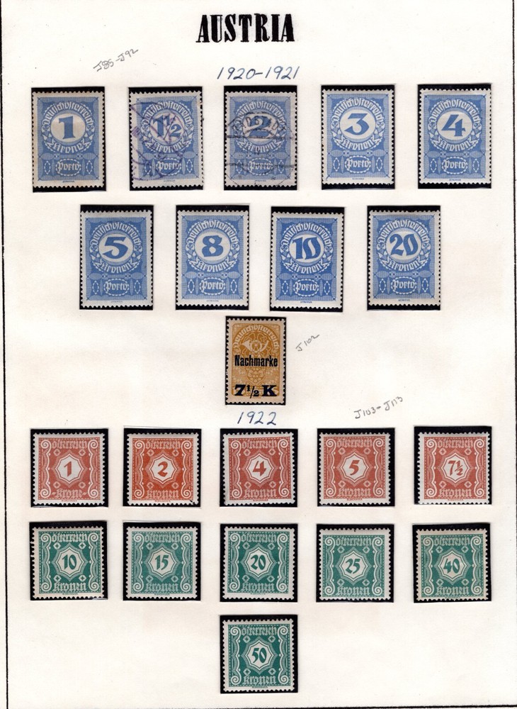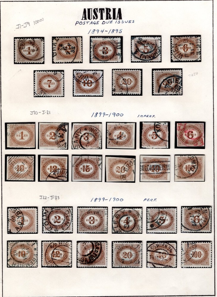 AUSTRIA 1894 -1957 COLLECTION OF POSTAGE DUES SCOTT # J1 - J259 IN HINGLESS PAGES ALL COMPLETE SETS LESS 2 STAMPS J45-J46 CV $450.00 FOR HINGED PLEASE VISIT MY EBAY STORE : Filatco Stamps BUY 5 ITEMS SHIPPING & REGISTRATION IS FREE INTERNATIONAL BUYERS PLEASE NOTE: EBAY AND PAYPAL REQUIRE REGISTRATION FOR TRACKING INTERNATIONAL SHIPMENTS. EBAY CHARGES $12.61 FOR SHIPPING LABELS WITH TRAKING # US POST OFFICE CHARGES $14.95 FOR REGISTRATION # + POSTAGE BUYER HAS THE CHOICE OF SHIPPING FIRST CLASS MAIL WITHOUT TRACKING # FOR $2.50 . IN THIS CASE BUYER ACCEPTS RESPONSIBILITY IF ITEM IS LOST IN TRANSIT. Feel free to ask if you have any questions. PAYMENT WITHIN 2 DAYS IS APPRECIATED . FEEDBACK : I APPRECIATE YOUR BUSINESS AND MY TOP CONCERN IS TO MAKE SURE YOU ARE 100% PLEASED WITH ANY ITEM YOU PURCHASE. IF YOU HAVE A CONCERN OR A PROBLEM WITH INVOICE, SHIPPING OR ANY ITEM YOU RECEIVED PLEASE CONTACT ME FIRST BEFORE YOU LEAVE ANY FEEDBACK. I GUARANTEE YOU WILL BE 100% SATISFIED WITH THE TRANSACTION. I WILL CERTAINLY LEAVE YOU A POSITIVE FEEDBACK AS SOON AS I RECEIVE YOURS.