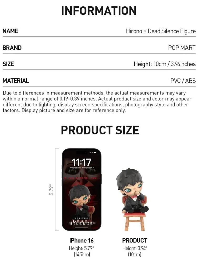 AUTHENTIC POP MART HIRONO X DEAD SILENCE SERIES FIGURE TOY BIRTHDAY GIFT DOLL Product Description Please read before you order Shipping Information Import Taxes & Duties Contact Us Product Description 1.Just pick the figures you want and the shipping fee could be combined automatically. 2.The photos are from official for sample, please see the list pictures for what included of each figure. Please read before you order 1 . We promised all figures are genuine and passed the factory quality inspection. 2 . The figures are painted by hand in factory, can not be 100% perfect. 3 . For no box figures, we will pick the best one for you in stock. Thanks for understand. Shipping Information 1 .Love multiple items? Enjoy combined shipping—just add all to your cart. 2.The item will be sent in 10 business days after receive your cleared payment. 3.If you need a faster shipping, feel free to message us! , thank you:) 2.Standard full tracking international shipping, about 2-3 weeks to worldwide. Import Taxes & Duties 1.The product price or shipping cost does not include import duties, all additional cost should be payed by the buyer. 2.Please check with the customs of your country or region to determine what these additional costs will be before bidding or purchasing. 3.These charges are normally collected by the shipping carrier or when the item is picked up. Do not confuse them with additional shipping costs. Contact Us 1.If you have any questions or req uirements about the items, please contact us. Thank you very much. 2 .After you receive your items, please leave me positive feedback as soon as possible if you are satisfied. 3.We understand you may be not satisfied about several items. Please email us first before you leaving negative feedback. And we will try our best to resolve the issues. Thank you for choosing BOOM TOY — where passion for collectibles meets dedicated service! Country of Origin China Material PVC, ABS Sport Boxing Features Boxed Type Action Figure TV Show Gifts Occasion all occasion Theme Hirono x Dead silence Brand POP MART Item Height 10 cm