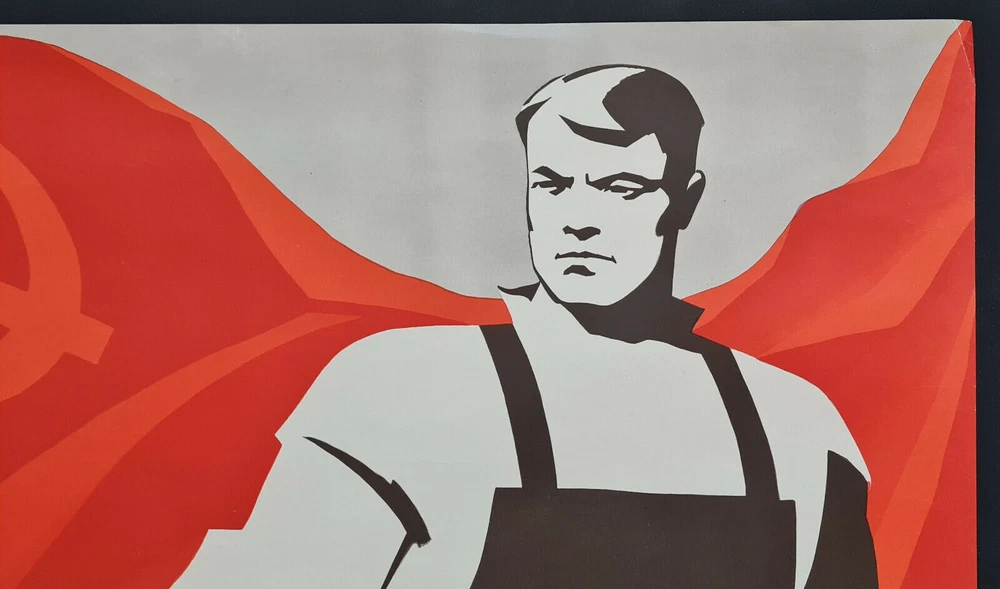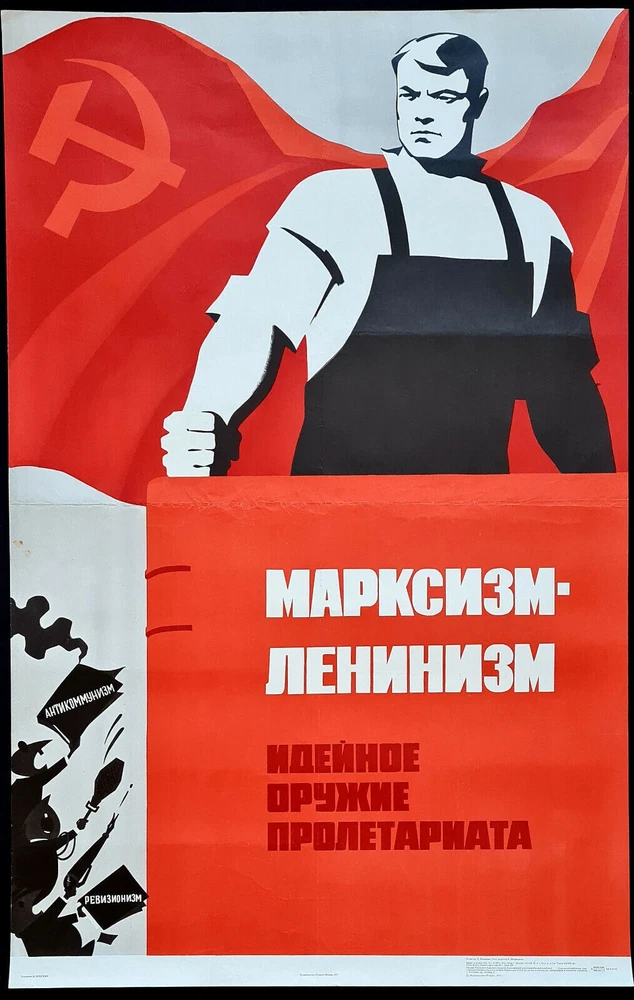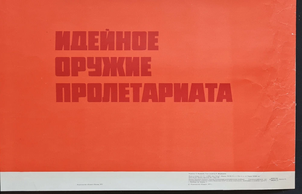 Original slogans on the poster: МАРКСИЗМ-ЛЕНИНИЗМ ИДЕЙНОЕ ОРУЖИЕ ПРОЛЕТАРИАТА Literally English translation: MARXISM - LENINISM IS IDEOLOGICAL WEAPON OF THE PROLETARIAT. ANTI-COMMUNISM, REVISIONISM POSTER ARTIST: BRISKIN VENIAMIN MARKOVICH PRINT YEAR: 1975 SUBJECT: ANI USA, MARXISM, LENENISM LANGUAGE: RUSSIAN PRINT RUN: 220.000 PUBLISHED BY: "PLAKAT", MOSCOW SIZE: IN: 26 ³/₈ x 40 ³⁵/₆₄ = CM: 67 x 103 CONDITION: ROLLED, SLIGHT FOLD IN THE MIDDLE The are two posters available, condition a little varies, all posters have horizontal fold in the middle plus some creases and tears, but the posters have been flattened under press and all of the defects are slightly to see alive plus there are minor tape repairs on the reverse, otherwise the poster is in a pretty nice overall condition ( For more condition information please feel free to require additional pictures or video ), is very impressive and hard to find one, created by one of the famous Soviet poster artist: BRISKIN VENIAMIN MARKOVICH (1906-1982) - Highly famous Ukrainian Soviet graphic artist; outstanding poster artist; received recognition as the author of satirical posters on sensitive social and political topics. Member of the Union of Artists of the USSR (since 1967). Honored Artist of the RSFSR. Founder and head editor of the famous workshop “Agitplakat”. Was born in Romny in 1906. Studied at the Kharkov Institute of Art and Industry (1921−1925) under S.M. Prokhorov and M.A.Sharonov. Participant of exhibitions since 1926. He was engaged in book and magazine graphics for the Military Publishing House, painted for the Krokodil magazine (1932−1933), the newspapers Komsomolskaya Pravda (from 1934), Pravda (1956), in easel graphics he performed the series Vasya Terkin (1940), "Postwar Europe" (1947), designed books by M. Gorky and M. Twain. In the poster genre, he achieved great success, an outstanding, subtle draftsman, easily and wittily revealed the characters of the characters in his works. Known for his posters on foreign policy, in them with humor, ridiculed the vices of capitalist society. In the 60s and 70s, in Briskin's works, the monumentality and generalization of forms increased, nevertheless, during this period, his posters stand out for their sharpness, attention to detail and technical perfection. Made several posters together with Peter Karachentsov. He fruitfully collaborated with his younger colleague Konstantin Ivanov, with whom in 1956 he created the creative and production association "Agitplakat". The chief art editor of which was Benjamin Briskin. Collaborated with the state publishing house "IZOGIZ" and "Soviet artist"; known for his cycle of satirical posters dedicated to the problems of agriculture, criticizing lazy people, truants, slovens and drunkards: “Don't expect a good tribe from a bad seed” (1954), “Don't be like that! I skipped the day ... I lost the harvest "(1954)," Closer to life, to a living business! " (1954), “Don't be like that! The work is in full swing, but she is going to the market ... ”(1955). Participated in numerous exhibitions in the USSR and abroad. In 1970, at the international exhibition "Satire in the Struggle for Peace" in Moscow, he received the gold medal of the Soviet Peace Fund. Author of the book "Experience of working on a propaganda poster." Briskin in the poster genre has achieved great success, superior, fine draftsman, easily and cleverly revealed the characters in his works. Here created some posters about foreign policy, where with humor, made fun of the vices of capitalist society. In 60-70 years in the artworks of Briskin amplified monumental and generalized forms, nevertheless during this period, his posters are distinguished by the sharpness, attention to detail and technical perfection. Veniamin Briskin died on March 28, 1982. He was buried in Moscow Cemetery Vagankovsky. Listing and template services provided by inkFrog