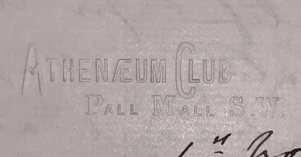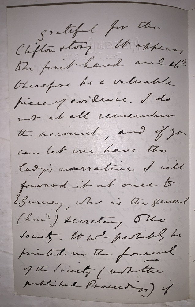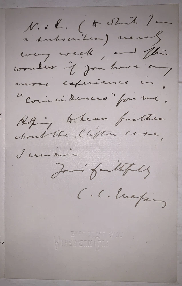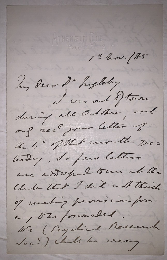 An original seven page, C. C. Massey autograph letter signed, dated 1885. Two pieces of paper, each folded once to create eight pages with manuscript text on seven sides. Written on paper with an embossed letterhead that reads "Athenaeum Club. Pall Mall S. W." and signed at the end by C.C. Massey. Some minor wear, minor discoloration, else in very good + condition. Charles Carleton Massey (1838–1905) was a British barrister, mystic, and pioneering figure in the early study of psychical phenomena. A man of deep intellectual and spiritual interests, he was closely involved with both the Theosophical Society—serving as the first president of its London branch—and the Society for Psychical Research, where he played a foundational role before resigning over internal disputes. Massey was deeply influenced by Christian mysticism and the writings of Jacob Böhme and Emanuel Swedenborg, and he actively defended controversial mediums such as Henry Slade and William Eglinton against charges of fraud. His 1880 English translation of Johann Zöllner’s Transcendental Physics introduced continental psychical theories to an English-speaking audience. Posthumously, his writings were collected in Thoughts of a Modern Mystic (1909), cementing his reputation as a serious thinker at the intersection of law, spirituality, and psychical research during the Victorian era. If you have any questions, feel free to ask, and don't forget to check out my other listings.