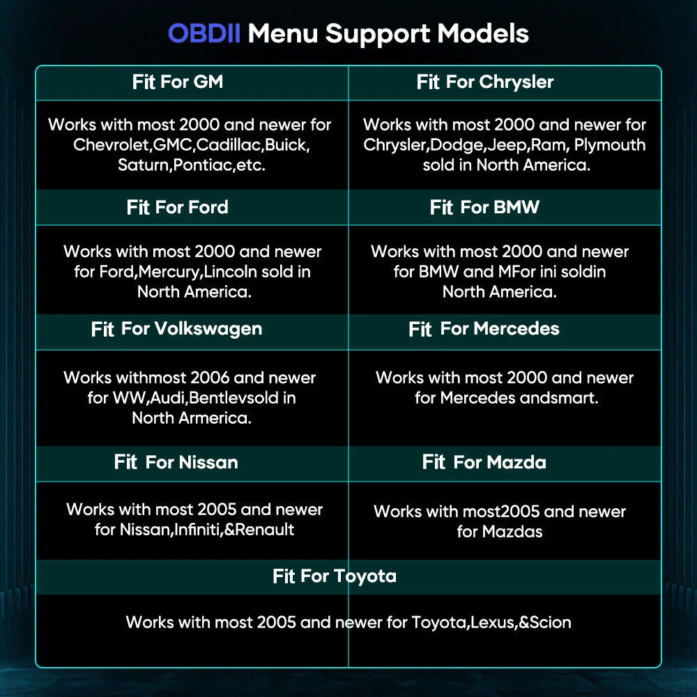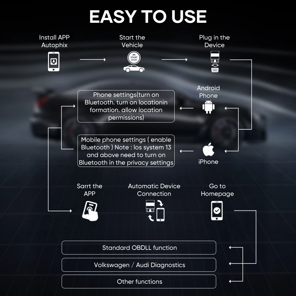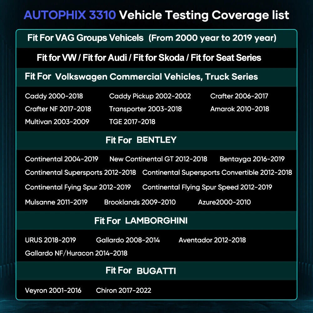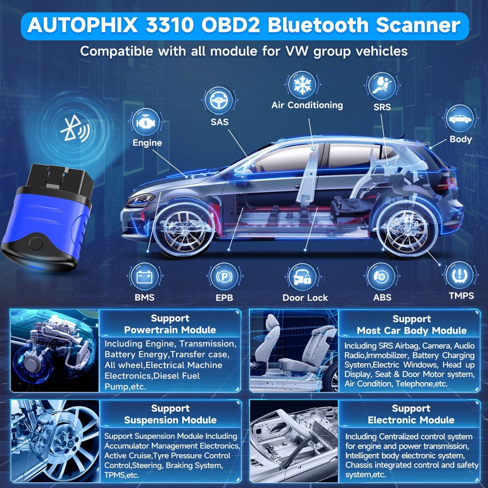 AUTOPHIX Bluetooth/Wireless Diagnostic Tool’s Philosophy: Easiest, Fastest and More Powerful Full Systems Comprehensive Diagnosis: Don't underestimate its small body, the AUTOPHIX 3310 bluetooth diagnostic scanner can easily access to full control modules and then diagnose all systems for all VAG vehicles. You can deserve all basic functions while entering every systems: version information, read & clear codes, datastream(text & chart display). Universal Scanner — Wide Compatiblity: AUTOPHIX 3310 bluetooth scanner tool is not only a full systemscanner for VAG vehicles, but a universal obd2 code reader that can check the engine system for all car brands' vehicles. So it would be great if you have several cars at home! Read Fault Codes:Option is used to read the current, pending or permanent trouble codes. Erase/Clear Codes:Option allows you to clear the existing or historic trouble codes. Vehicle Information:allows you to view the relevant information of the vehicle, including VIN (Vehicle identification Number), CID (Calibration ID) and CVN (Calibration verification number). Service Reset:Allows you to reset the service lamps on the instrument cluster,enabling you to do your own maintenance work efficiently and effortlessly. Support Multi-language:Chinese,English,German,Spanish,French,Italian Feedback function: Please feel free to feedback your problems to us through "Autophix"APP, Our professional technical team will provide you with excellent solutions. Report Function: Simple and super easy to use, AUTOPHIX 3310 is a must-have diagnostic tool for today’s technologically loaded vehicles ,it can generates professional diagnosis report, you can share diagnosis report to your friend or mechanic through APP to solve your car problems. BAT check:It can check the health of your battery and voltage and display the voltage change within a certain period of time in the form of graphics and tables on the mobile phone.Battery's importance: Supplies power to the starting system, ignition system, electronic fuel injection system, and other electrical equipment of the vehicle. Help Function:Select the corresponding model to view the help information, including: demo video (the phone must have a network to view),Connect Device can view the operation steps in document form. Wireless & Bluetooth:3310 obd2 scanner connects with Bluetooth via your phone/tablet to a sensor that plugs into your car's OBDII port.Just plug the vehicle code reader into the car OBD interface, then turn the ignition on and open the "Autophix" APP on your phone or iPad to automatically connect successfully instantly. Powerful Full System Diagnostic Scan Tool Compatible with VW/ Audi/ Skoda/ SEAT AUTOPHIX 3310 bluetooth obd2 scanner has developed this scan tool to meet industry demands for diagnosing and repairing virtually any vehicle on the road today. It strives to make automotive repairs accurate,easy, efficient and affordable for do-it-yourself to professional-level technicians. AUTOPHIX 3310 function has a working range of 95% to 100% ( other diagnostic tools can achieve the function of OE scanner only 60% to 75% ). Engine System: Engine is a device that provides power for the automobile and the heart of the automobile. 3310 OBD2 scanner Support all OBD2 cars from 1996 to now. It can support all modes OBDII functions & battery Voltage. Easily identify car problems and determine the engine lights. Help you pass the e-xhaust test and keep your car in the best condition. TPMS System: Allows you to check the tire sensor IDs from the vehicle and to perform TPMS p-rogramming and reset after tires sensors are replaced or rotated. SRS/ Airbag System: SRS is a device that expands the airbag to protect the passenger before the second collision occurs called Supplemental Restraint System (SRS). ABS System: ABS automatically control the braking force of the brake when the car is braking to ensure the maximum adhesion between wheels and ground. Whenever you change a part of the brake system, you will need to bleed the brake system afterward. 3310 Allows you to use the scanner temporarily to activate or control anti-lock brake system. SAS System: Allows you to perform c-alibration of the steering angle sensor, which permanently stores the current steering wheel position as straight-ahead in the sensor EEPROM. After c-alibrate sensor successfully, its fault memory will be automatically cleared. A/C (Air Conditioner) System: Supports routine maintenance of air condition modules, such as air conditioning system adaption reset, rese air conditioning compressor, run in air conditioning compressor, stepper motor initialization. Elite Enhanced All Systems Diagnostic Scanner Compatible with VW/ AUDI/ SKODA/ SEAT >>>>1.Powertrain Module: Engine, Transmission, Battery Energy,Transfer case, All wheel,Electrical Machine Electronics, Diesel Fuel Pump,etc. >>>>2. Body Module: SRS Airbag System, Camera, Audio Radio System, Gateway System, Charging Interface Module, Parking Assistance, Power Control Unit, Light, Battery Charging System, Roof, Seat & Door Motor system, Immobilizer, ABS ESP system, Air Condition, Electric Windows, and more... >>>>3.Suspension Module: Steering Angle Sender, Rear Axle Steering, Tire Pressure Monitoring, Wheel Dampening Electronics, Active Steering, Parking Brake, Chassis Control, Roll Control System, Reductant Control Module,Sensors Brake Systems, Trailer Function and More... >>>>4.Electronic Module: Centralized control system for engine and power transmission,Intelligent body electronic system, Chassis integrated control and safety system,etc. Service Reset:Allows you to reset the service lamps on the instrument cluster,enabling you to do your own maintenance work efficiently and effortlessly. BAT Check: Check vehicle battery voltage status in real time and then you can know your car battery status via the voltage reference. Battery's importance: Supplies power to the starting system, ignition system, electronic fuel