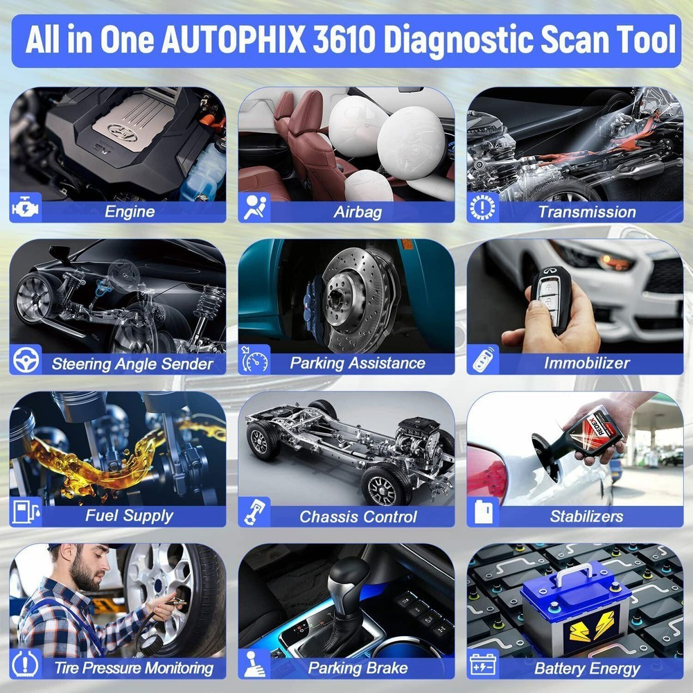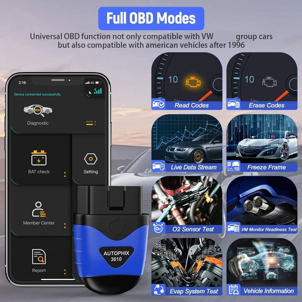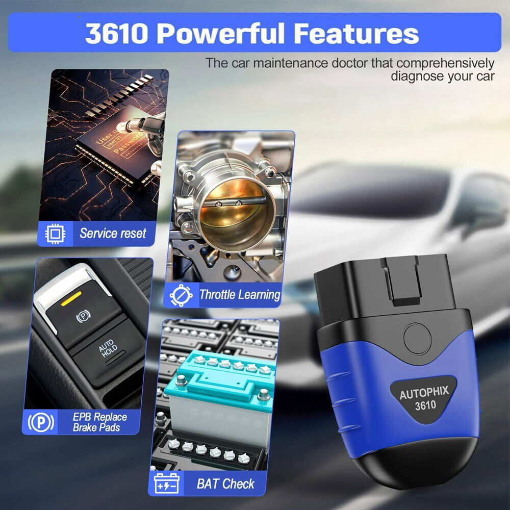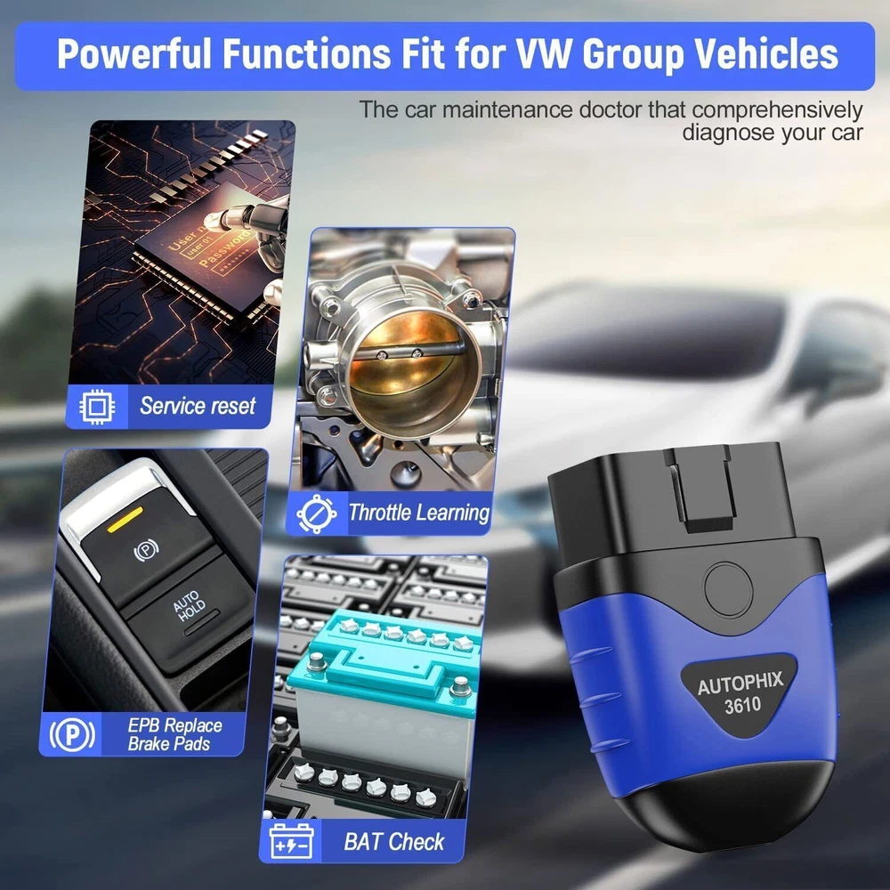 AUTOPHIX 3610 Bluetooth Diagnostic scan Tool for VW/ Audi/ Skoda/ SEAT Full-System Car Code Reader OBD2 Scanner with EPB Battery Service Reset Throttle Learning for iPhone,iPad & Android AUTOPHIX 3610 has developed this scan tool to meet industry demands for diagnosing and repairing virtually any vehicle on the road today. It strives to make automotive repairs easy, efficient, accurate, and affordable for do-it-yourself to professional-level technicians. Full system diagnostic & Full OBDII functions : Read Codes, Erase Codes, Live Data Stream, Freeze Frame, O2 Sensor,I/M Monitor Readiness, Evap System Test, Retrieves Vehicle Information; 1. The 3610 OBD2 scanner is specially designed for diagnosing most 12V 16-Pin Volkswagen/Audi/Skoda/SEAT V/A Series vehicles, but it also has the ability to work on 12V cars and light trucks (non-electric) manufactured in 1996 or later that are OBD II-compliant with 16-Pin OBD II protocols (J1850 VPM, J1850PWM, ISO9141, KWP 2000 and CAN) 2. For Volkswagen (VAG) vehicles diagnosis, the device can not only read and erase codes on engine, ABS, Transmission, SAS (not all cars), ESP, TPMS and other systems, but also reset the oil, brake pad and throttle position adaption 3. For other OBD II vehicles, 3610 is capable of reading/erasing, show error code definitions, turning off the MIL (check engine light) and retrieving VIN information 4. 3610 ’s diagnostic range for Volkswagen vehicles covers the following vehicles: VW (CC, EOS, Golf, GTI, Jetta, Passat, Phaeton, Polo, Rabbit, Sharan, Tiguan, Touran, Touareg); Audi (A3, A4, A6, A7, A8, A5, Q3, Q5, Q7, R8, RS3, TT, RS, RS5, S4, S6); Skoda (Octavia, Rapid, Yeti, Kodiaq, Fabio, Superb); SEAT (Leon, Ateca, Ibize, Altea, Cushion, Cord, Alhambra) diagnosis 5. With English and German as the two display languages, this diagnostic tool provides life-time free software updates to fix the latest bugs or add new parameters. Just download the software from the official website, then follow on-screen instructions to install This AUTOPHIX Bluetooth 3610 Scanner Service Functions 1.Oil Service Reset Sometimes shops neglect to reset the maintenance-required meter if the light doesn't happen to be on yet when they are changing the oil. Many quick-lube shops simply don't know how to reset it. OBD2 scanner oil reset comes on strictly as a function of those miles can through maintenance-required light comes on to remind you to change your oil. 2.TP Position Adaptation The TPS connects to the throttle plate on the throttle body. The position sensor has a variable resistance potentiometer that sends a varying voltage signal to the Power Control Module (your car's engine computer) according to the position of the throttle plate. With the engine running, the position of the throttle plate (along with other sensors) tells the computer how much fuel the engine needs at any given moment. OBD2 scanners correct signal coming from the TPS, remind you begin to notice drivability problems. 3.EPB Brake Pad Reset Electronic handbrake is a technology that realizes parking brake by electronic control. Unlike the traditional handbrake where the driver pulls the level, in EBP the driver presses a switch. The switch then sends a command to electronic brake module. The module senses that the parking brakes need to be operated then sends a command to actuators in the brake calipers. Autophix code reders a trick to save you money and time. Pro-quality full Systems Diagnostics OBD2 Scanner for VAG vehicle group As an enhanced OBD2 scanner for VW Audi Skoda Seat, AUTOPHIX 3610 will serve you well with necessary features, being a wonderful option for DIYers, car enthusiasts, and mechanics as well. Get a real pro-quality automotive diagnostic scan tool that has everything you expect: >>1.An affordable diagnostic scanner with deep detection on powertrain module,suspension module, body module, electronic module for VW Audi Skoda Seat after 1996. >>2.Full systems diagnostic tool: access to ECU information, read & erase fault generic / manufacturer-specific codes, turns off warning lights. >>3.AUTOPHIX 3610 Bluetooth diagnostic scan tool has 3 hot service functions including Service reset, EPB Replace Brake Pads,Throttle Learning, Supports OEM level diagnostics. >>4.All OBD2 Modes with all 8 test modes works on most OBDii / CAN cars made from 1996 and forward. >>5.Battery Voltage Monitor: check vehicle battery voltage status in real time. >>6.The upgraded 3610 Bluetooth diagnostic tool can help you read many data stream parameters for VAG vehicle. such as engine RPM, speed, coolant temperature, voltage, and so on. Allows you to more accurately and simply understand the situation of your vehicle. >>7.Automatically generate Diagnostic Report, When you encounter a problem that you do not understand, you can print the diagnostic report to the mechanic. >>8.Quick to learn and easy to use: Support Android 4.2 ; logically well-laid interface; DTC LookUp Library. >>9.Free lifetime update via APP; Feedback function for timely online technical assistance. >>10.Multilingual support: English, French, Spanish, German, Italian, Chinese, Cestina. >>11.Automatic connection: Don't worry about how to connect the product to your mobile phone, just plug the product into the OBD interface of the car, then turn the ignition on, and then open the "Autophix" APP to automatically connect successfully. Powerful Full System Diagnosis >>>>1.Powertrain Module Engine, Transmission, Battery Energy, All wheel, Transfer case, Electrical Machine Electronics, Diesel Fuel Pump, Thermal Management, and more. >>>>2.Suspension Module Accumulator Management Electronics, Steering, Integrated Chassis Management, Tyre Pressure Control, Active Cruise Control, Braking System, Suspension, TPMS and more. >>>>3.Body Module SRS Airbag, Camera, Audio Radio, Gateway, Touch box, Light, Battery Charging System, Head up Display, Seat & Door Motor system, Immobilizer, ABS ESP system, Air Condition,Electric Wind