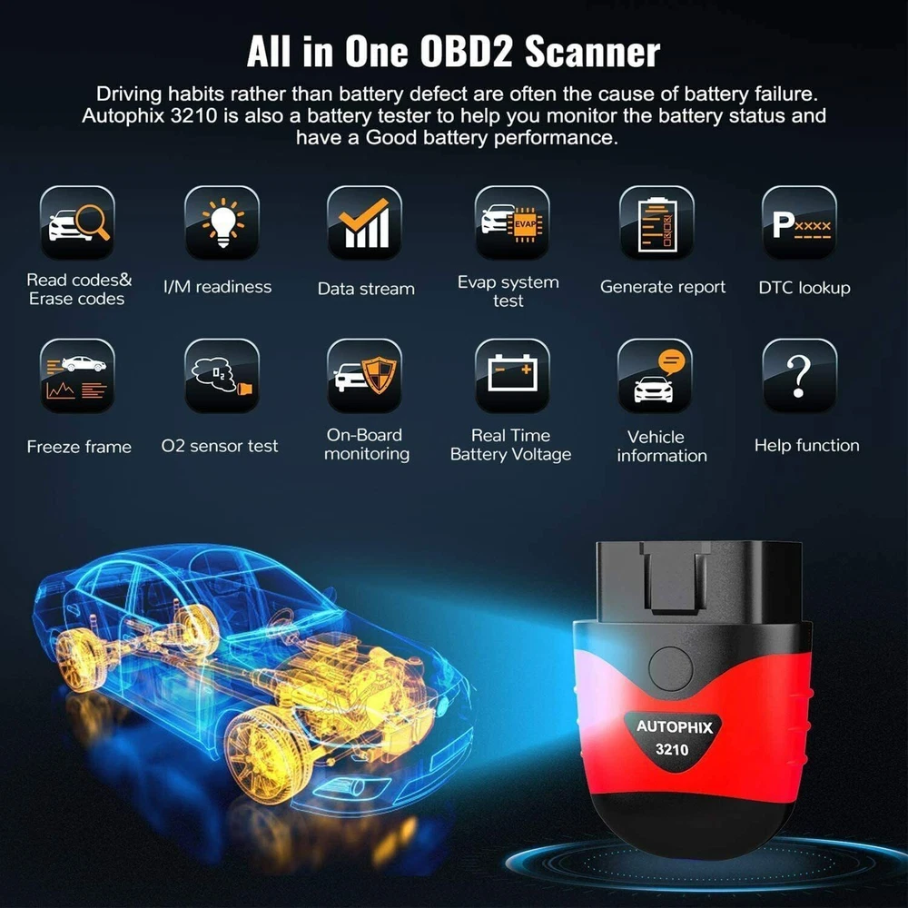 AUTOPHIX 3210 is a driving mate that communicates with vehicle terminal to complete fault diagnosis and driving assistance by smart phone or tablet, and it can support IOS device and Android device by Bluetooth 【Powerful Check Engine Light Diagnostics】 Can read and diagnose your check engine light, understand the severity of the issue, and clear fault codes in a blink of an eye. More functions compared to other simple scanner like I/M Readiness, Battery Health Check, Freeze frame, O2 sensor test, On-Board Monitoring, Evap system test, Performance Test, Data Stream, and Diagnostic reports, Handy google search button, Built-in OBD II Fault code look-up library. 【Necessary Battery Tester】 Have you ever noticed many other scanner tools without battery tester functionality, which costs you extra or more, However, AUTOPHIX 3210 can Check the health of your battery and voltage with a tap on your phone screen, so it is in great condition when you need it the most on a freezing winter day without opening the bonnet. 【 Key Point】 Don't just read vehicle malfunction codes and give you code definitions, but more importantly informs you what the possible problems are with your vehicle, even if you know absolutely nothing about cars. We are here to help you know the car troubles and clear the error code for saving money, so the understandable fault code definition is important for you. 【 Works on your car and your Language】 A necessary wireless/Bluetooth car diagnostic tool/fault code reader for today’s car owners, downloadable on both iPhone iOS, Ipad and Android and supporting major vehicle brands and models 1996 or newer. Works in English, German, Spanish, Finnish, French, Italian, Dutch, Portuguese and Chinese. 【Autophix --Repairing and Solution Consultant for your Car】 Proudly designed in the USA by Professional Engineers. Tested in 50+ local car dealers in the United States before Mass production. Autophix only does car scanning. We are professional for your cars. What does Autophix 3210 obd2 bluetooth scanner do? Read codes&Erase codes : Quickly read the error code in 3 seconds and clear pending error code, help you save time and money to fix it yourself if possible. Built-in OBD II Fault code look-up library : Instead of just giving you a cryptic description of what a trouble code means, we offer a lot more information on trouble codes Evap system test: Prevent gasoline vapor evaporated from the fuel tank of the car from being discharged into the atmosphere Data stream :Display various vehicle real-time parameters O2 sensor test : Detect the oxygen content in the mixture. Real Time Battery Voltage :Show the real-time voltage changes to monitor your battery health. Live Data : Show each data source as a Graph, Gauge, or Digital Display ; Customize the colors ; Resize and place in any arrangement. Important Vehicle Information : Vehicle specifications. Freeze Frame : Get a snapshot of the vehicle when a Freeze Frame Code was stored. I/M Readiness/Smog check : Determine if your vehicle is ready for an smog test. Mode 6 : Advanced test results (like misfire counts) for On-Board Diagnostic System Monitors. Available for testing Compatible with most USA vehicles after 1996, EU vehicles after 2002, French vehicles after 2004 and Asia vehicles after 2006 (Including CAN J1850PWM, J1850VPW, IS09141 and KWP2000 Protocols) Support some diesel-powered cars. For example, light-duty trucks, pickups and so on. On Jan 26, 2026 at 00:37:25 PST, seller added the following information: