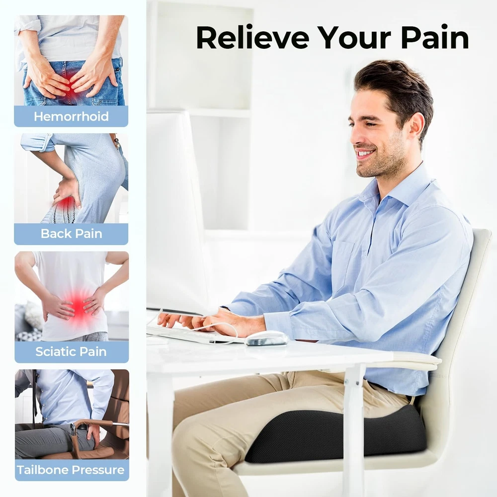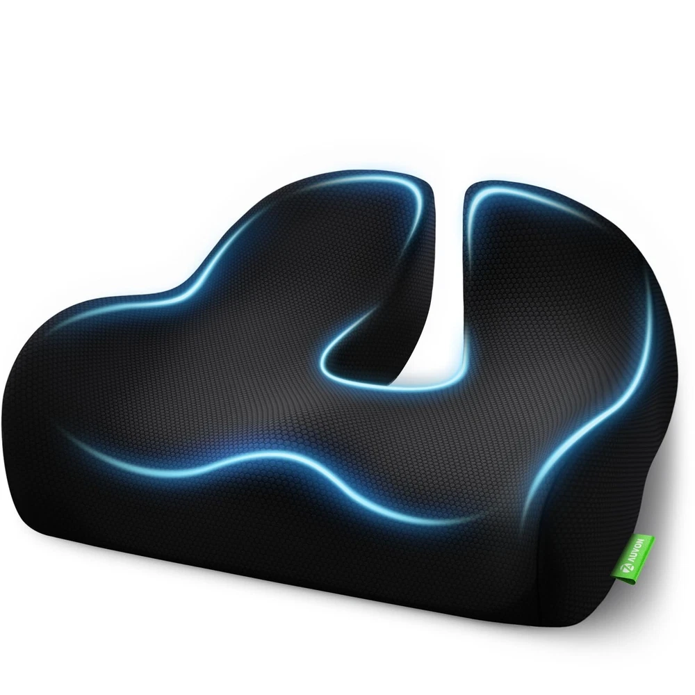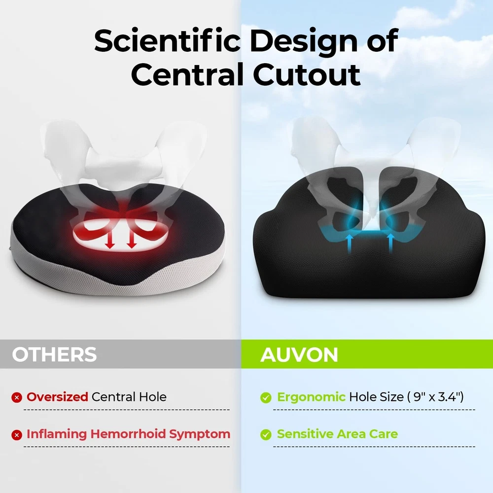 AUVON Enhanced Thick 4.7" Seat Cushions for Office Chairs, Hemorrhoid Pillow with Innovative Memory Foam for Balanced Support and Softness, Donut Pillow for Sciatica and Tailbone Pain Relief Product Details Brand: AUVON Special Feature: Lined Color: Black Size: 19''L x 16.7''W x 4.7''H Fill Material: Premium Memory Foam Brand: AUVON Special Feature: Lined Color: Black Size: 19''L x 16.7''W x 4.7''H Fill Material: Premium Memory Foam Shape: Wedge Age Range (Description): Adult Recommended Uses For Product: Sitting Use for: Whole Body Material: Memory Foam Item Firmness Description: Soft, Firm Number of Pieces: 1 Pattern: Solid Material Feature: Breathable Fabric Type: 100% Breathable Fabric Model Name: Cushion UPC: 195028003864 Manufacturer: AUVON Unit Count: 1.0 Count Package Dimensions: 17.68 x 6.81 x 5.83 inches Item Weight: 2.33 pounds Country of Origin: China Item model number: SH7762 Date First Available: June 24, 2024 Innovative Composite Materials for Balanced Support and Softness: AUVON's team conducted market research on seat cushions and discovered that users needed a balance of firm support and softness. As a result, the team innovated a chair cushion with a new combination of soft-cloud and extra support memory foam, achieving an ideal balance comfort. The soft memory foam conforms to your legs, while the support layer offers long-lasting support without flattening. 5 Scientific Areas for Contoured Relief: This office chair cushion is designed using ergonomic principles and features 5 scientific areas. The upward area provides contoured comfort for your buttocks, while the tailbone area includes a cutout for tailbone pressure relief. There is also a scientific hole for hemorrhoids to reduce compressive pain, a W-shape design to support your thighs and promote correct sitting posture, and a hip-wrap area to distribute sitting pressure evenly. Scientific Design of Central Hole: Unlike the traditional donut pillows with over large central holes, this hemorrhoid seat cushion is designed with a scientific central cutout of 3.4''L x 9''W based on anatomy for hemorrhoid relief. The seat pillow can accurately match the lower body structure by suspending the hemorrhoidal area to care for sensitive areas. Ergonomic designs can meet your real soothing needs of sitting. Breathable Fabric and Easy Maintenance: This sciatica pain relief pillow adopts quality and breathable honeycomb mesh fabric to ease the heat of prolonged sitting. The unique L-shape zipper can open larger for effortless disassembly to clean, keeping your sitting experience refreshing and comfortable. Seat in Comfort Every Time: It is troublesome to change a new chair, but it is easy to get a comfortable seat cushion. Get an AUVON ergonomic desk chair cushion and upgrade your seat now! The coccyx cushions (19''L x 17''W x 4.7''H) fit most office chairs, home seats, car seats, and airplane seats.