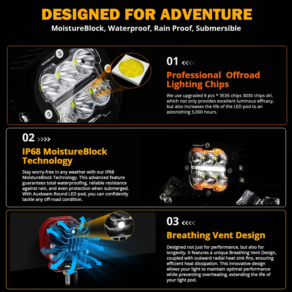 Waterproof Rate: IP68 Fitment 4: For Kenworth Peterbilt Lincoln Cadillac Oldsmobile Plymouth UPC: Does not apply Housing Color: Bright Black Shape Size: 3 inch Square Housing Material: Aluminum alloy Brand: AUXBEAM Wiring harness Relay: 12V Only,can be replaced with 24V Lamp Beads Model: 3535, 3030 SMD(white&amber) Fit Model: Universal most SUV Pickup UTV/ATV Motorcycles or else Fitment 3: For Mitsubishi Volvo Kia Land Rover Ford Jeep Fitment 10: For Offroad SUV UTV ATV RV Trailer Tractor Fitment 6: For Toyota Tundra Tacoma FJ Cruiser Hilux Prado gtin13: Does not apply Light Color: White&Amber Lens Material: PC Beam Pattern: Combo Light Type: LED Driving Pod Lights/LED Work Lights Fitment 1: For Can-Am Maverick X3 900 | Turbo / X RS / X DS / X MR / MAX Fitment 2: For BMW Chevy GMC Hyundai Mazda Mercedes-Benz Fitment 5: For Honda Toyota Nissan Dodge Luxus Acura Total Lumens: 9600LM(7200LM, DRL 1200LM, Turn 1200LM) Fitment 8: For Dodge Ford Chevy Cruze Sierra GMC Yukon Fitment 9: For Polaris RZR XP1K RZR1000 RZR900 Working Voltage: 10V-30V Life Time: 50000, hours Lighting Distance: 396M Color Temperature: 6500K&3000K Quantity: 2PCS Fitment 7: For Sport Utility 4WD 4X4 Mining Marine Car Excavator Power/Set: 84W(Spotlights 30W, White DRL 6W, Amber Light 6W)*2