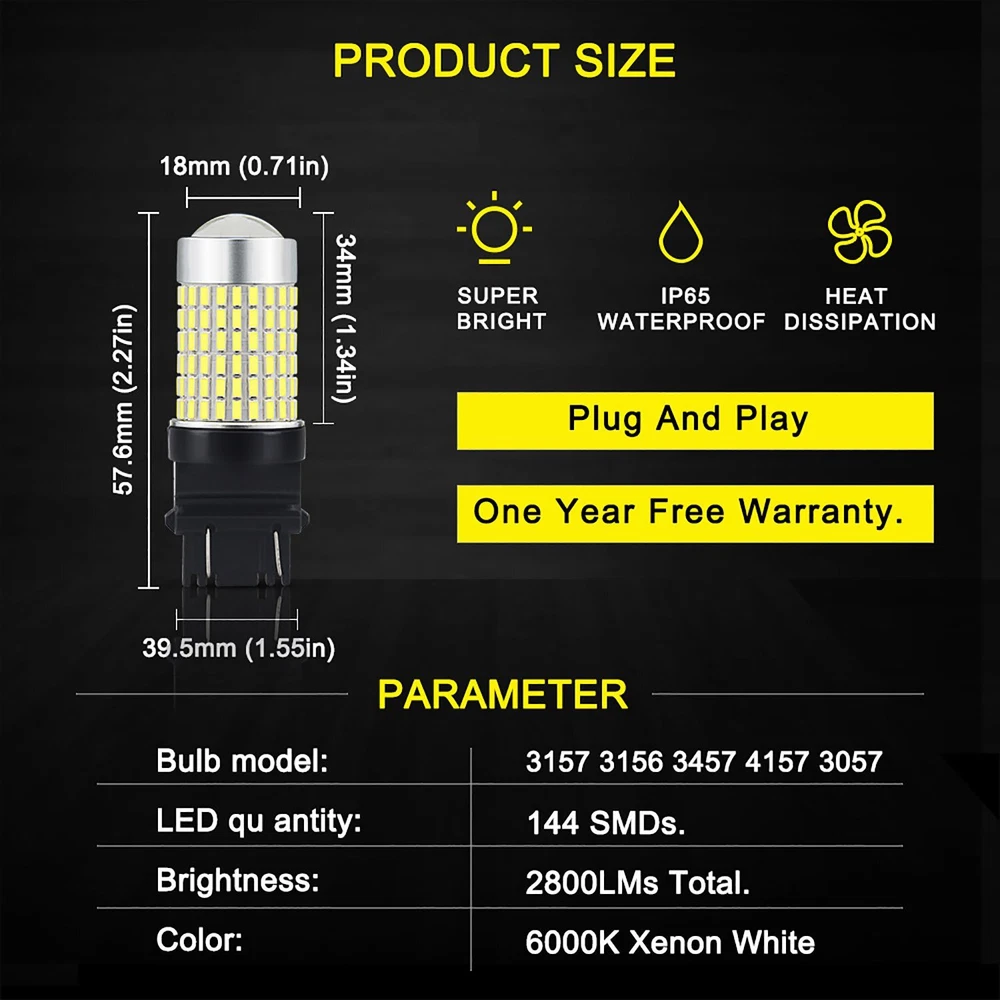 The compatible vehicle lists is only partial lists,no fully included due o Ebay listing compatible vehicles limitation. IF your car plug is 3157 3156,the item is fit your car AUXITO 2x144-SMD 3156 3056 White 2800lm Bright Super LED Reverse Backup Light The compatible vehicle lists is only partial lists,no fully included due o Ebay listing compatible vehicles limitation. IF your car plug is 3157 3156,the item is fit your car About this item 1. Good light type, the position of the light-emitting point is close to the original car halogen lamp 2.No delay to light up, low power consumption and high lighting,Good Quality And Durable,Easy to Install,Good Feel. 3.With High-purity brightness, strong penetrability and superior stability 4.360 degree light, 3014 SMD emit 360 degree light can light up every corner 5.This listing features one pair ( 2 pieces) extremely bright high power 6000K white LED Lights bulbs as car Backup Light/Daytime Running Light/Brake Light/Turn signal Light 6. It is perfect for customers who are looking for Extremely Bright output. Specifications: Model: 3 157 / 3156 LED Chip: With 3014 SMD Lamp beads: 144 H Lumen: 1400Lm/per bulb, 2800LM/per Set Color Temperature:6000K Xenon White Work Voltage(V):DC 12V Lifetime:More than 30000 hours Waterproof Level:IP65 Viewing Angle(θ):360° Certified by:CE & ROHs Warranty:1 year Canbus: NO Material:Aluminum+High Quality Plastic Placement on Vehicle:Front,Rear,Left, Right Applications: backup reverse light, tail light, brake light, turn signal light, daytime running light, parking light, side marker light, etc. Cross Reference: 3156, 3056, 3356, 3456, 4156, 3157, 3047, 3057, 3357, 3457, 3757, 4157, 4114, 4157NA, 3157A, T25, etc. Suitable For Pickup, Wagon, UTB, Cab, ATV, SUV, Jeep, Truck, Bus etc. Package include : 2x 3157 3156 LED Light Complete Error Free for most vehicles . For some vehicles, it may require install decoder or load resistor to avoid turn signal hyper flash or fast blinking. Item Specifics Brand AUXITO Manufacturer Part Number Does Not Apply Interchange Part Number 3457 3757 4057 4111 4157NA 3457A 3157A 3157LL Other Part Number Halogen turn signal back up brake tail bulb lamps Placement on Vehicle Front Rear Left Right Manufacturer Warranty Yes FAQ ♥ If you have a decoding problem or any other problems, please contact us first, we will help you with it. We will reply you within 24 hours in working days. I'm a new seller, thanks a lot for your trust and convince! I will serve you with all my heart. ♥ Q1: Will this bulb fit my vehicle? A: We can match almost any vehicle to one of our bulb sizes. eBay only lets us include some vehicle fitments per listing, but if your vehicle does not show up on the compatibility table at the top of our listings, welcome you to contact us for free consulation before purchasing a product. Q2: My item has not arrived, what's taking so long? A: Sometimes items take longer than expected, especially if it’s going far or to rural area. Check with your post office to see if your item has been held up. Sometimes Royal Mail will not update a tracking number until it has arrived at its destination. If your item still don't arrive after a few days, let us know so we can double check for you and help solve it asap. Q3: My bulbs won't fit, help! A: Special bulb holder may be required. See if you can take the holder from the stock bulb. If not, let us know. The bulb size may be wrong, double check the item you received with the item you ordered. Do you have an aftermarket lighting housing? These may not be perfectly fitted for aftermarket bulbs and will require some manual modifications. Q4: Neither side lighting up? Both sides flicker, hyper flash, or work inconsistantly. A:Check the light fuses, and then check the ballast plugs to insure correct installation. If this doesn't work, there may be a voltage problem with the vehicle. You probably just need a relay or capacitor. Even though some bulbs are builtin resistors, they may still need a decoder. Pay & Ship (1). We gladly accepts payment via PayPal, We will ship your item(s) within 24 hours. (2). Before payment, please keep the consistency of Paypal address and ebay address. (3). Quantity orders are welcome! Returns (1). We offer 60 days free return policy. Please contact us within 60 days from the date you receive your order if you have any issues with the product or want return. Refund will be send after we got your resend package. (2). All returned items should be in the original packaging , return tracking information should be provided . Contact Us (1).Negative feedback will not help resolve any problems you have, please contact us via eBay messages before leaving negative feedback , our customer service will make best effort to help you with the issues. (2).We maintain high standards of excellenceand strive for 100% customer satisfaction! Feedback is very important to us. We request that you contact us immediately before you give us neutral or negative feedback, so that we can satisfactorily address your concerns. About us We're professional in car and motorcycle accessories, especially in LED bulbs. We have our own factory and R&D team. Our belief is to sell top quality items that fit your car and serve you with our heart. Anything please feel free to contact us! Our customer service is very responsibility. Come and follow us! DESCRIPTION NEW ARRIVED HOT SALE CONTACT US SAVE US Store Category Store Home Other Hot Item RGB LED Car Neon Light Chassis Atmosphere Lamp Kit For Honda Nissan Subaru Audi USD 31.34 5Pcs FORD F350 F150 For F250 Roof Top 1973-1997 Cab Lights Marker Amber Lights USD 27.54 LED License Plate Tag Lights For 2014-18 Chevy Silverado GMC Sierra 6000K White USD 14.89 LED License Plate Light For 88-00 Chevy C/K 1500 2500 3500 BRIGHT WHITE Tag Lamp USD 13.99 1000pcs Headliner Star Light kit Roof Twinkle Ceiling Light Optic Fiber Home Car USD 72.99 New List Item AUXITO 2X 9005 LED Headlight Bulbs High Beam for Dodge Ram