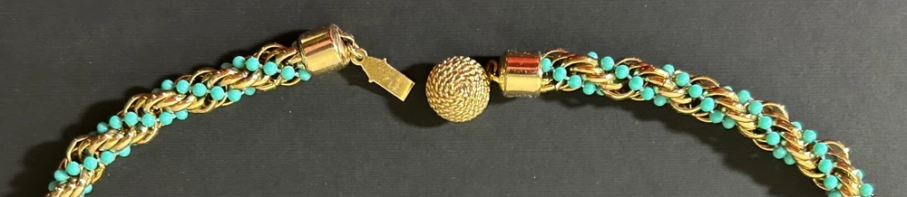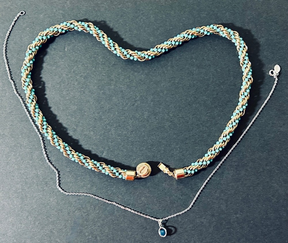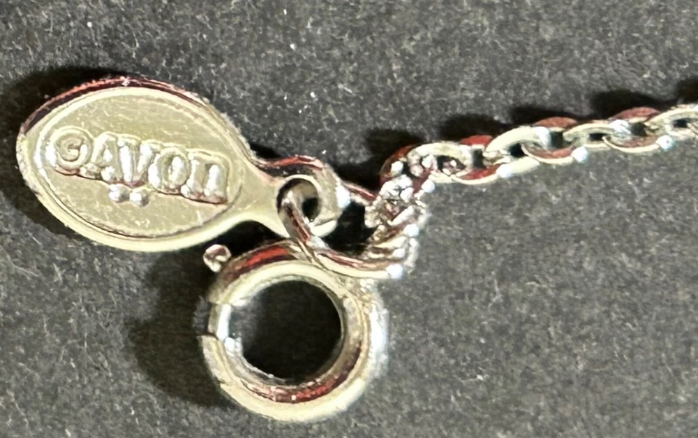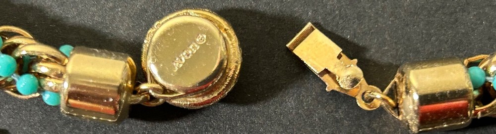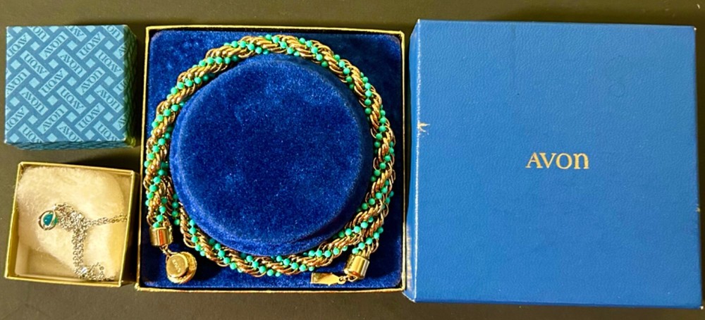 2 AVON Necklaces, 20" Golden Rope Twist Faux Turquoise, Sliver 16" Chain, Boxes For your consideration are two AVON necklaces, one with a 20" golden rope twist design with faux turquoise accents, and the other is a thin 16" silver chain that has a very small pendant. Both necklaces are signed by Avon and are from the 1970s era. They have the original boxes.The vintage pieces are in a classic style, perfect for adding a touch of retro charm to any outfit. The necklaces are a timeless addition to any jewelry collection. As always, your satisfaction is guaranteed.