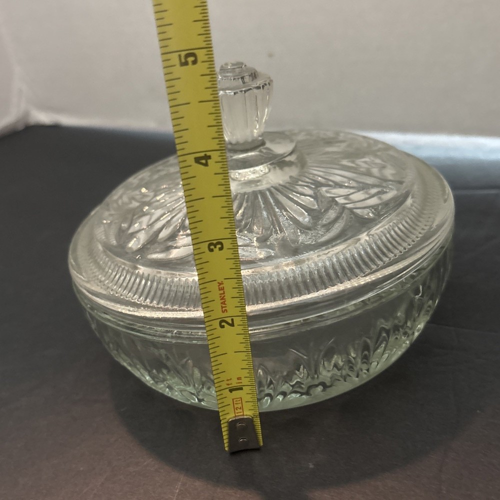 The AVON Clear Pressed Glass Covered Candy Dish is a vintage decorative collectible that showcases a Victorian style design. Made of clear pressed glass, this candy dish features a cover that adds to its charm. Ideal for storing candy or trinkets, this original Avon piece is a unique and elegant addition to any home decor collection. There is a little rough spot. See photo.