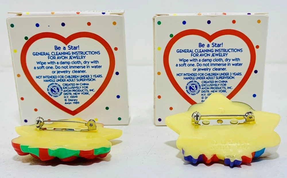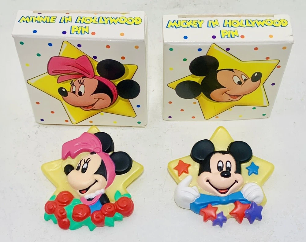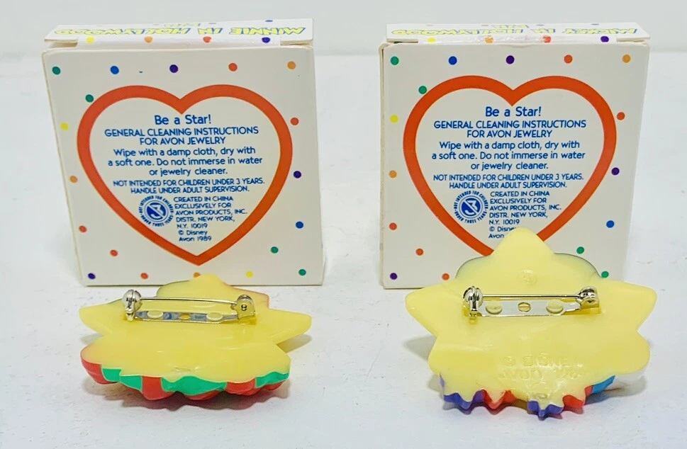 Add a touch of Disney magic to your lapel with this AVON Mickey + Minnie Mouse in Hollywood Lapel Pins set from 1989. These Walt Disney resin buttons feature the iconic duo in a Hollywood theme, perfect for any Disney fan. The pins are new in original box and ready to be added to your collection.