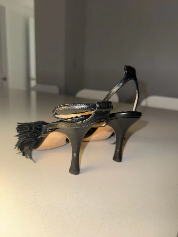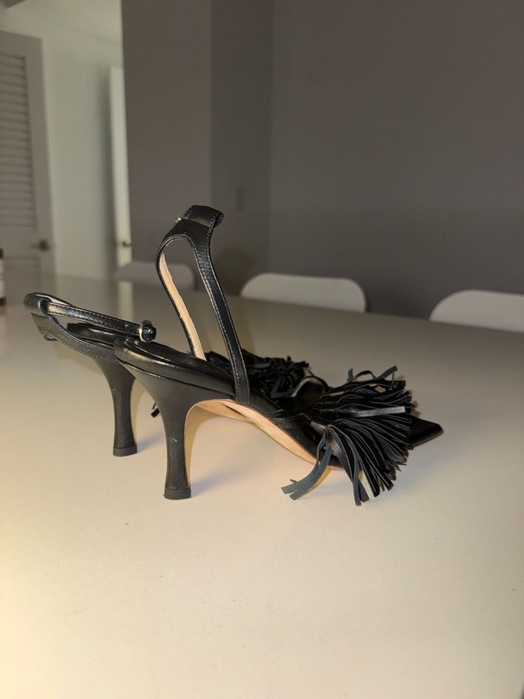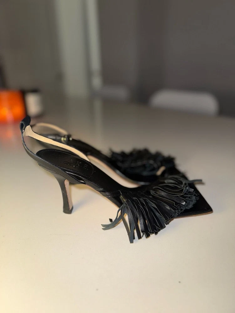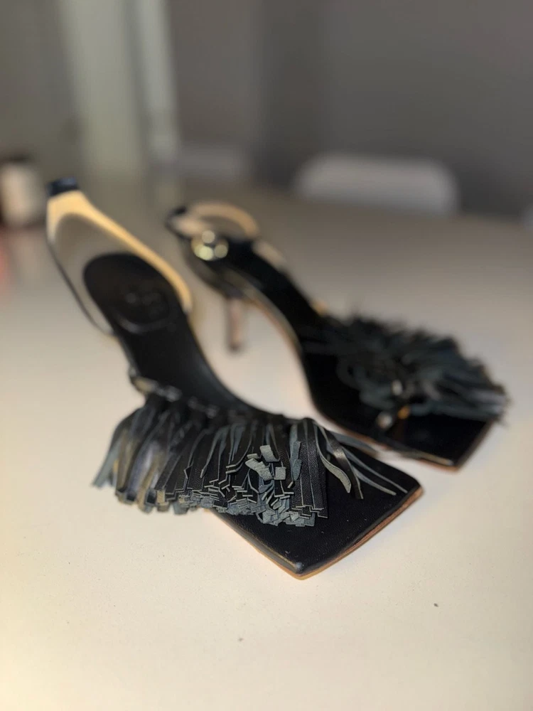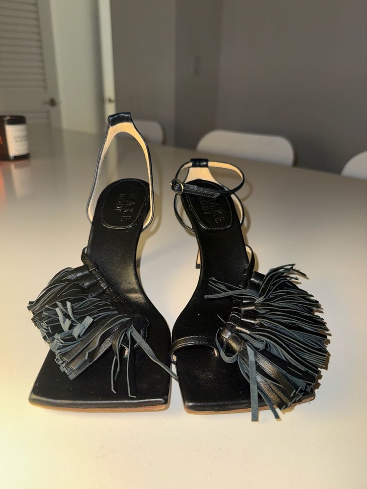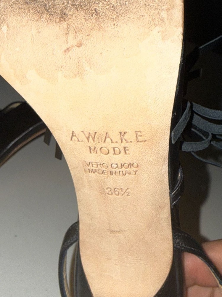 Missing ankle strap buckle on one shoe!!! A.W.A.K.E. MODE Delta Black Tassel High Heel Sandals. These avant-garde heels feature a striking square toe aesthetic with voluminous leather fringe/tassel detailing across the front strap. Crafted with an adjustable ankle buckle closure and a slim architectural high heel. Missing ankle strap buckle on one shoe. These are constructed from high-quality leather (Vero Cuoio) and were expertly made in Italy. Stylish and statement-making for evening wear or special occasions. Condition: Good pre-owned condition. Shows some light scuffs on the back of the heels and general wear on the soles as pictured. Tassels remain intact and lush.