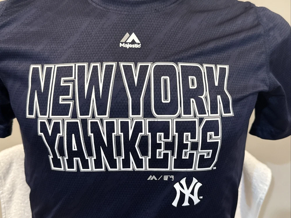 You are purchasing a very nice New York Yankees short sleeved shirt. Shirt is a youth size large 14-16. Shirt has small Yankees NY logo and New York Yankees lettering screen printed on front. Shirt has nothing on back side. Shirt is dark blue in color. Shirt is 100% thin, light weight polyester. Made by Majestic. Shirt is like new, never worn condition. Very nice shirt for your younger Yankee fan Buyer pays $5.00 shipping. Shipping combined whenever possible. Thanks for your business! Please check out my store for other great items!!