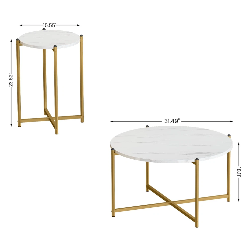 【Upgrade your Life】Comes with a marble finish round coffee table and two round end table that bring a more high class feeling to your house, this modern living room round table set is practical but also creates a strong modern atmosphere. 【Premium Quality】The coffee and end table sets was maded of MDF and metal legs, the soomth surface is waterproof, scratch resistant,and the metal base support ensure its sturdy. 【Sturdy and Safe】This round coffee tables with a X base structure, which ensures stability ,four adjustable metal feet pads also well prevent scratching your floor. With the smooth surface and round corners, you won’t be injured when bumping up. 【Multipurpose】Use this 3-piece table set individually or together both are the perfect choice.The coffee table was ideal for teatime,while the 2 small tables can be used as nightstand and sofa table, which is perfect for magazines or display green plants and bold decorations. 【Easy to Assemble】Smooth marble tabletop which is make it easy to clean and just will take you around 10mins to put together,instructions and accessories are all included in the package. Coffee table :31.4"Dia x18.1"H; 2 Side tables: 15.5"Dia x 23.6"H