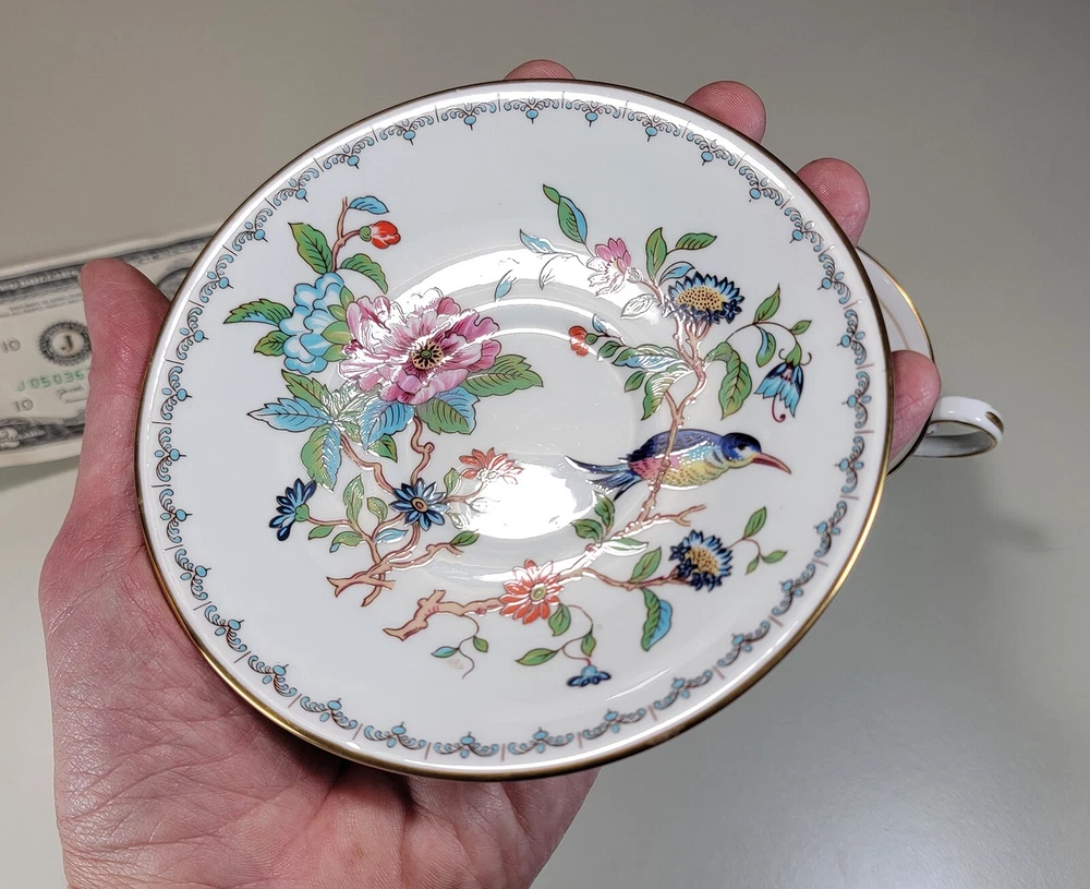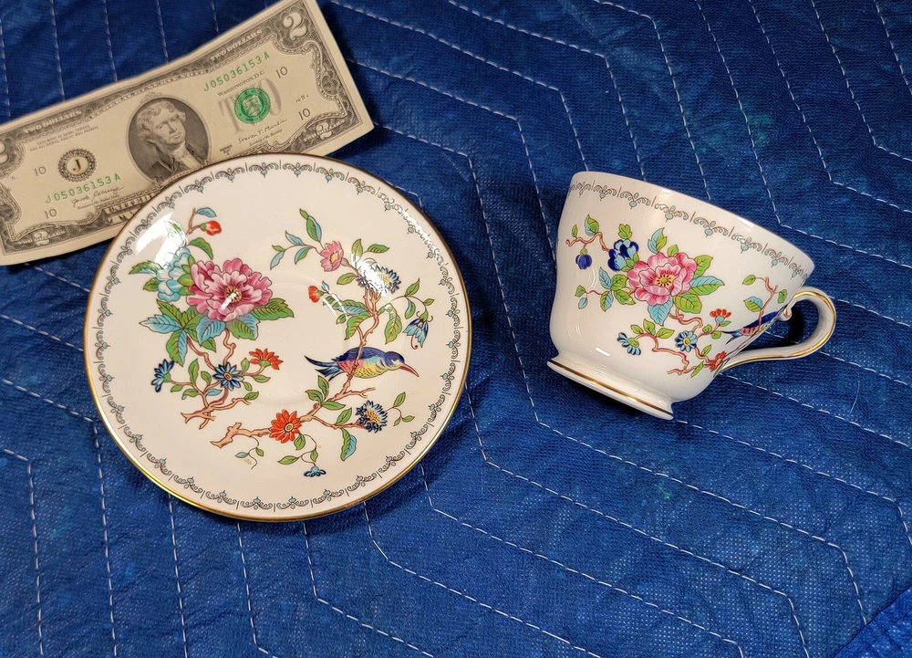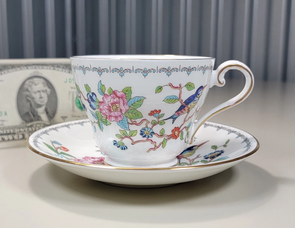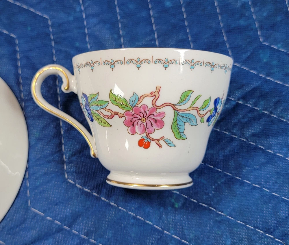 AYNSLEY Pembroke (Gold Trim) Cup & Saucer DIMENSIONS: Saucer: 5 1/2" diam. Cup: 2 1/2" tall x 4 1/4" x 3 1/4". Total weight: 10 ounces. DESCRIPTION: 1 vintage cup and saucer. By AYNSLEY. Pattern: Pembroke. Bone china. Multicolored birds and flowers on white with gold rim accent. Back stamp: green crown mark "Aynsley - Est. 1775 - Made in England - Fine English Bone China"; "Pembroke - Reproduction of an Eighteenth Century Aynsley design". 1985-2015. CONDITION: Excellent gently used condition. No damage and no significant wear. No restoration. Condition is consistent with seldom gentle use and careful handling. Most of these pieces appear unused or barely used. No nicks, fleabites, chips, cracks. No significant scratches or rubs. No crazing. No residues, scale, stains or discolorations. No wear to the floral decoration. Clean, bright, shiny. On very close inspection in glancing light you may detect some very light, typical use-related surface wear which may include: scattered small utensil scratches to the glaze; scattered minute wear to the gold rim accent. Nothing at all significant or conspicuous.