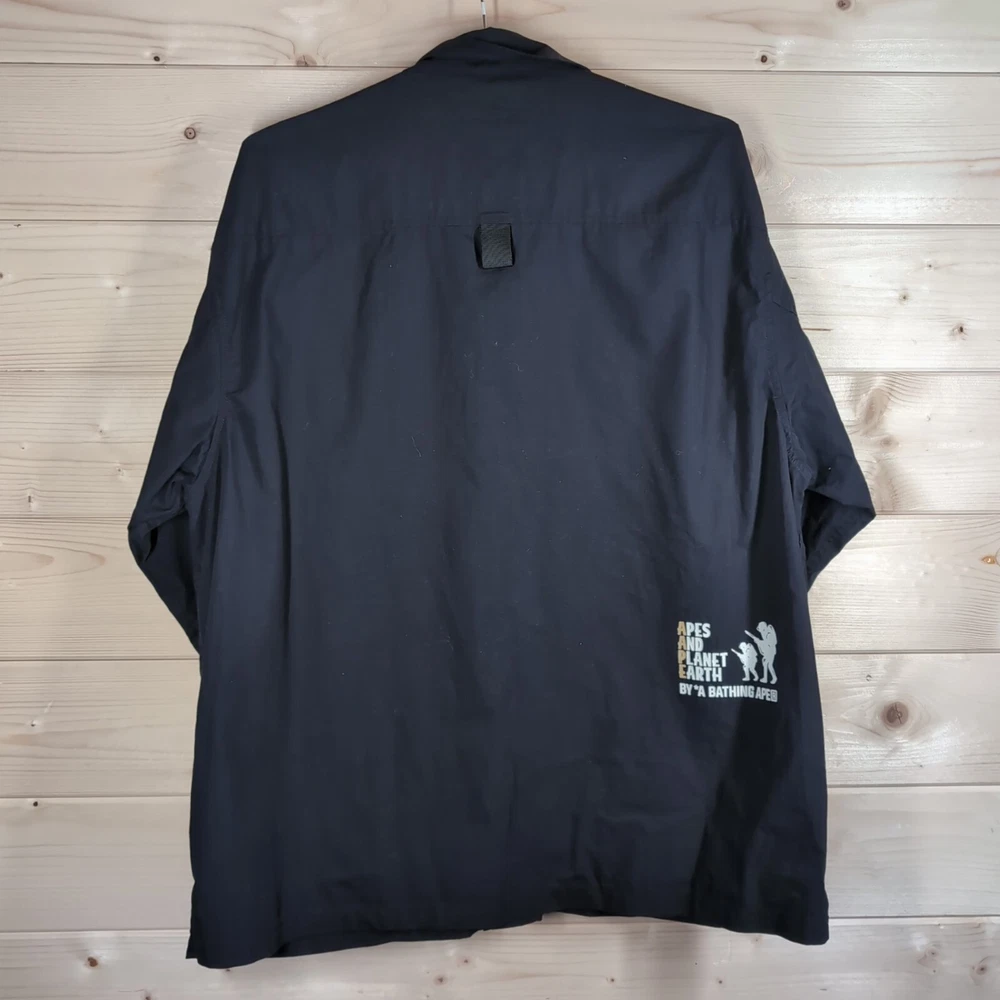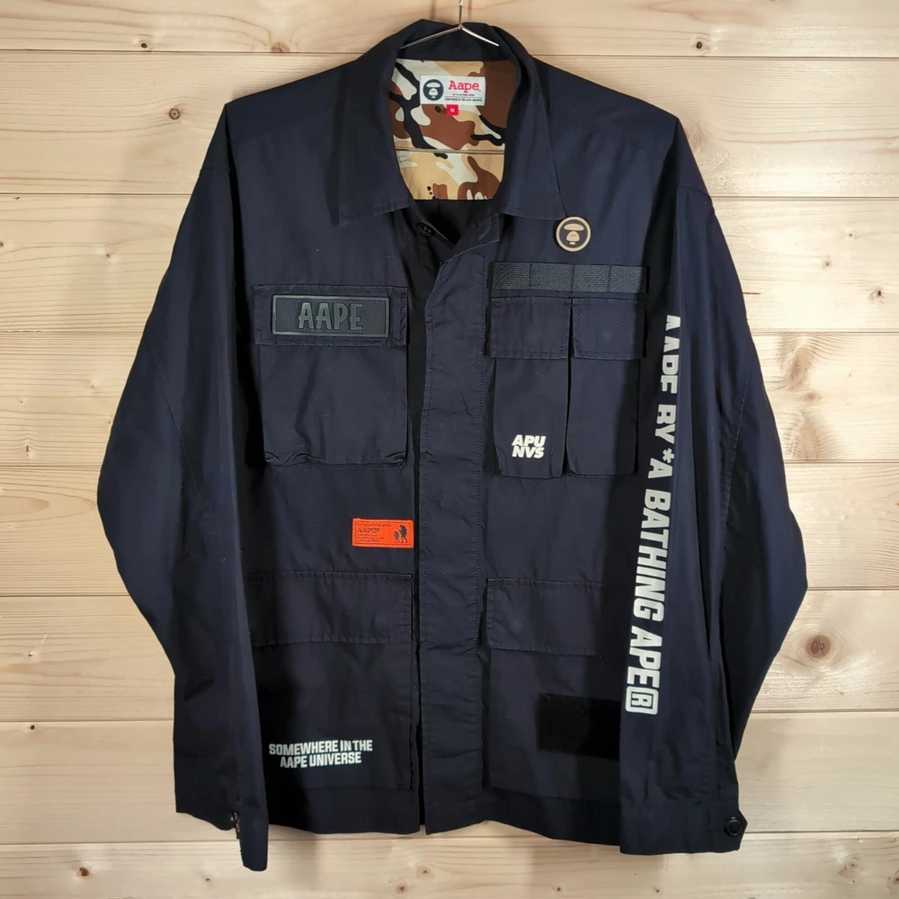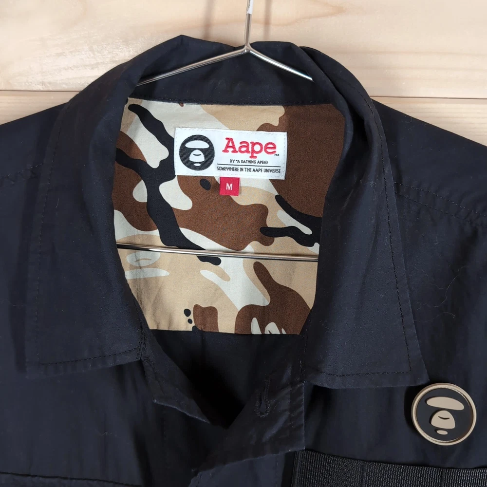 Aape By A Bathing Ape M65 Black Utility Military Shirt Jacket Overshirt Mens Size Large Pit to pit 23.5" | Length 28.5" In great preloved condition ------------------------------------------------------------------------------------------------------ For SS20, AAPE by A Bathing Ape looks to military garments for inspiration, creating cool pieces like this M65 jacket. Reworking the classic combat silhouette, it’s cut from sleek black cotton canvas and then detailed with a bevy of branding – think prints, woven tabs and insignia-style patches. 100% Cotton Button Closure 3 Chest Pockets 2 Front Pockets Printed Branding Woven Brand Patch & Tab Style Code: AAPSTM8341XXE-BKX