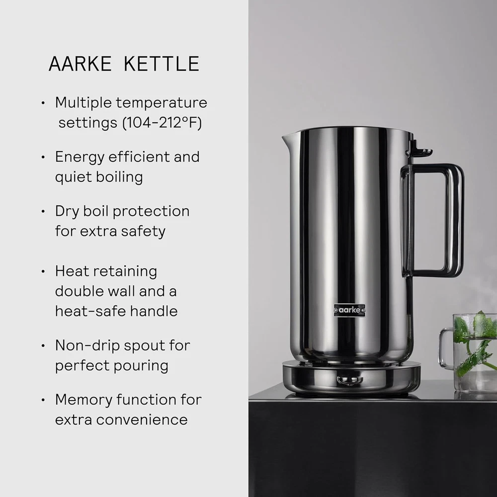 Store New Arrivals Add to Favorite View Feedback Contact Aarke Stainless Steel Kettle - Perfect for Coffee and Tea Maker Enthusiasts, Non-Drip Spout, Double-Wall Construction, Dry Boil Protection, Heat-Safe Handle, LED Cool-Down Indicator, 1.2L (Steel) Description Item model number A1244 Product Dimensions 5.5"L x 7.5"W x 10.6"H Capacity 1.2 Liters Color Steel Special Feature Manual Wattage 1500 watts Material Polypropylene (PP), Silicone, Stainless Steel Item Weight 5.52 pounds Model Name Kettle Package Information Pitcher Finish Type Steel Brand aarke Product Care Instructions Hand Wash Manufacturer Aarke AB Premium Build: Crafted from durable stainless steel with a heat-safe handle for comfortable and safe handling, ensuring long-lasting performance and reliability Variable Capacity: Boils between 16.9 fl. oz. to 40.5 fl. oz., offering a total volume of 1.2L / 40.6 fl. oz Temperature Customization: Enjoy multiple temperature hot water dispenser settings ranging from 104° to 212°F, allowing you to achieve the ideal temperature for various beverages, with each setting clearly indicated by an LED cool-down indicator Precision Pouring: Designed with a non-drip spout and heat-retaining double-wall construction, enabling mess-free pouring and prolonged heat retention to keep your water at the desired temperature for longer. Equipped with dry boil protection, automatically shutting off to prevent accidents when water levels are insufficient Dimensions: Height: 10.62 in, Width (including handle): 7.48 in, Diameter: 5.51 in, Weight: 3.52 lbs Product description The video showcases the product in use. The video guides you through product setup. The video compares multiple products. The video shows the product being unpacked. Aarke Stainless Steel Kettle Merchant Video ABOUT US We offer the best prices around on high quality products. Our E-store includes media such as books, movies, music and games while offering electronics, toys, sporting apparel, clothing, tools, general home, garden items and more. SHIPPING We are always working hard to ensure your package arrives as soon as possible. Please understand that some factors like weather, high postal traffic, and the performance of shipping companies are outside of our control. RETURNS We offer a 30-Day Return Policy on items which you are not completely satisfied with. You have the option for a full-refund or an exchange of the item. No returns are available on items shipped outside of the USA. PAYMENT We accept PayPal. CONTACT US This page content is yet to come Please ad us to your favorite seller and visit again later Thank You CUSTOMER SATISFACTION We try our very best to make sure every customer is completely satisfied. If there's a problem, message us! We're happy to help. WE ACCEPT Copyright © 2021 AutoDS. | All Rights Reserved