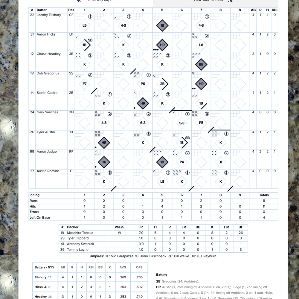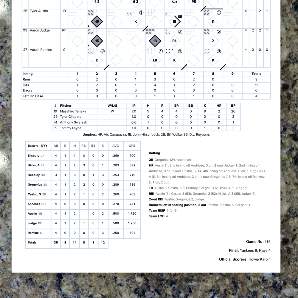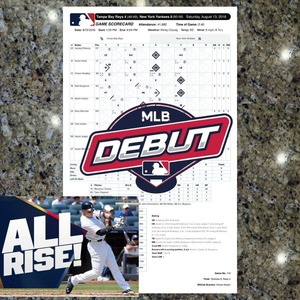 Gameday Media / Broadcast / Press / Team Game Sheet Lineup Card Item: Aaron Judge MLB Debut Date: August 13, 2016 Size: 8.5"x14" Teams: Yankees vs Rays Judge made his MLB debut on August 13, 2016, starting in right field against the Tampa Bay Rays. Hit a home run in his first at bat! Tyler Austin had done so on the at bat before.This marked the first time that two teammates hit home runs in their first MLB career at-bats in the same game. A piece of history! For the game day for the press, broadcasters and teams. Smoke and pet free home.