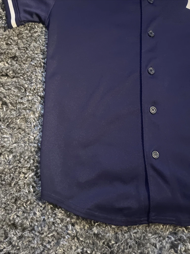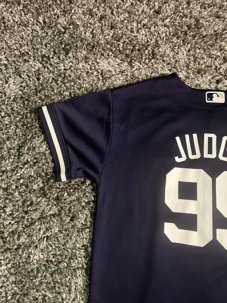 Show your love for the New York Yankees and Aaron Judge with this officially licensed Majestic button-down jersey. The blue jersey features Judge's number 99 and is perfect for any young fan in size L 14/16. Made in Cambodia, this unisex children's jersey is perfect for baseball enthusiasts who want to represent their favorite team during regular season games. Get ready to cheer on the Yankees and Aaron Judge with this stylish and comfortable jersey.