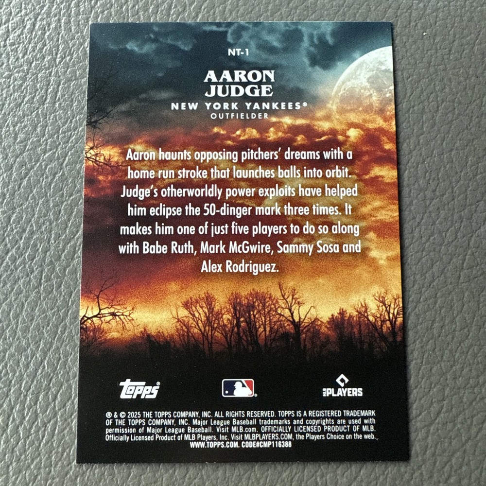The product is a 2025 Topps Update Night Terrors Pink Foil SP trading card featuring Aaron Judge of the New York Yankees. This card is part of an insert set called Night Terrors and has a card thickness of 20 Pt. It is a standard size MLB trading card made of card stock and is in near mint or better condition. The card is a short print with a pink foil parallel variety, making it a unique and sought-after collectible item for baseball fans and card enthusiasts alike.