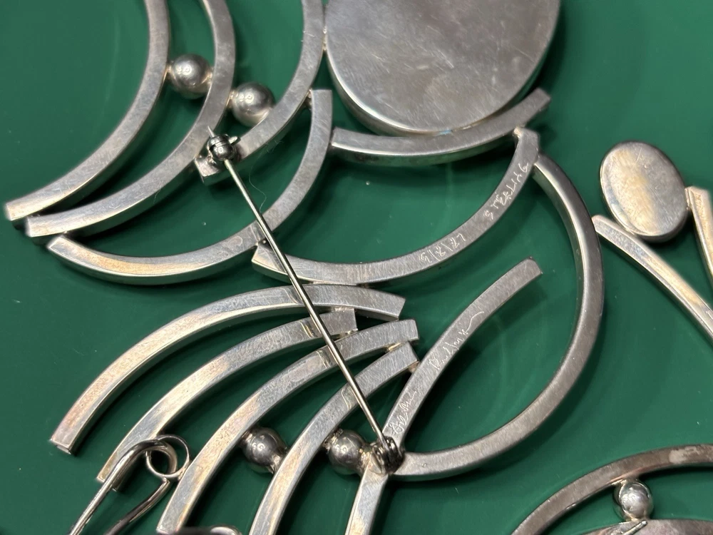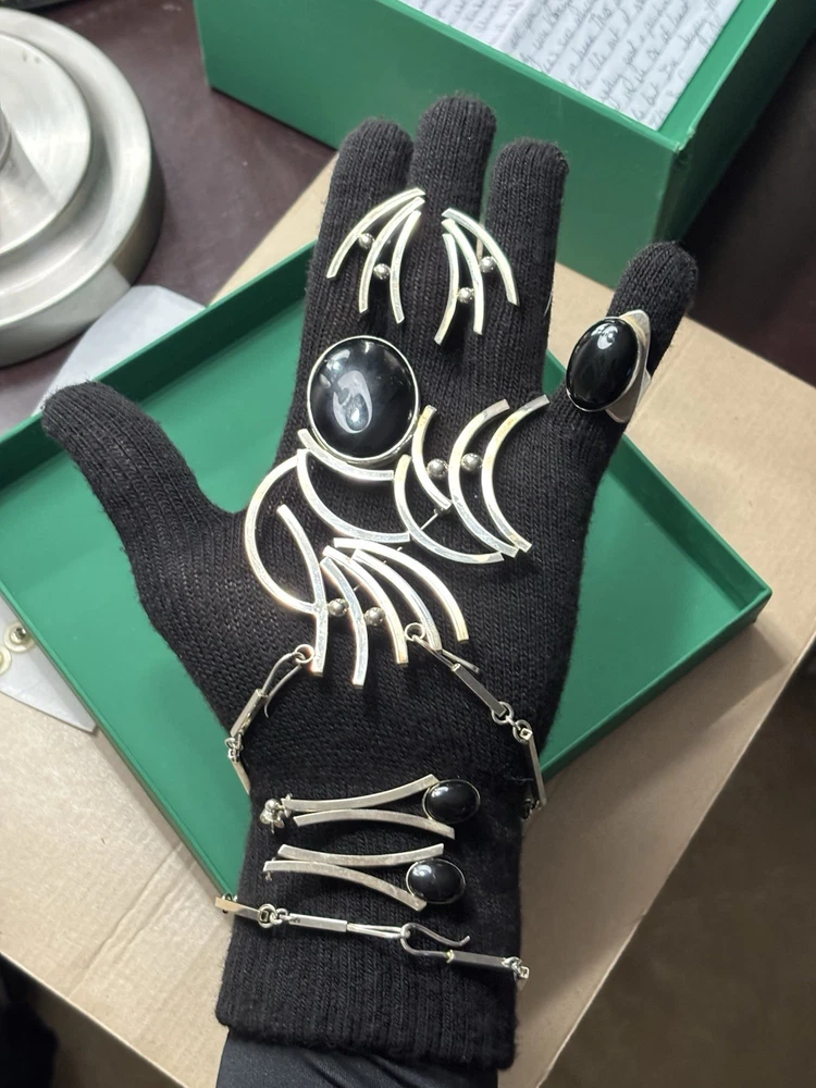 Aaron Rubinstein Sterling Silver Onyx Collection - Sterling Silver Pendant NECKLACE with an etched signature Aaron Rubinstein and is dated. -Black Onyx handcrafted sculptural sterling silver adjustable RING features a freeform black onyx cabochon (18 mm x 13 mm) -Pair of beautiful dangle EARRINGS created from sterling silver and Onyx. -Additional Pair of Modernest EARRINGS with artist etched initials. -Also included extension links for pendant. AS-PICTURED 🔹PRIVATE COLLECTION