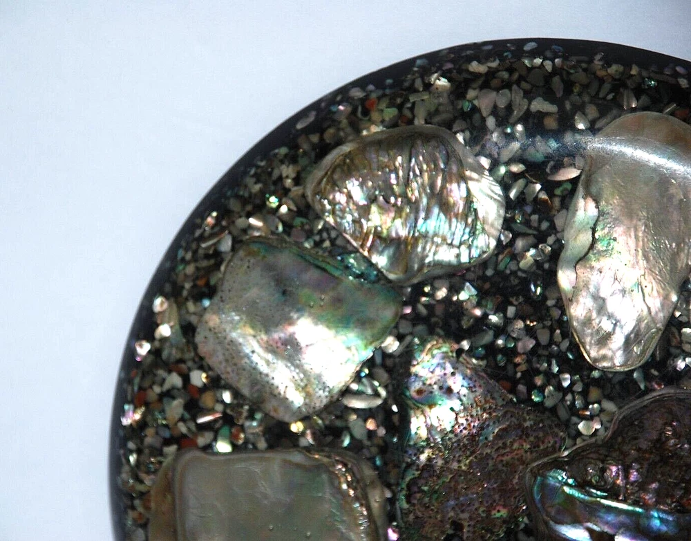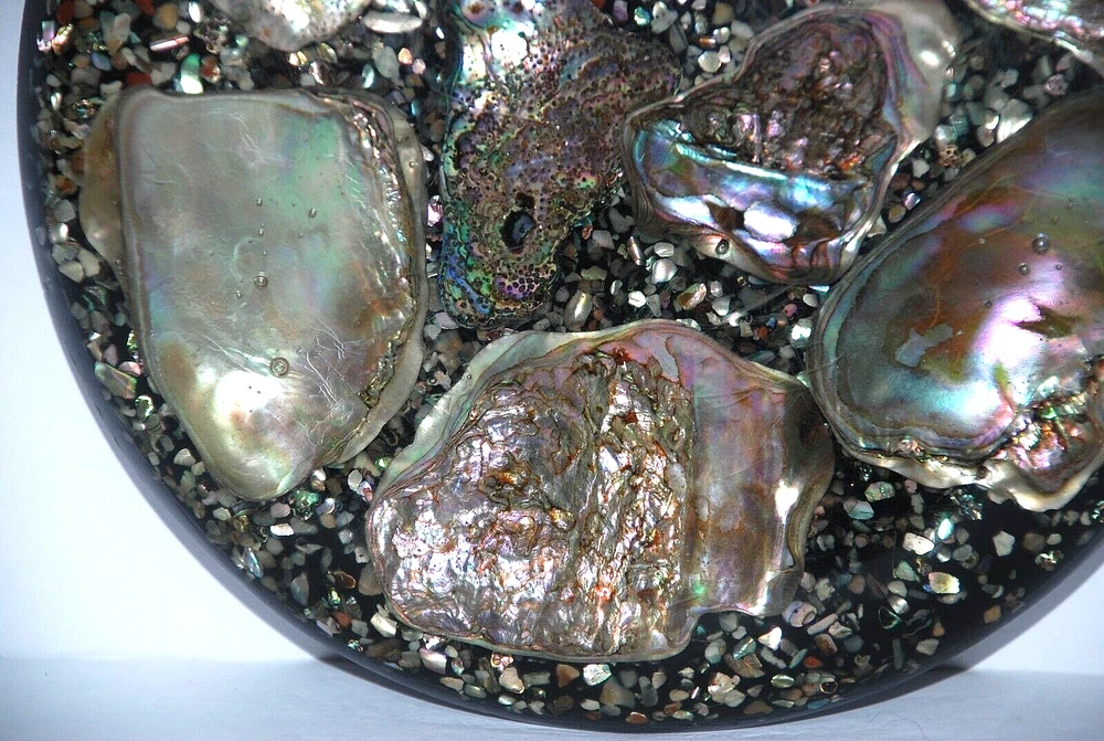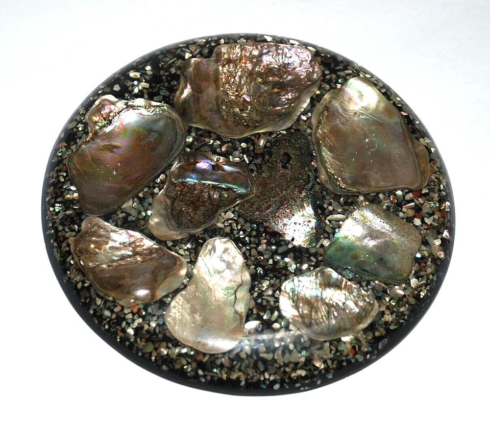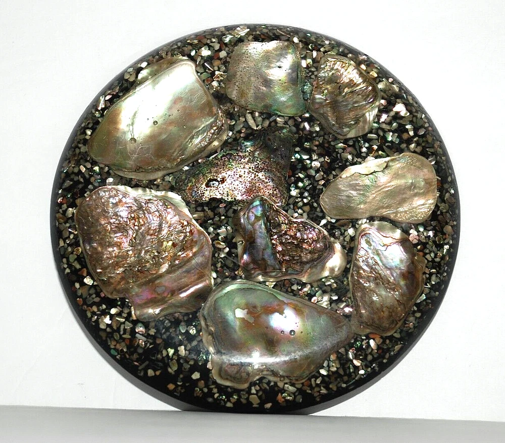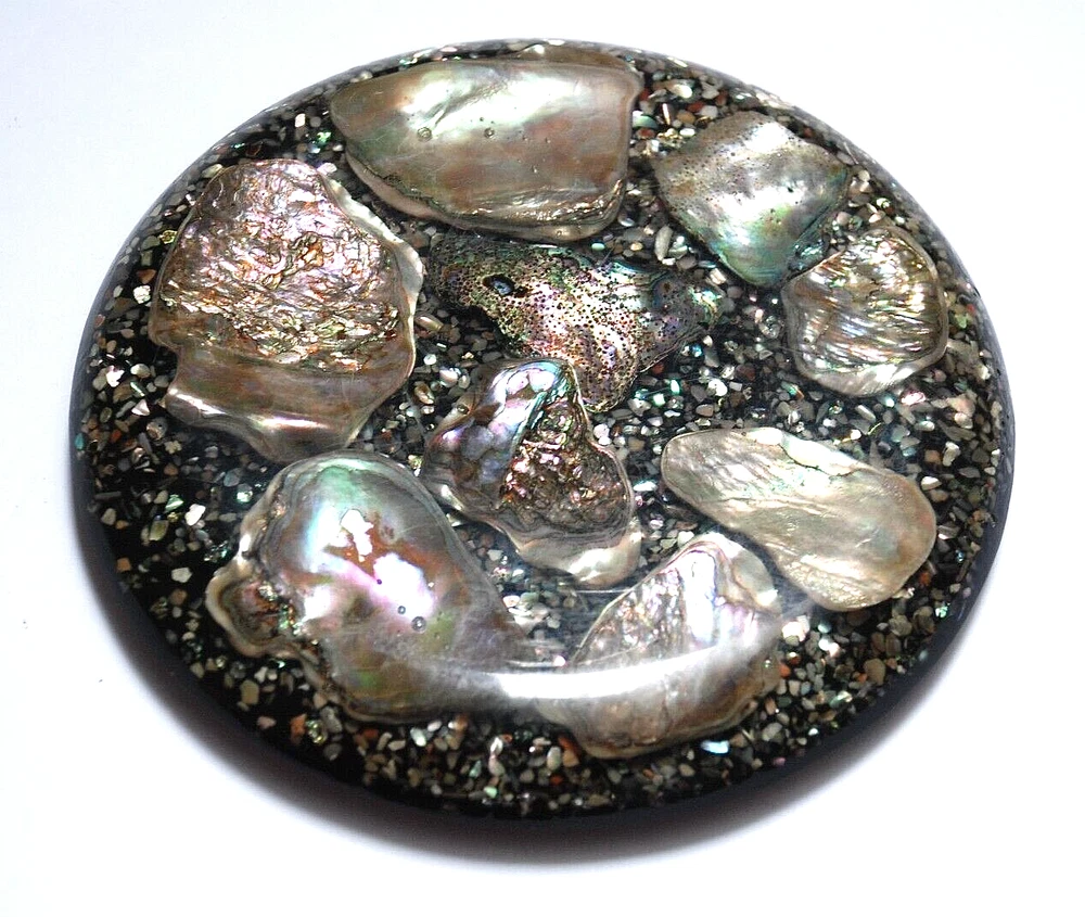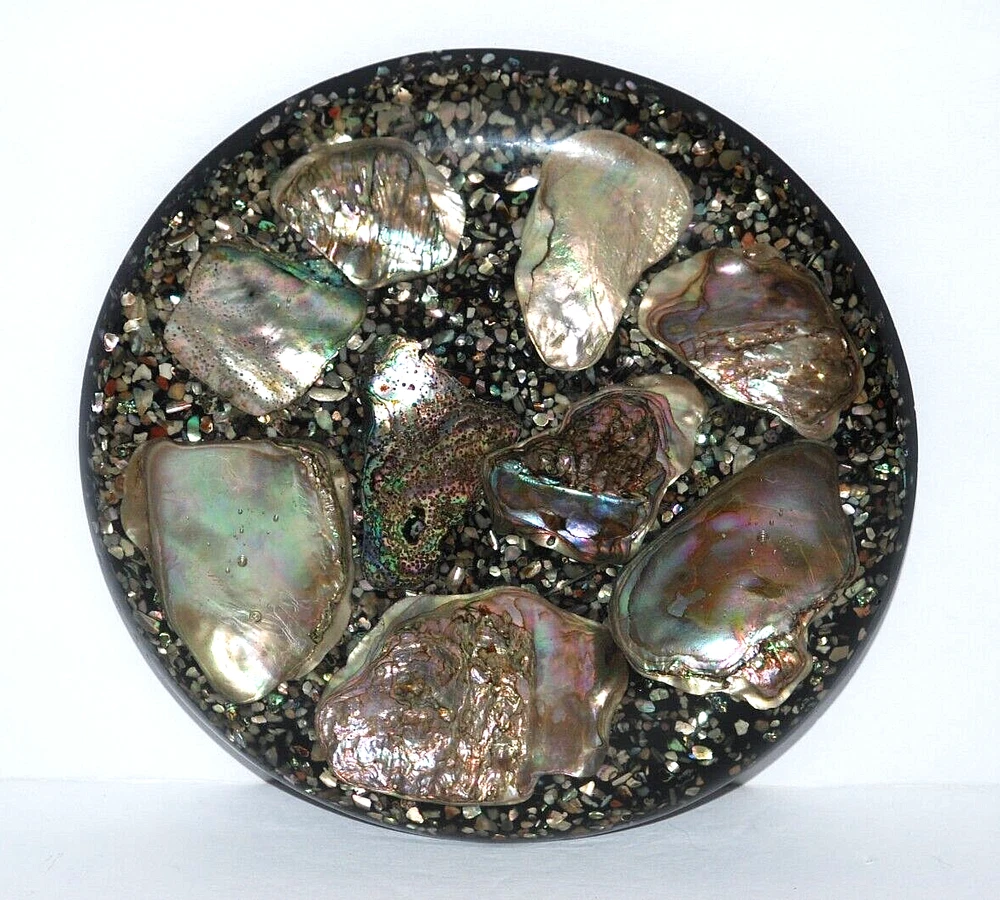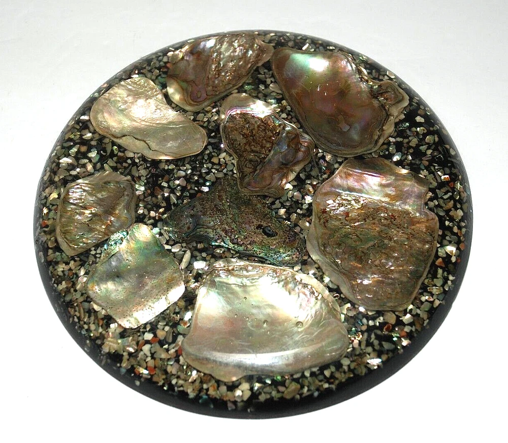 Vintage Abalone Seashell Resin Lucite Acrylic Trivet Hot Plate Coaster Footed 6 5/8" USA. Design Gifts International . The trivet measures 6 5/8" in diameter round . It's in excellent pre owned condition with no chips or cracks. The colors are beautiful. Three age light spots on the back but overall, it isn't bad.