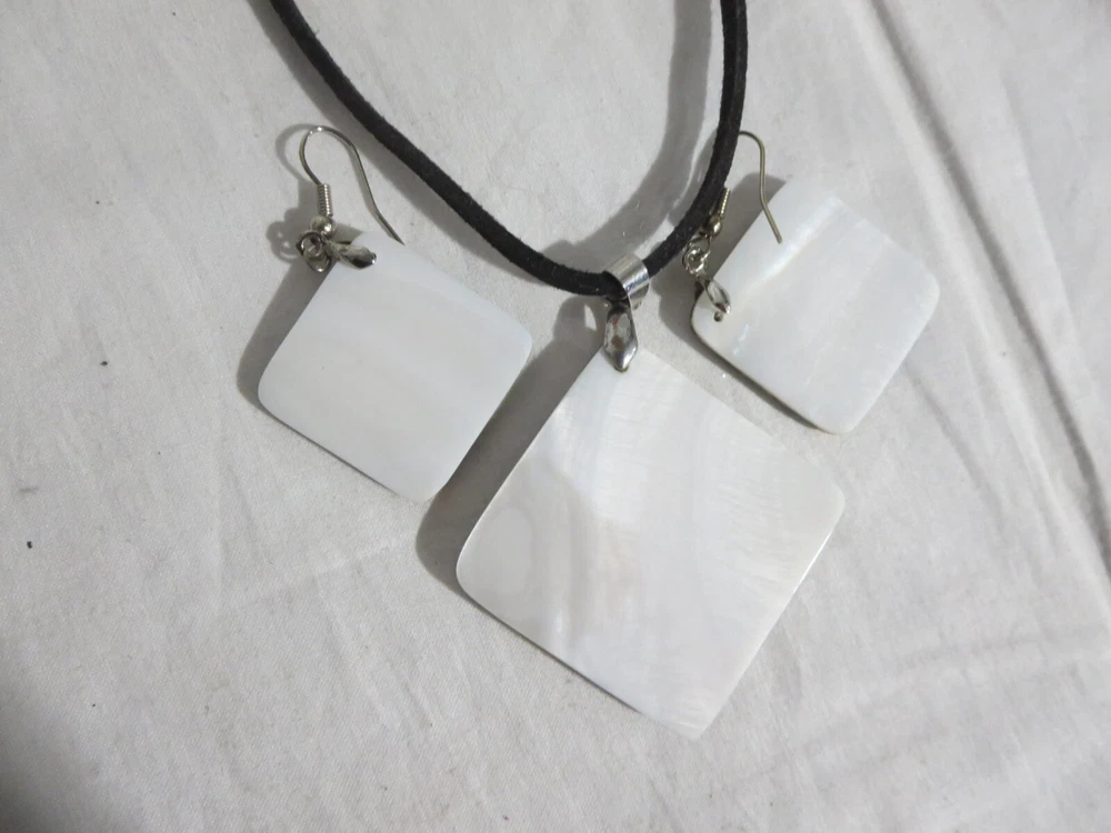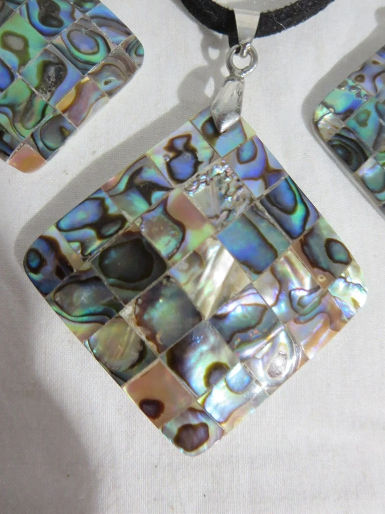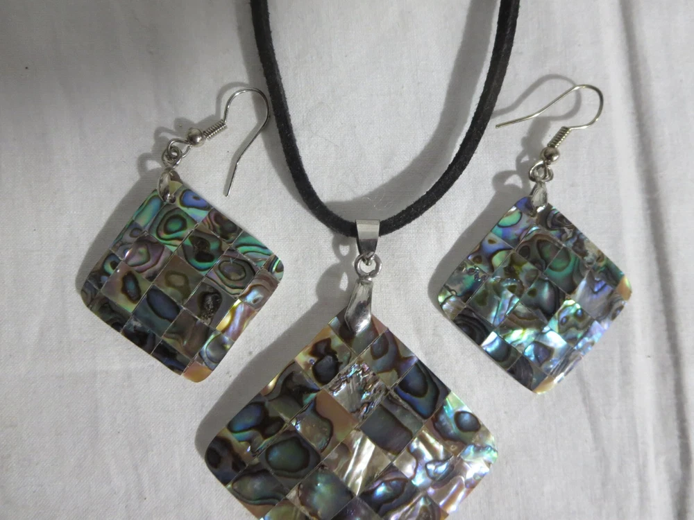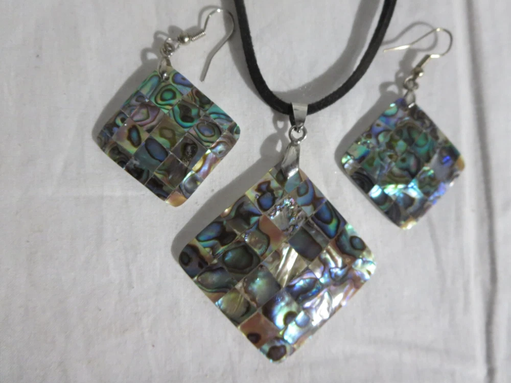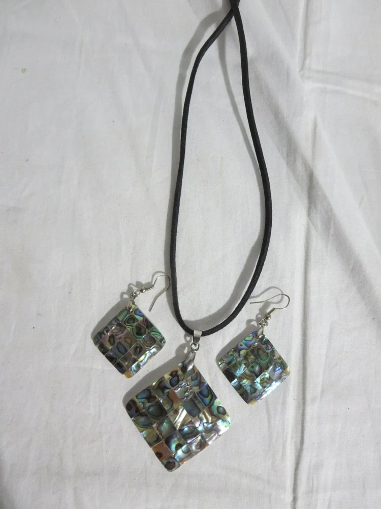 Abalone Shell Necklace and Peirced Earrings Leather Chain 17 1/2-19" Great Condition w/ Box Most of the items I sell are purchased at shops/garage sales/estate sales, etc. Unless stated new, they are pre-owned items. I cannot guarantee items I sell are from smoke/pet free homes originally. I can only say that once I have them, they are in a non smoking environment. So please keep that in mind when bidding/purchasing. I do combine shipping based on the weight of the combined items. I do accept returns and will give a full refund provided item returns in the condition it left. Buyer pays return shipping. Feel free to check out my store for more great items. Thanks for looking! Jeanie