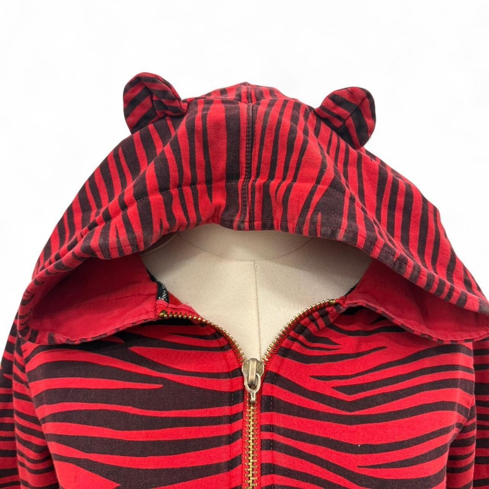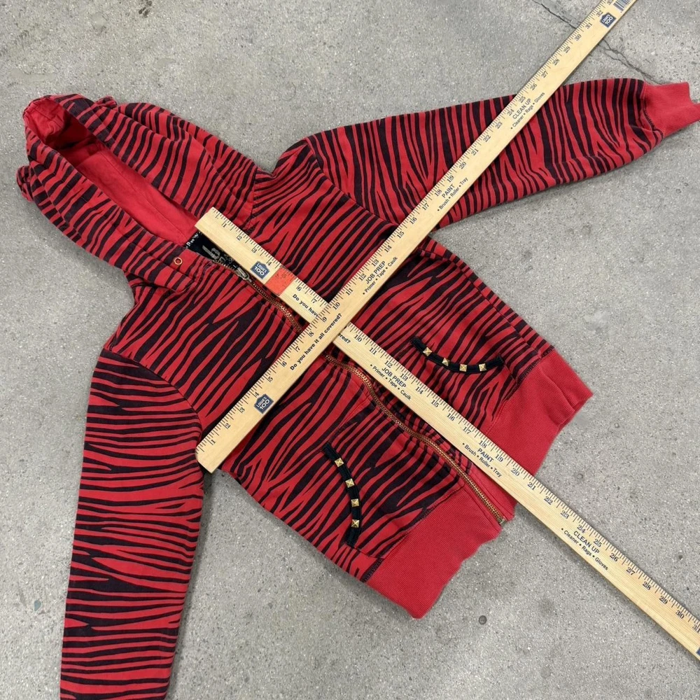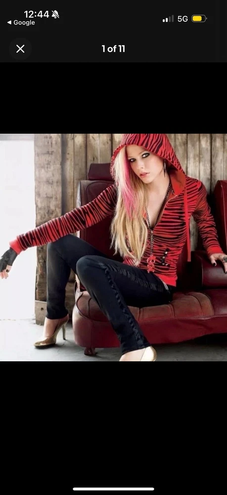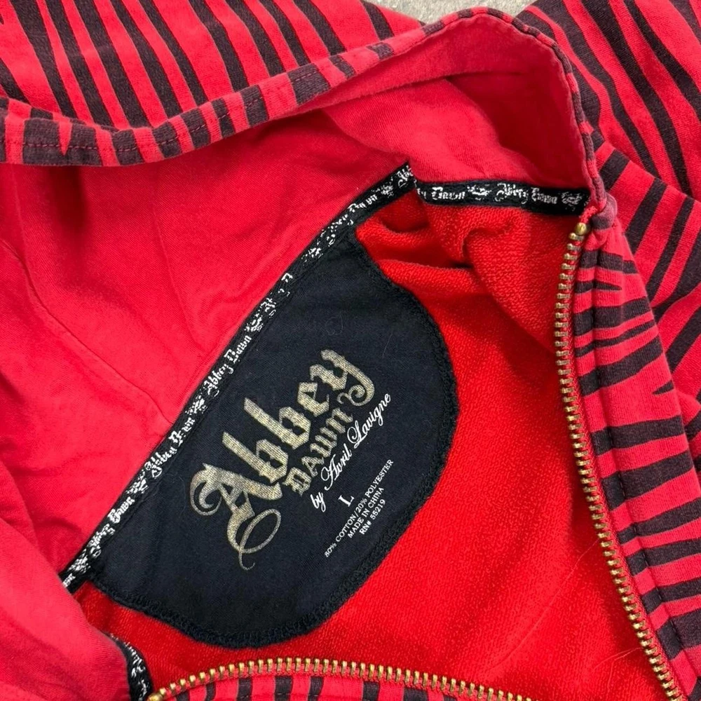 The product is a stylish Abbey Dawn hoodie designed by Avril Lavigne, featuring zebra stripes, cat ears, and studs for added flair. This juniors' size L hoodie is a rare indie sleaze grail.