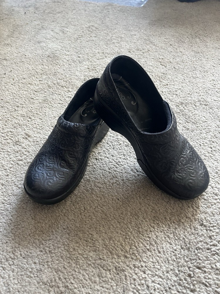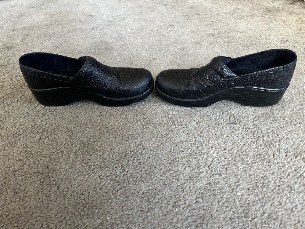 The Abeo B.I.O. Shoes are a pair of black low top slip-on clogs with a floral pattern, perfect for casual occasions. Made of leather with a standard shoe width, these shoes feature a comfortable clog vheel and are designed for walking activities. With a UK shoe size of 8.5 and a corresponding US and EU shoe size, these Abeo shoes offer both style and comfort for all-day wear in various seasons. Made in China, these classic-style shoes are a practical choice for women looking for a versatile and trendy footwear option.