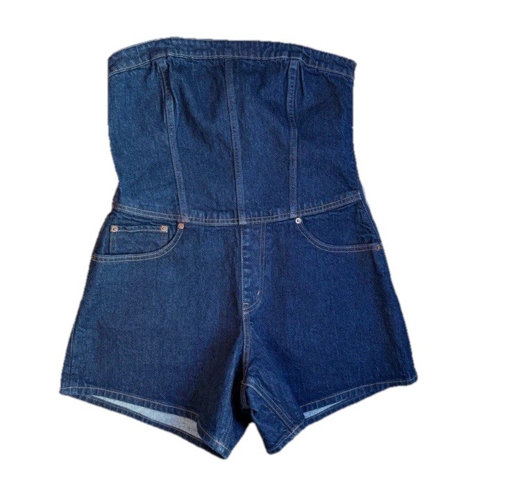 The product is a stylish Abercrombie & Fitch jean strapless short romper in size medium. This one-piece romper features a square neckline, sleeveless design, zip closure, and is made of denim fabric. It is suitable for various occasions including travel, parties, and casual wear. The romper comes in a classic blue color and has a regular fit. With features like easy care, comfort, and pockets, this romper is perfect for the summer and spring seasons, making it a versatile addition to any woman's wardrobe.