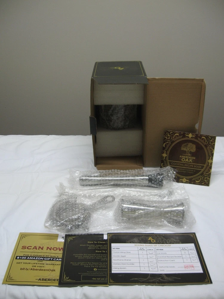 First, I want to thank you for taking the time to view my listing!! In this listing you are bidding on - Aberdeen Oak 6-Piece Mixing Glass Set - Ice Molds, Strainer, Spoon. This set includes Crystal Mixing Glass, Double Jigger, Hawthorne Strainer, Stainless Steel Muddler, Mixing Spoon, Ice Molds x2, Cocktail Recipe Booklet and Instruction Card. This item is NEW in open box. Listed as USED due to being pre-owned. See pics.! I am not an expert on anything I sell. I purchase estates and buy abandoned storage units. The items I list for sale are just items I have found in one of these ways. The items are listed as found! I do not clean or repair the items! If you have any questions about an item then please ask! I will only contact you through eBay Messages, so DO NOT send any personal contact information! For those who send this information anyway, you will be reported to eBay. I will only ship to the continental U.S., Alaska & Hawaii. You will receive tracking numbers through eBay showing that your item was shipped!