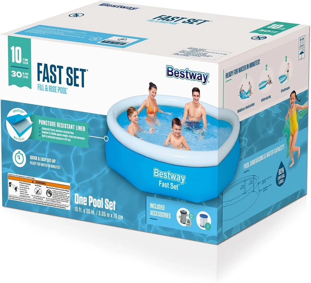 Kids and adults of all ages can enjoy swimming and splashing in Fast Set Above Ground Pool; It's the ultimate pool for backyard convenience with minimal setup A durable, yet lightweight PVC material provides structural integrity to your pool. It's tear-resistant and won't fade over time to sun exposure; Use this pool summer after summer Fast Set Pool is simple to set up and only takes about an hour to fill; Set on flat surface, inflate top ring with an air pump (not included), and fill the base of the pool with water This pool set includes a model 58511E 330-gallon filter pump and filter cartridge to keep your pool clean all summer long; This pool's water capacity is 1,004 gallons Disclaimer: Please review your HOA rules and restrictions before purchasing this product. Not all housing agencies permit private above-ground pools The 10ft Fast Set Pool Set is a great option for those with small backyard spaces. Because it's so quick and simple to set up and take down it makes an incredibly practical pool. You could either leave it up all season or pack it away after every use! All that you need to set up the above ground swimming pool is a flat, solid surface and an air pump (not included). Inflate the upper ring, fill the base with water and you are ready to go. This pool comes with a 330 gal filter pump to clean its water and maintain a healthy swimming environment. The pool also has a flow control drain valve, which can be attached to a hose to quickly fill or drain it. Bestway is committed to making innovative, quality products for people from all walks of life. Our extensive product offerings range from above ground swimming pools to inflatable air beds, from professional boats to the exciting toys and leisure products.