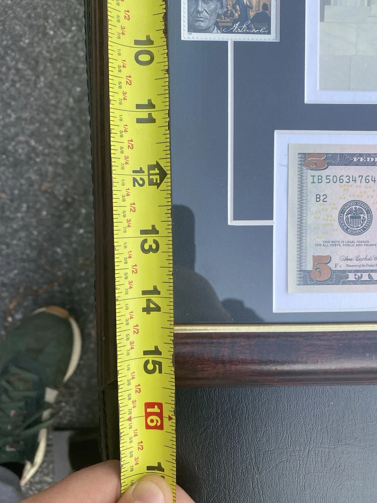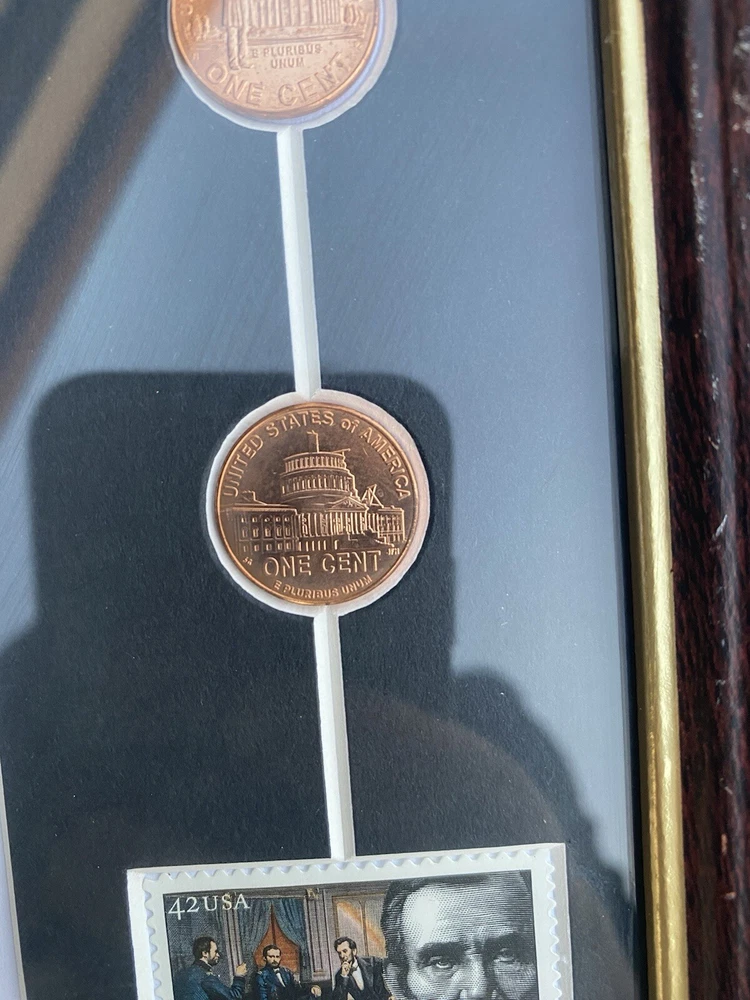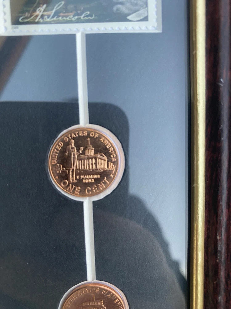 This Abraham Lincoln Coin 5 dollars Currency and Stamp Commemorative Collection is a must-have for any coin collector or history enthusiast. Made in the United States, this collection features a unique combination of coins, currency, and stamps, all highlighting the iconic figure of Abraham Lincoln. The collection is perfect for those interested in US history and culture, and would make a great addition to any collection or as a gift for a fellow collector. Don't miss out on this opportunity to own a piece of history. In a frame under the glass