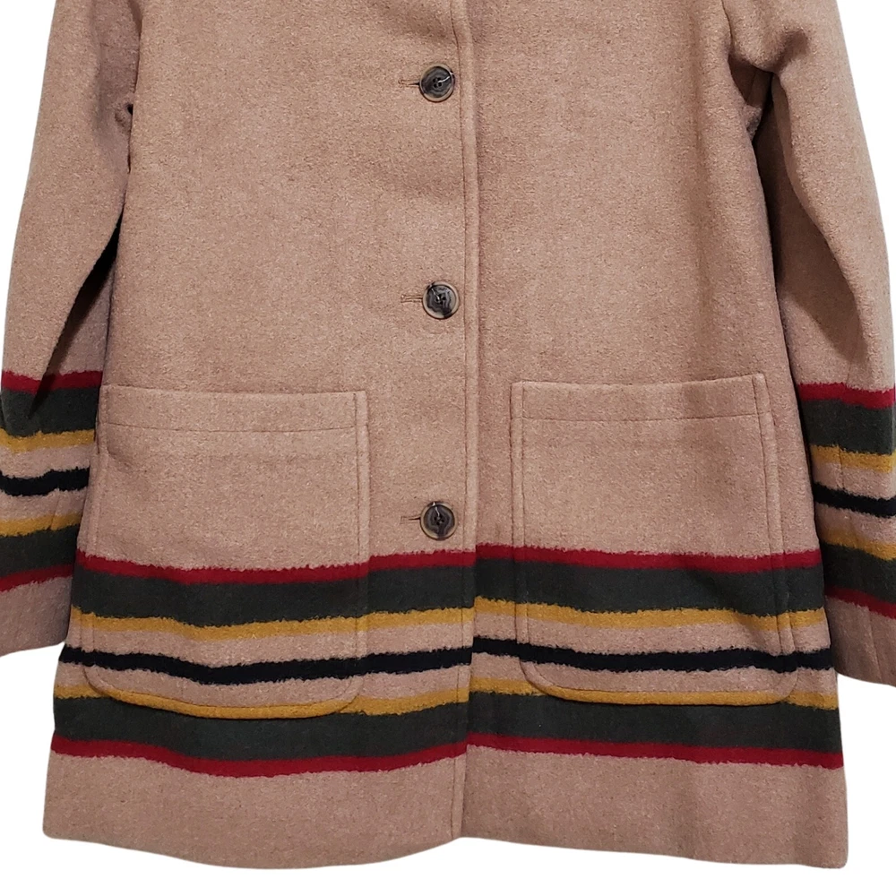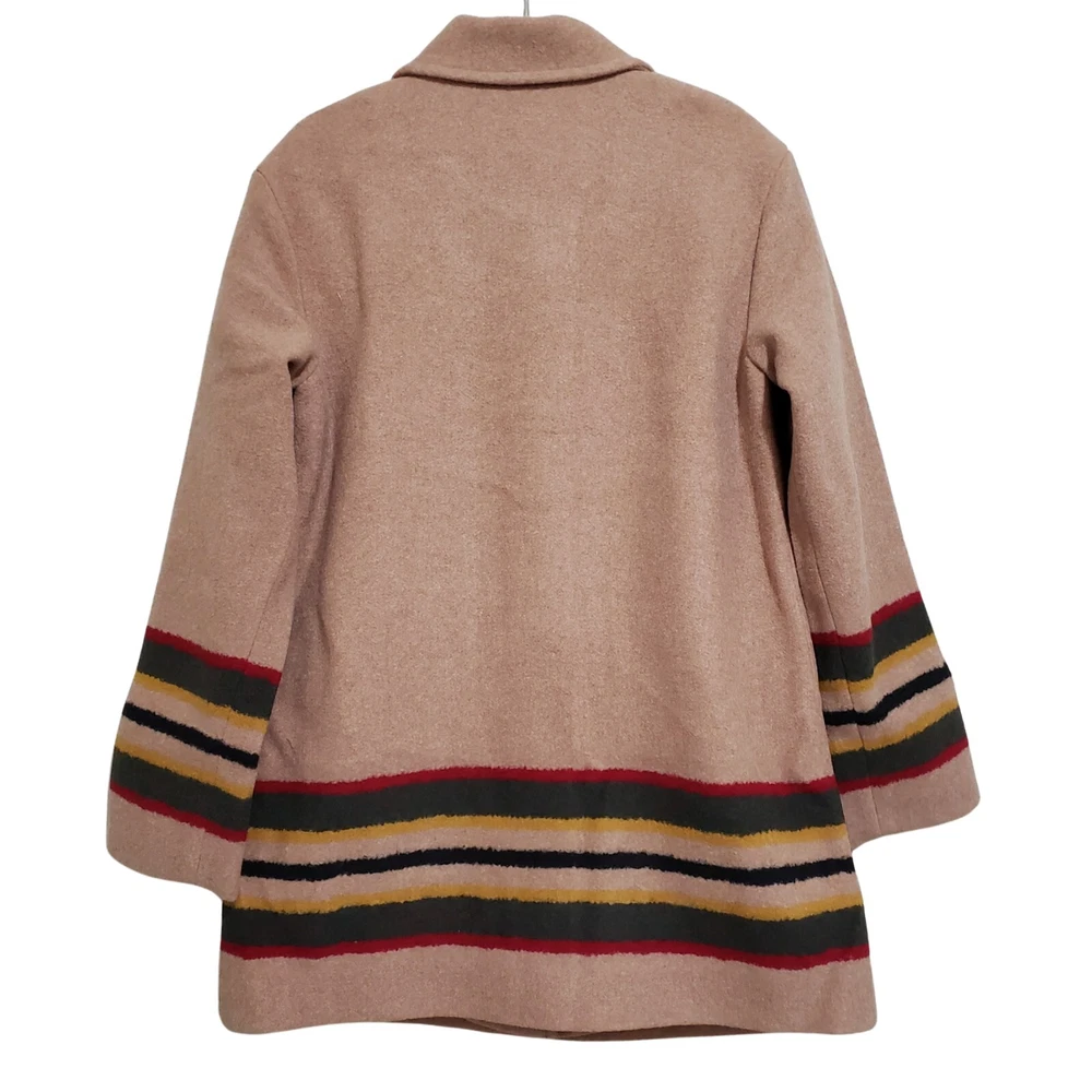 Pendleton Wool Knit Blend Topper Coat Heavyweight Women Large Camel Stripe NWT ▪︎New with Tags! ▪︎Color: Camel Stripe ▪︎Knit wool blend ▪︎Button closure ▪︎Hidden interior pocket ▪︎Split cuff design ▪︎Relaxed fit ▪︎Content: Shell: 58% Wool | 32% Polyester | 10% Rayon ▪︎Lining: 100% Polyester ▪︎Approximately 383 GSM ▪︎Heavyweight ▪︎Size Conversion: XS = 2 | S = 4-6 | M = 8-10 | L = 12-14 | XL = 16 | XXL = 18 ▪︎Dry clean only