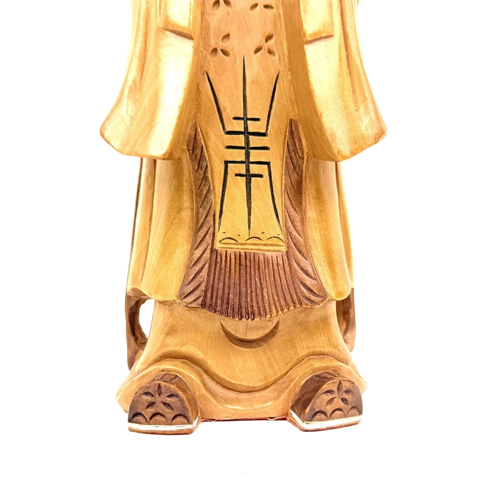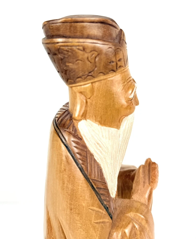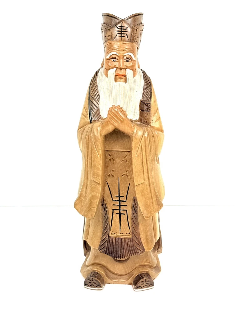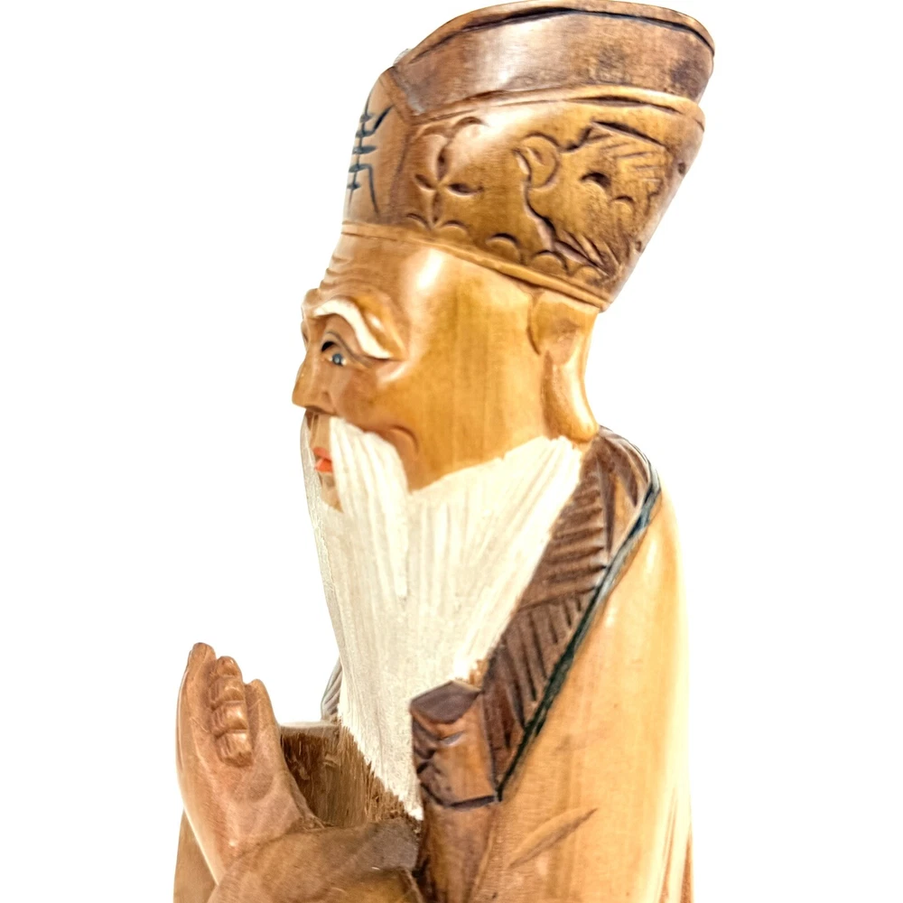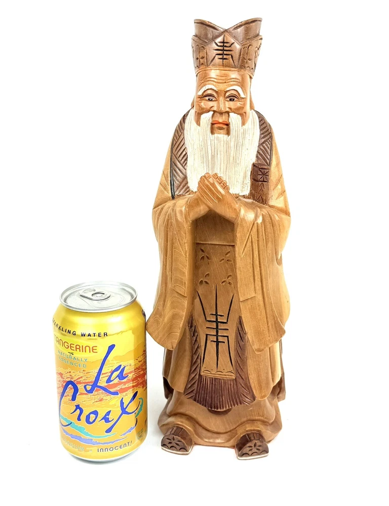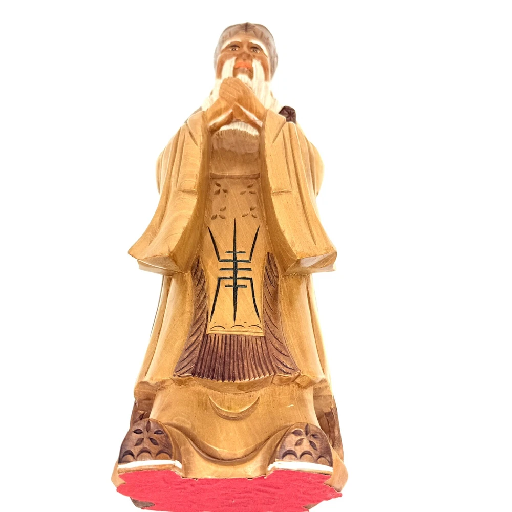 What an absolutely masterful piece of hand carved wood art! This figure of Kong Fuzi/Confucius is made from a solid piece of wood. I believe itβs olive wood, and the figure feels heavy for its size. There is an incredibly amount of detail put into the carving of the wood, especially into the face and beard. The figure is in good physical condition with only the slightest bit of surface wear. Has no cracks or breaks in the wood. Bubbling of red felt on bottom insisted with the age. Let me know if you have any questions. Blessings to you! π©Άπ€π©΅