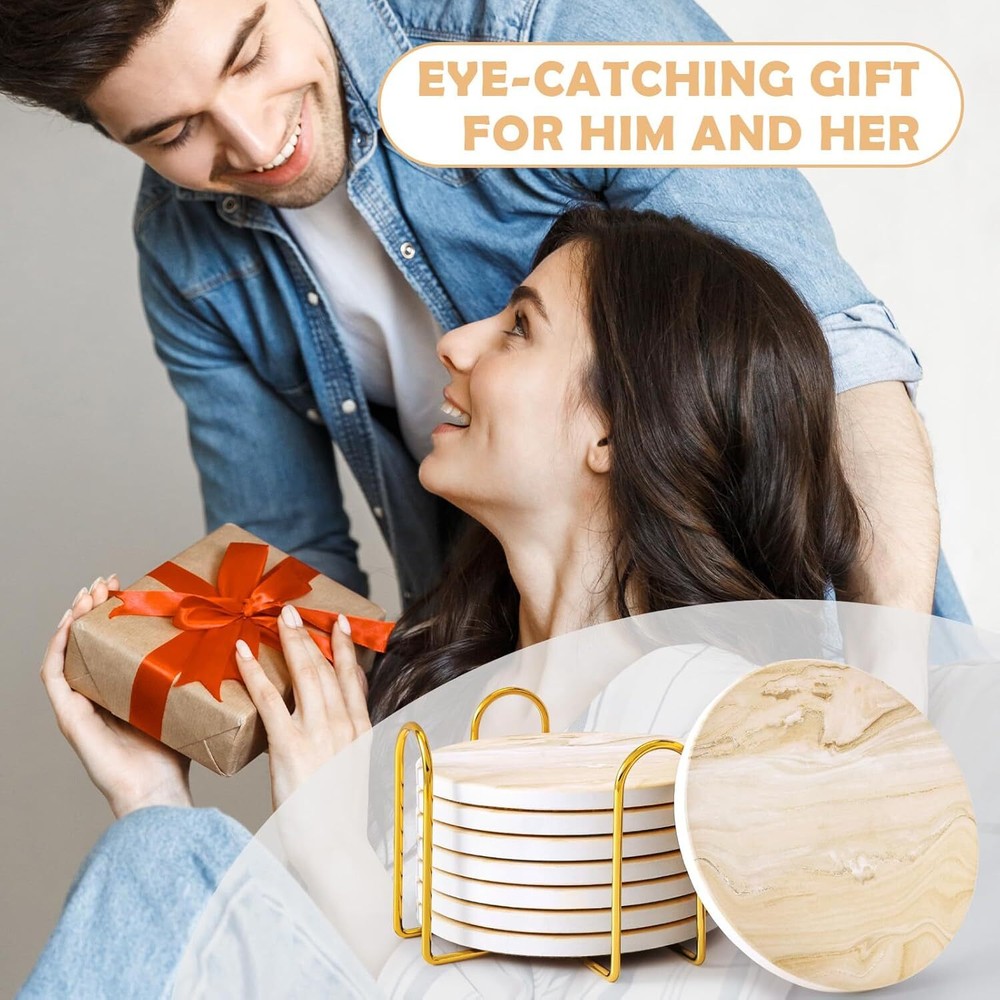 Coasters for Drinks Set of Absorbent Marble Style Ceramic Coaster Set 4 Beige SUPER ABSORPTION: Ceramic coasters are made of special absorbent materials that are more absorbent than stone, silicone, or plastic coasters. They can quickly absorb liquids in just a few seconds, preventing overflow onto the desktop and keeping it clean. PROTECT DESKTOP: The bottom of the coaster is made of a non-slip sawdust foot mat that will not scratch the table top. Ceramic has excellent thermal conductivity, allowing it to absorb and disperse heat, thereby protecting furniture from potential heat damage. IDEAL FOR GIFTING: These ceramic coasters are a perfect gift for friends on occasions such as housewarming birthdays, weddings, graduations, parties, Christmas, Thanksgiving, and other special events. It is suitable for various settings, including homes, living rooms, kitchens, coffee shops, bars, and restaurants. This beautiful and practical gift is sure to be loved by your friends. GOLD METAL HOLDER INCLUDED: With a gold metal holder, it can be used to decorate the desktop, adding both beauty and practicality. Ceramic coasters can be stacked on the metal holder, saving storage space and protecting them from bumping into each other, preventing wear and tear while keeping them clean. Shipping We offer FREE shipping on all orders! We ship within Three business days of payment, usually sooner. We use a selection of shipping services such as UPS, FedEx, USPS etc. We only ship to the lower 48 states, no APO/FPO addresses or PO Boxes allowed. Local pickups and combined shipping options are not provided at this time. Return You can return a product for up to 30 days from the date you purchased it. Any product you return must be in the same condition you received it and in the original packaging. Please keep the receipt. Customer satisfaction is very important to us. If you have any problem with your order, please contact us and we will do our best to make you satisfied. Contact Us If you have any queries, please contact us via ebay. We usually respond within 24 hours on weekdays. Please visit our eBay store to check out other items for sale! Thank you for shopping at our store.