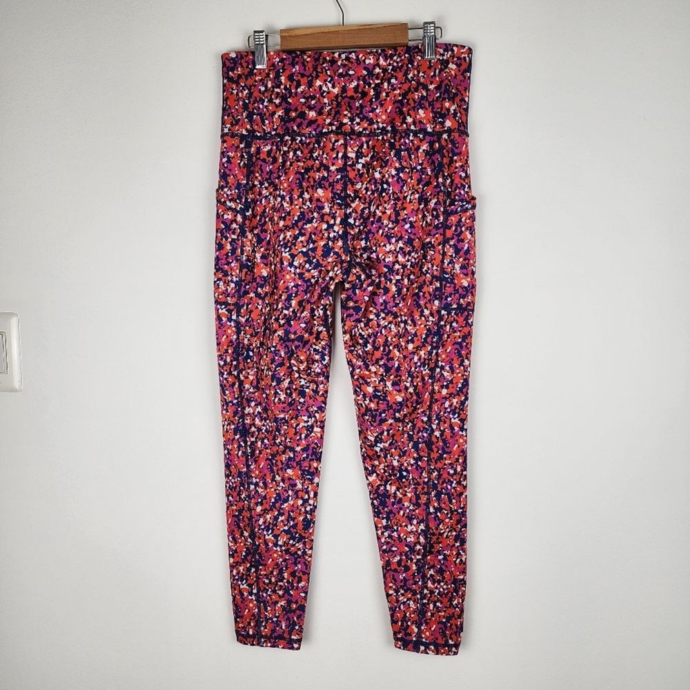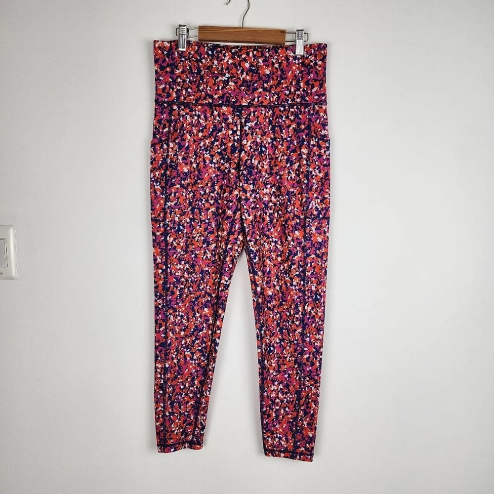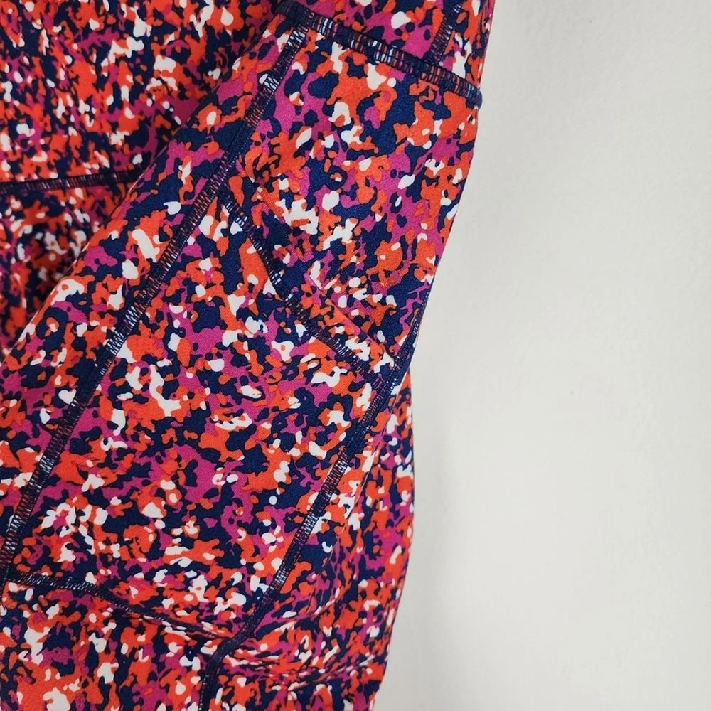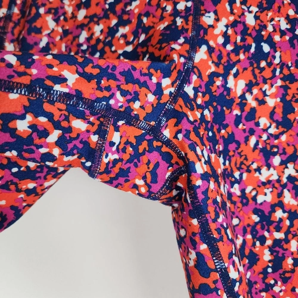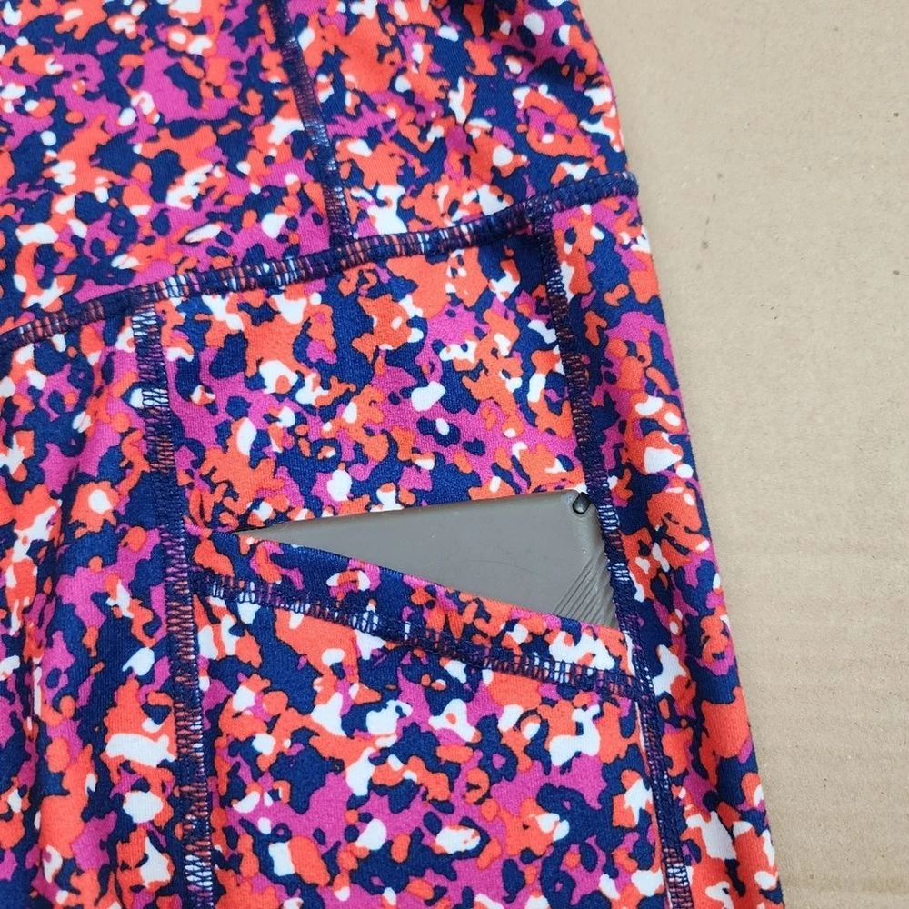 Ideology Compression Side-Pocket Cropped Leggings Abstract Patern - Size M, approx. measurements in pics - Side pockets (thigh) - blue pink orange - 44% Recycled Polyester, 43% polyester, 13% spandex - Pre-owned, clean, ready to wear.