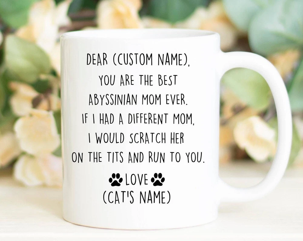 Abyssinian Mom Birthday Gift Abyssinian Mom Christmas Gift Abyss Cat Mom Valentine Gift Abyssinian Mom Appreciation Funny Abyss Mom Mug Product Details.. This high quality 11oz. ceramic white mug has a premium hard coat that provides crisp and vibrant color reproduction sure to last for years. Perfect for all hot & cold beverages. The highest quality printing possible is used. It will never fade no matter how many times you wash it. Material: 100% Ceramic. Print both sides. Dishwasher and Microwave Safe. High Gloss + Premium White Finish. Printed in the U.S.A. Personalized & Custom. We support personalized and custom mug to add custom, when placing an order, you can add notes to the "order note" in shipping address section. Also you can contact us directly via message. Shipping Info. Ready to ship in 1 to 2 business days, All products are made-to-order and proudly printed in the United States. Shipped by USPS and DHL, You will receive your order in 5-7 days. Replace & Refund. All products are defective during shipping broken, chipped will be replaced free of charge. You are not satisfied with the product, we will refund 100% money to you. If any other issues arise, please do not hesitate to message, we would be more than happy to assist you.