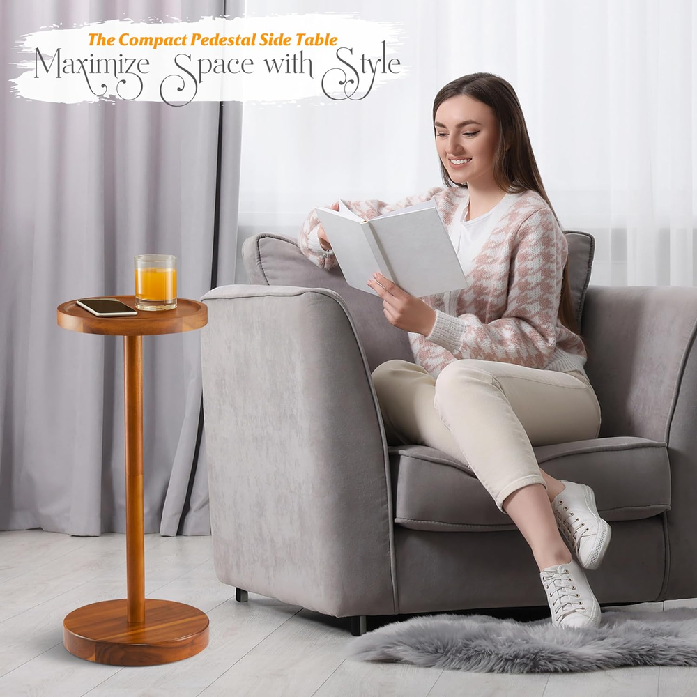 🌳NATURAL ACACIA WOOD: The BLUEWEST Pedestal Drink Table is crafted from premium Acacia wood, known for its excellent water resistance, thickness, and durability. Each table showcases a unique natural wood grain, offering a luxurious and individualistic touch to your home decor. The inherent beauty of Acacia wood not only adds a warm, organic feel to your space but also promises longevity and resilience. 📱 PHONE HOLDER: Equipped with a meticulously designed deep groove, engineered to securely cradle your smartphone, ensuring it remains safe from falling. This feature not only keeps your device within easy reach but also adds an element of convenience and safety, enhancing the functionality of this elegant table. ⚖️WEIGHTED BASE: Stability is key in any furniture piece, and the BLUEWEST table excels with its weighted base. This feature ensures a firm and stable structure, significantly reducing the risk of tipping or falling. Whether used in high-traffic areas or as a sturdy stand for your favorite beverages, this table remains steadfast and reliable. 🛠️ WELL-CRAFTED: Each BLUEWEST Acacia Pedestal Drink Table is a testament to the skill and meticulous attention to detail of our artisans. Handcrafted to perfection, the table is smooth from the structure to the lines of the product, ensuring not only visual appeal but also a tactile experience that speaks volumes of its quality craftsmanship. 📏SPACE-SAVING DESIGN: With dimensions of 9.4''W x 9.4''D x 22''H, this pedestal drink table is ingeniously designed to conserve space. It offers an effective alternative to bulky side tables, making it suitable for various areas within your home. Its compact size enables it to fit seamlessly into small apartments, condos, and even RVs, ensuring that you can enjoy elegance and functionality without compromising on space. Product Description Welcome to the BLUEWEST Acacia Pedestal Drink Table, a perfect blend of style and practicality. This isn't just any table; it's designed to make your life easier and your home more beautiful. It fits perfectly whether you're in a snug city apartment or a roomy house in the suburbs. Made from durable acacia wood and packed with features for today's lifestyle, this table solves common home furnishing challenges with ease and elegance. NATURAL ACACIA WOOD - EXCELLENT WATERPROOF Behold the unmatched beauty and resilience of premium acacia wood. Celebrated for its superb water resistance and robustness, each table boasts a distinctive wood grain, rendering your piece unique. This luxurious, natural material not only elevates your home’s aesthetic but also promises enduring beauty and performance. PHONE HOLDER Stability meets style in the design of our weighted base. Engineered for steadfastness, it ensures your table remains upright and secure, providing a reliable foundation for your beverages, books, and more, in any setting. WEIGHTED BASE - DURABLE CONSTRUCTION Discover the convenience of the table's integrated phone holder, strategically located in a deep groove on the tabletop. This innovative design securely cradles your smartphone, keeping it within easy reach and safe from spills or falls, enhancing the table's functionality. Space-Saving Elegance - The BLUEWEST Acacia Pedestal Drink Table Embrace the functionality of the BLUEWEST Acacia Pedestal Drink Table, ingeniously crafted to save space while delivering on style and utility. With dimensions of 9.4''W x 9.4''D x 22''H, it stands as an elegant solution for those seeking to maximize their living area. Its sleek profile is perfect for various settings — from serving as a chic drink table beside your favorite chair to acting as a stylish plant stand that brightens up any corner. Versatile Elegance - The BLUEWEST Acacia Pedestal Drink Table for Every Space The BLUEWEST Acacia Pedestal Drink Table is the quintessential addition to any space, embodying versatility and style in its design. Its sleek profile and compact size make it a perfect fit not only for the living room and bedroom but also for the office, balcony, and patio. Whether you're looking to create a cozy reading nook, display your favorite plants, or need a chic spot for your morning coffee, this table seamlessly adapts to your needs. Its ability to blend into various environments, from indoor comfort to outdoor elegance, underscores its multifunctional nature. This table ensures that regardless of where it's placed, it enhances the area with its practicality and charm, making it an indispensable piece for any setting