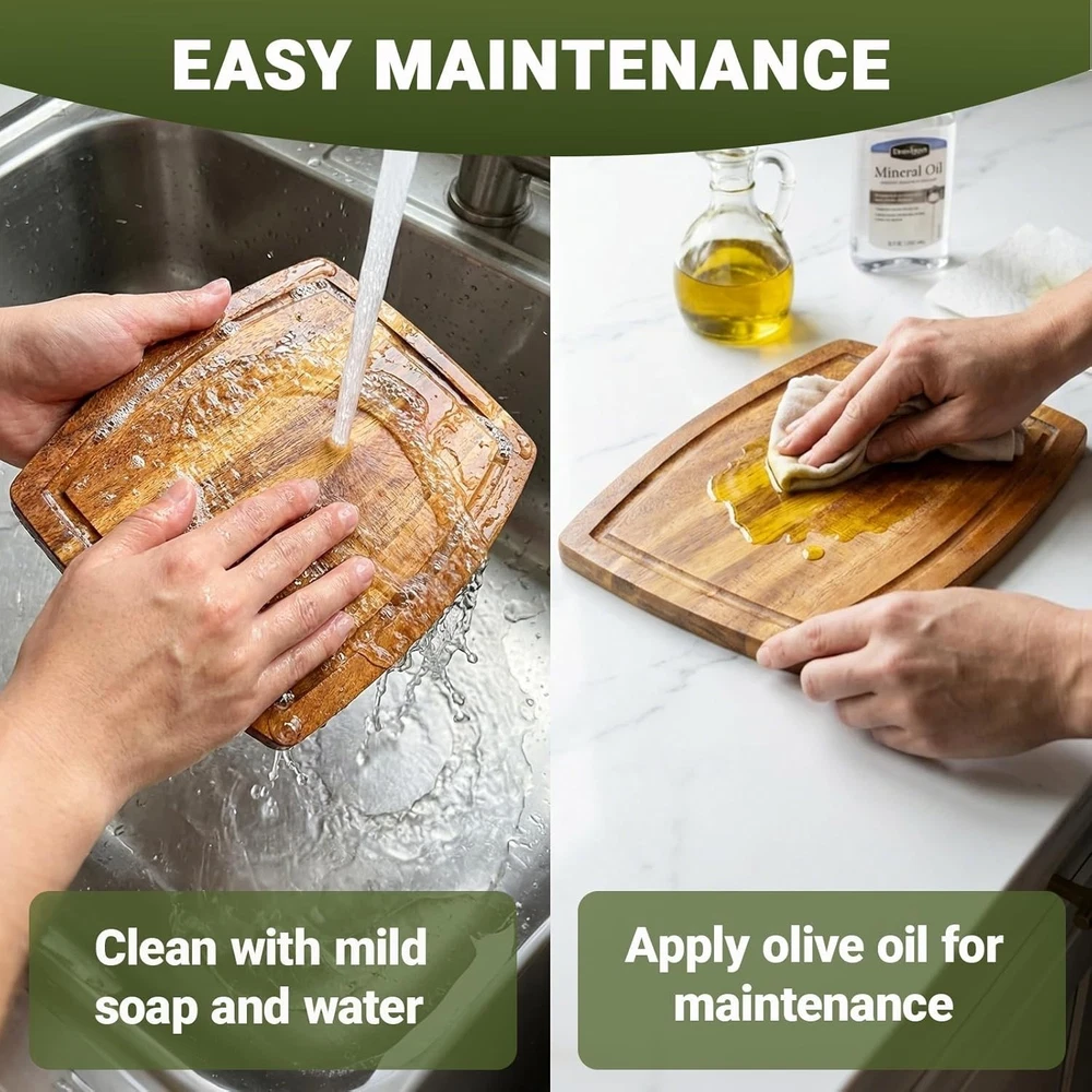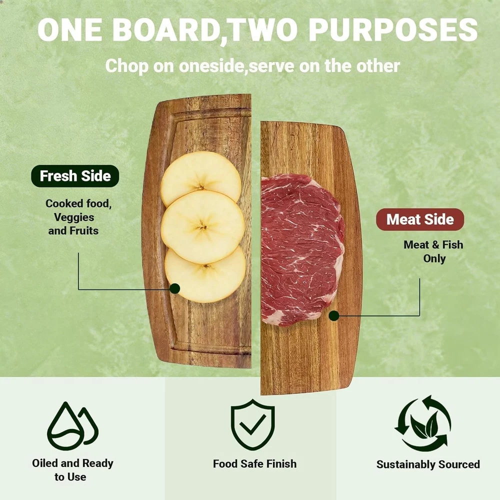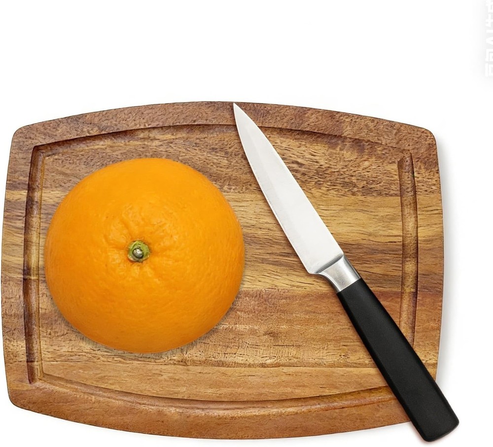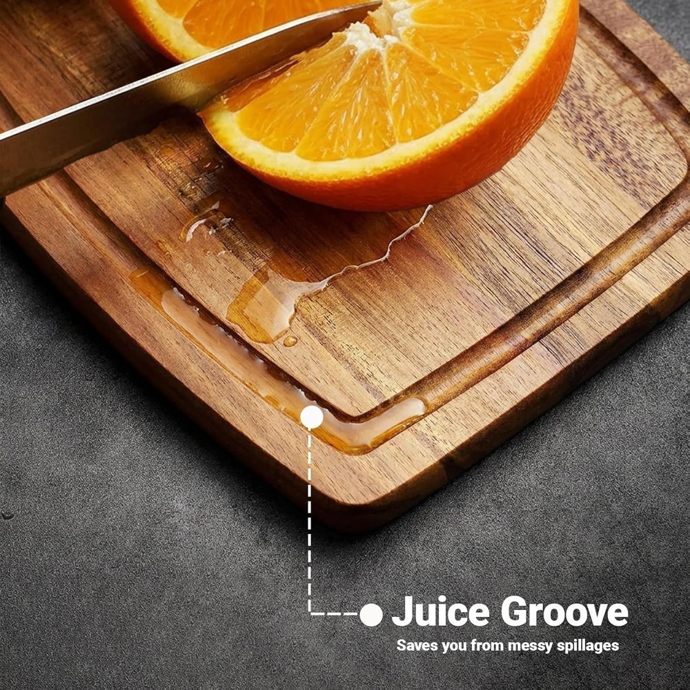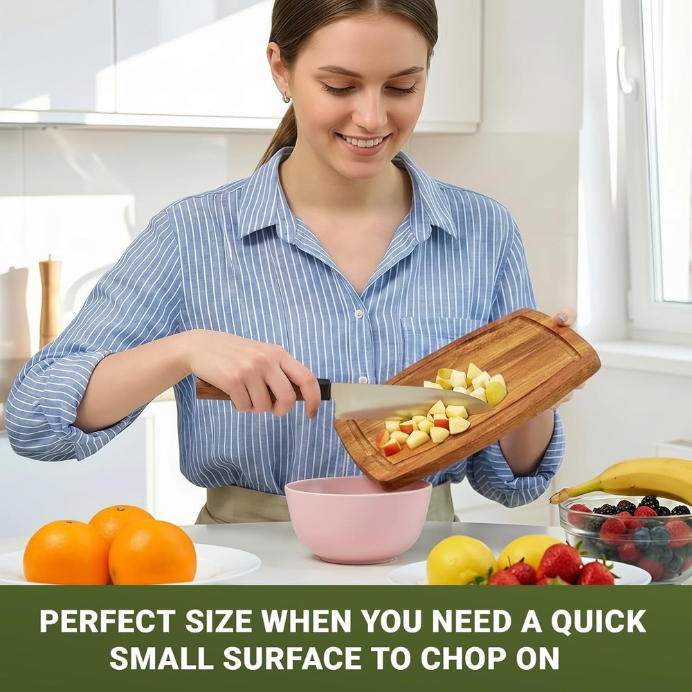 Acacia Wood Small Cutting Board for Kitchen, 8 x 6 Inch Thick Wooden Chopping Board Serving Boards with Deep Juice Grooves for Meat, Cheese, Vegetables, Bread, and Charcuterie Acacia Wood Cutting Board: Crafted from natural acacia wood, the wooden cutting board is eco-friendly and built to last, not easy to crack or rot. Vivid wood color with contrasting pattern can match any style of kitchen Smooth Finish: The surface of the kitchen wooden cutting boards have been burnished three times by the hand of our carpenters, so it touch smoothly without any splinter. Much more durable than bamboo and healthier than plastic Juice Groove Design: The small cutting board features a juice groove that saves you from messy spillages. It ensures your kitchen counters remain tidy during your food prep routine and a cleaner working area and lesser cleaning time. Care Tips: Quick wash and them wipe with a damp cloth or just wipe with a damp cloth, then place it in ventilated place to dry, DO NOT soak in water or expose in the sun. The Small cutting board sizes 8 x 6 x inch Versatile Use: The wooden cutting boards for kitchen can be used not only for cutting meat, chicken,bread, fruits, cheese and veggies, but also used as serving boards at home, hotels, bars or coffee shops .