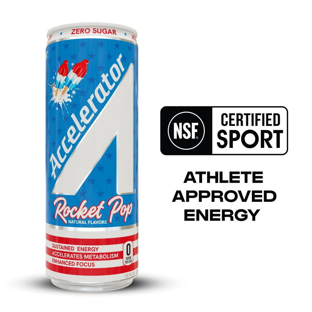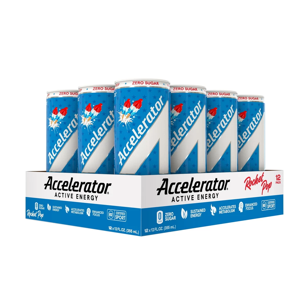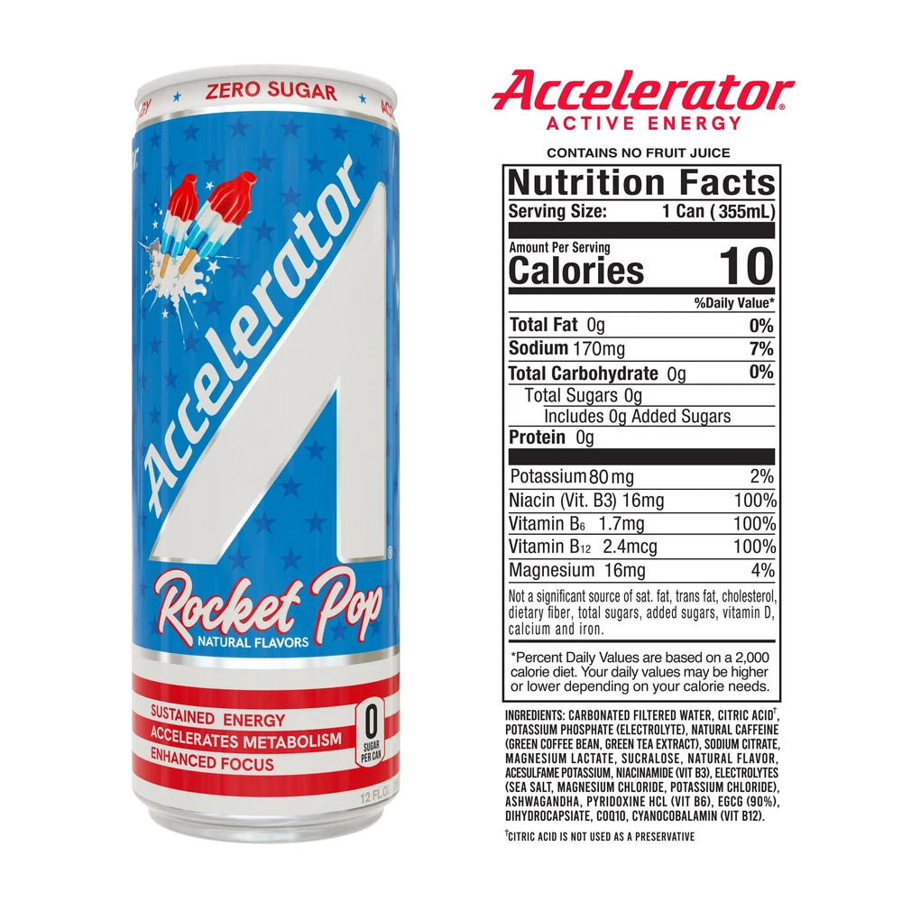 Product details With zero sugar, Accelerator provides sustained energy and enhances focus so you can accelerate your day. With our proprietary blend of natural caffeine, plant-based thermogenics and antioxidants to rev up your metabolism! Try our fan favorite flavor, Rocket Pop, that boasts cherry, lime, and blue raspberry fusion reminiscent of the iconic popsicle. Accelerator energy drinks are fueled by natural ingredients with caffeine coming from Green Coffee Bean & Green Tea Extract to accelerate you throughout the day without the crash and are offered in a wide range of refreshing zero sugar and non-artificial flavors to provide sustained energy for your workout or a needed boost to conquer the day! ROCKET POP: Cherry, lime, and blue raspberry fusion reminiscent of the iconic popsicle ZERO SUGAR & GREAT TASTE: Our proprietary sweetener blend provides 8 best-in-class on-trend flavors with no sugar and no artificial flavors, preservatives, or dyes. SUSTAINED ENERGY: Fueled by natural ingredients with caffeine coming from Coffee and Green Tea to accelerate you throughout the day without the crash. ENHANCES FOCUS: Caffeine, Ashwagandha and COQ10 combine to increase alertness, reaction time and mental clarity ACCELERATES METABOLISM: Our proprietary plant-based thermogenic blend is an easy and great solution to give your metabolism a boost and help you burn more calories. Accelerator’s blend of plant based active ingredients trigger metabolic functions to help you achieve your performance goals.