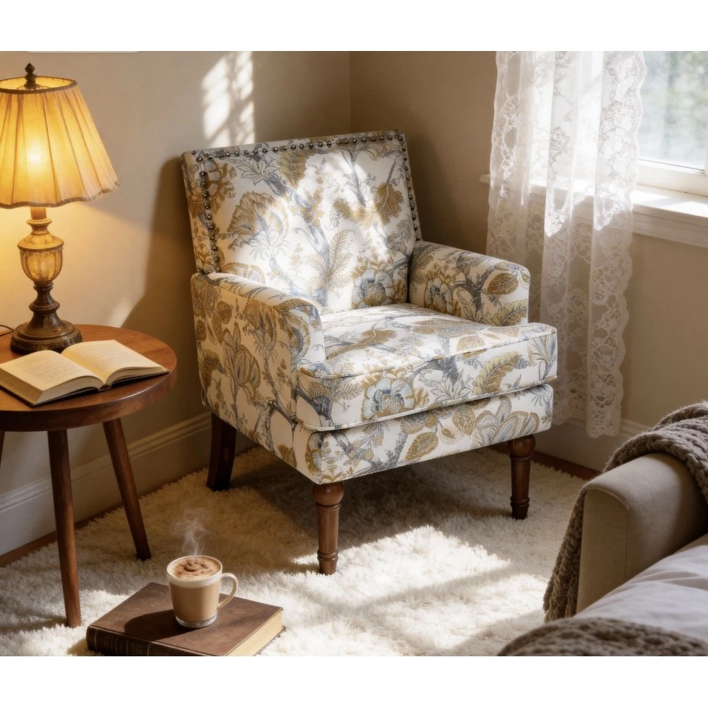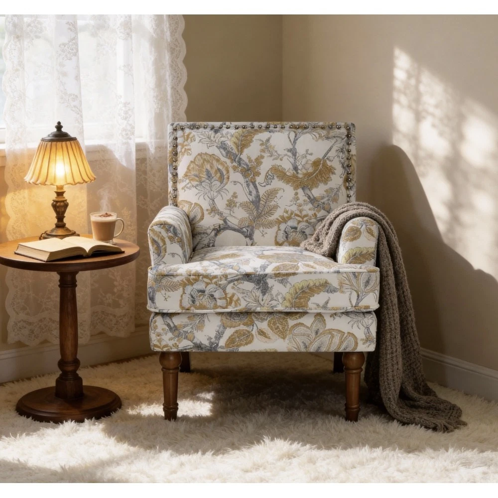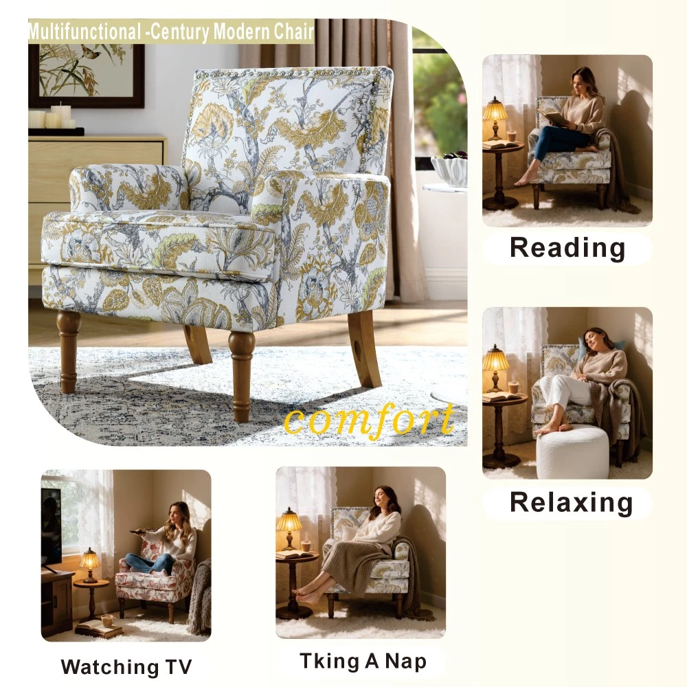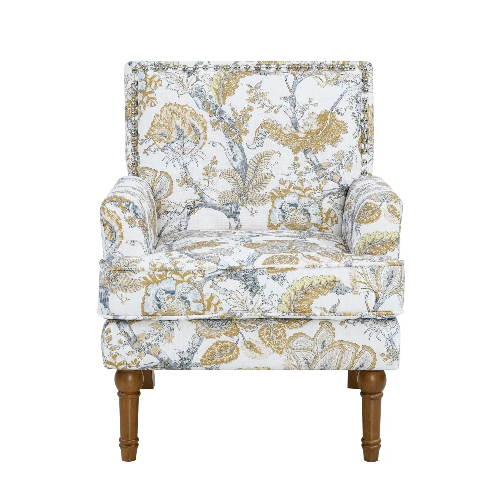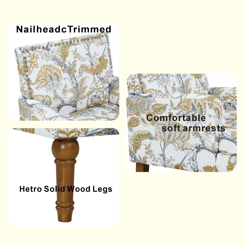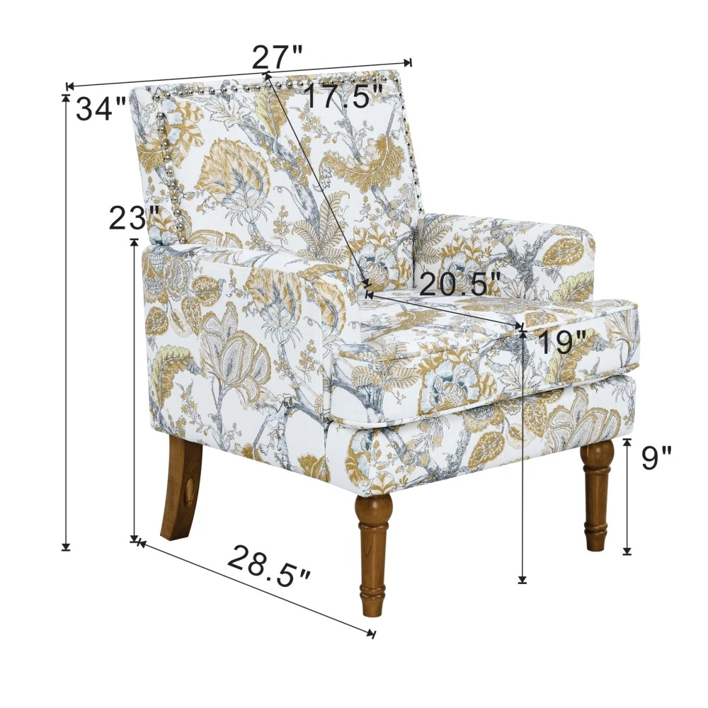 Accent Chair - Earthy Yellow, Floral Print with Nailhead Trim, Solid Wood Legs, Upholstered Slipper Chair for Living Room Elevate your primary living space with this stunning accent chair, crafted in Viet Nam to blend contemporary style with timeless comfort. Upholstered in an earthy yellow fabric adorned with sophisticated gold and grey floral prints, this chair features elegant nailhead trim, sturdy solid wood legs, and plush foam padding—making it a perfect statement piece for farmhouse, transitional, or modern interiors. Chic Botanical Pattern & Warm Earthy Tone. Dressed in a beautiful botanical tapestry-inspired fabric, this accent chair boasts a gold and grey floral print that adds a warm, artistic flair to any room. The earthy yellow base hue complements the floral design, offering a fresh take on classic elegance and making it an eye-catching statement piece that elevates modern farmhouse or transitional decors. Decorative Nailhead Trim for Tailored Sophistication. The chair’s high backrest is elegantly outlined with gleaming metallic nailhead trim, creating a refined, handcrafted aesthetic that exudes vintage luxury. This meticulous detailing adds structural definition to the chair, catching the eye from every angle and enhancing its overall polished look. Sturdy 9” Solid Wood Legs. Elevated by 9-inch tall solid wood turned legs with a natural finish, this chair delivers lasting stability and reliable support. The natural wood tone complements the warm earthy yellow fabric, while the generous 9-inch height makes vacuuming and general room maintenance a breeze—blending functionality with style. Plush High-Density Foam Comfort. Sink into premium comfort with a thick, high-resiliency foam-cushioned seat that retains its shape over time, ensuring long-lasting comfort. The supportive upright back offers ergonomic support, making this chair the perfect spot for long conversations, quiet reading sessions, or simply unwinding after a long day. Versatile for Any Living Space. With its compact silhouette and striking design, this upholstered slipper chair is a versatile addition to any room in your home. Use it as an accent piece in your living room, a cozy seating option in your home office, or a stylish side chair in your bedroom suite—offering both functional seating and a decorative element that enhances your space’s cozy ambiance. Perfect Size & Secure Shipping. The assembled chair measures 28.50”L × 27.00”W × 34.00”H and weighs 38.00 lbs, compact enough to fit in small spaces while still offering ample seating room. It ships in one secure package with dimensions of 27.50”L × 26.00”W × 15.50”H and a package weight of 45.00 lbs. All components are carefully packed with protective materials to prevent transit damage, ensuring your chair arrives in perfect condition. Easy Assembly. This accent chair comes with all necessary hardware and detailed assembly instructions, making setup straightforward even for those with minimal DIY experience. You’ll have your new statement piece ready to enjoy in no time. Care & Important Notes - Care Instructions: Spot clean the fabric with a mild soap solution and a soft cloth to remove dust and spills; avoid harsh chemicals or abrasive materials that may damage the floral print or fabric. Wipe the solid wood legs with a dry or slightly damp cloth to maintain their natural finish. - Color Variation: Actual product color (Earthy Yellow) may differ slightly from images due to lighting, monitor display differences, or fabric variations. This is normal and not a defect. - Size Variation: Manual measurement was used, so there may be some reasonable error between the actual product and the listed dimensions. Measurement data is for reference only. Product Details - Color: Earthy Yellow (with Gold & Grey Floral Print); Material: Wood + Fabric; Filling: Foam; Product Type: Accent Chair / Slipper Chair / Side Chair; Style: Contemporary; Origin: Viet Nam. - Assembled Dimensions: 28.50”L × 27.00”W × 34.00”H; Product Weight: 38.00 LBS. - Package Dimensions: 27.50”L × 26.00”W × 15.50”; Package Weight: 45.00 LBS; Number of Packages: 1; Assembly Required: Yes. - Key Features: Floral Botanical Print, Metallic Nailhead Trim, 9” Solid Wood Legs (Natural Finish), High-Density Foam Cushioning, Ergonomic Back Support, Compact Silhouette, Versatile Use. - Package Includes: 1 × Accent Chair, All Necessary Hardware, Detailed Assembly Instructions. - Applicable Scenario: Primary Living Space, Living Room, Home Office, Bedroom Suite; Perfect for adding style and comfort to any contemporary or farmhouse-inspired space. Warranty & Return Policy This Earthy Yellow Floral Accent Chair with Nailhead Trim is backed by a 1-year warranty against manufacturing defects, ensuring reliable durability and long-lasting use. We also offer a 30-day free return & exchange guarantee for your complete peace of mind. If you’re not fully satisfied with your purchase—whether it’s the quality, design, comfort, assembly process, or shipping—simply return it within 30 days for a full refund or replacement, no questions asked.