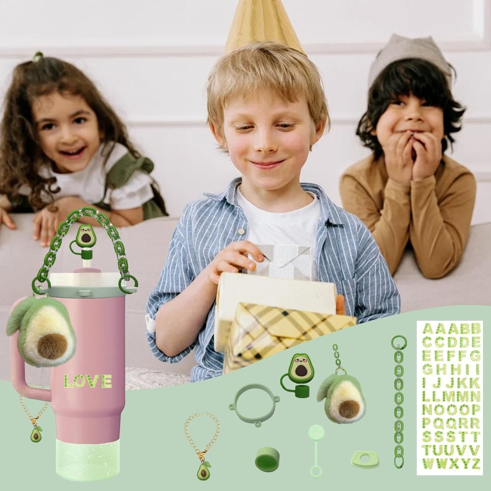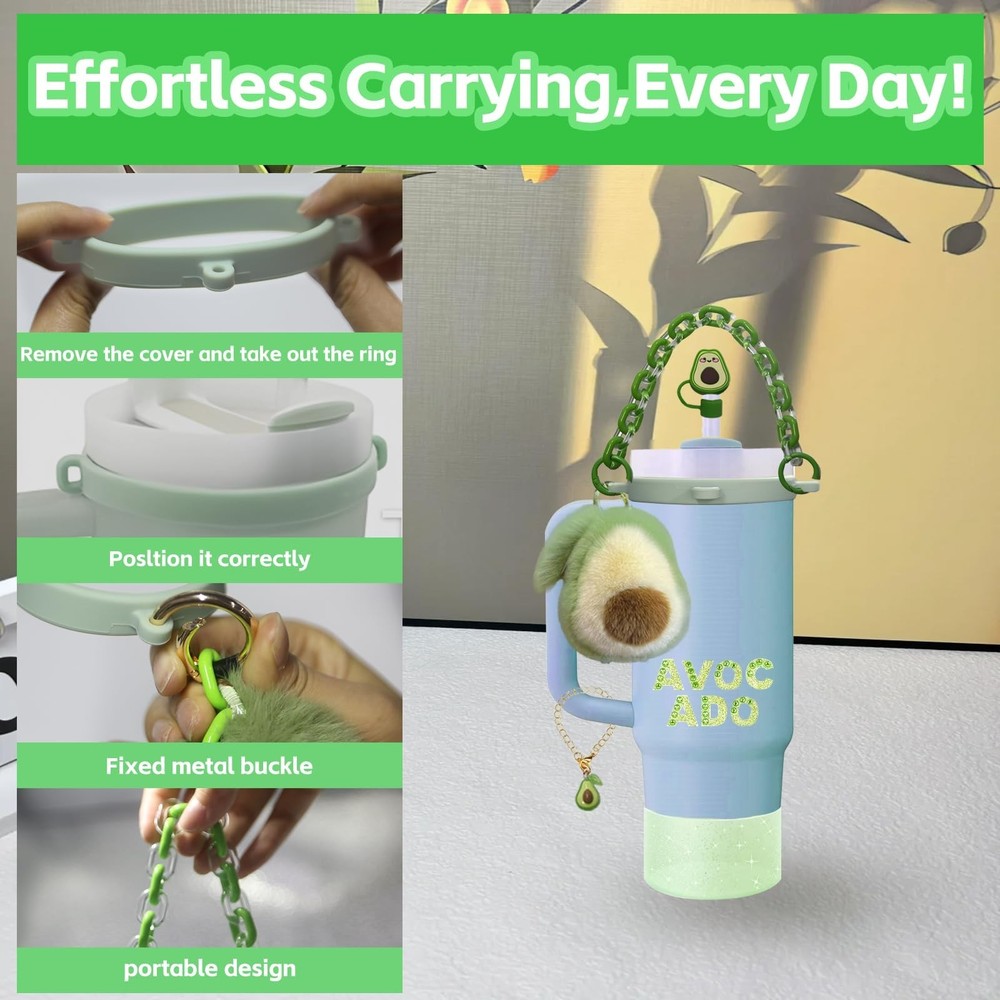 Accessories for Stanley Cups Set Including Water Bottle Handle Strap,Siliocne Cup Boot,Straw Cover,Charms for Stanley Cup 40oz & 30oz Tumbler Product Details Style: Avocado Brand: ATCCPYDM MPN: Does not apply UPC: Does not apply EAN: Does not apply Item Package Dimensions L x W x H: 5.2 x 4.84 x 2.05 inches Package Weight: 0.15 Kilograms Item Dimensions LxWxH: 3 x 2 x 1 inches Item Weight: 0.2 Pounds Brand Name: ATCCPYDM Warranty Description: NO Model Name: ATCCPYDM-STL01 Color: as show Material: Plastic, Siliocne Suggested Users: unisex-adult Manufacturer: ATCCPYDM Style: Avocado Included Components: 1 acrylic water bottle handle strap, 1 avocado straw cover, 1 pc silicone boot/1 avocado charm, 1 shining letter sticker/1 avocado pompom keychain, 1pc rubber cup ring/1 silicone spill proof stopper set Date First Available: March 24, 2025 Package Contains:You will get 1 acrylic water bottle handle strap,1pc rubber cup ring,1shining letter sticker,1 pc silicone boot,1 avocado straw cover,1 silicone spill proof stopper set,1 avocado pompom keychain,1 avocado charm.Note: The product does not include cups Acrylic Handle Strap: The chain is made of acrylic,and is paired with a high elasticity silicone ring for use,its easy to carry,Its ergonomic design provides a comfortable grip,improving the drinking experience while adding visual appeal Glitter Letters Stickers:Different letters stickers are provided, so you can choose any letters you like. You can spell out your name with a sticker. The water bottle stickers not only can make your tumbler special and shining, but also can make you identify your cup easily Avocado Element Keychain & Handle Charms: This avocado-themed cup accessories are made of resin and metal,for stanely cup 30 oz 40oz tumbler with handle combines avocado keychain and a avocado handle charms,effortlessly adding a personalized to your tumbler Protection & Decoration:Glitter boots for stanley cup can protect your bottles against accidental scratches and avoiding noisy during use.the straw cover is made of food-grade silicone, easy to clean.The pompom ball and hanging charm add a touch of personality to your tumbler Wide Compatibility:Accessories for stanley cup you can be placed in your vehicle's cup holder and use where you need it, especially when going to school,party,walking,camping,travel,sports and outdoor activities.Compatible with Stanley 30 and 40 Oz Sports Water Bottle Accessories