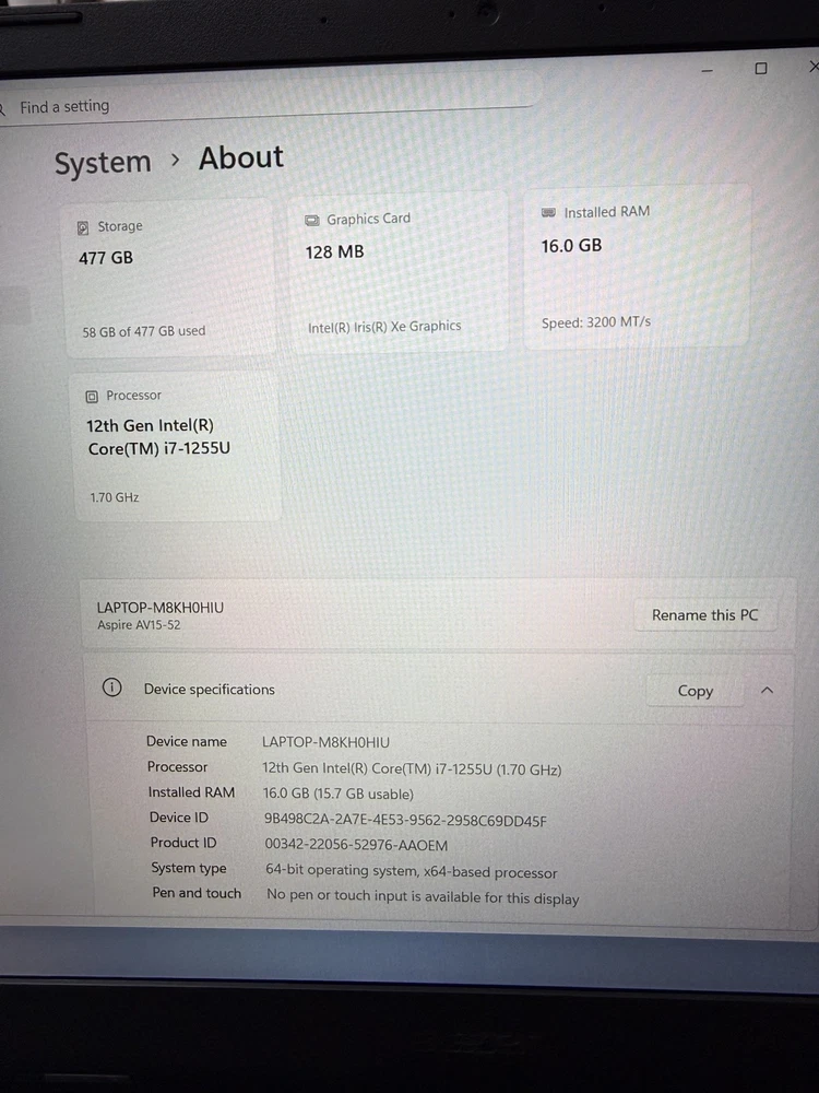 SSD Capacity: 512 GB Connectivity: HDMI, USB-C, USB 3.2 Features: Backlit Keyboard, Bluetooth, Built-in Microphone, Built-in Webcam, Wi-Fi, Fingerprint Reader Storage Type: SSD (Solid State Drive) Maximum Resolution: 1920 x 1080 Color: Gray Type: Notebook/Laptop GPU: Intel Iris Xe Graphics Hard Drive Capacity: 512 GB Model: Vero Processor Speed: 1.70 GHz Screen Size: 15.6 in RAM Size: 16 GB Brand: Acer Most Suitable For: Casual Computing, Workstation Manufacturer Warranty: 1 Year Graphics Processing Type: Integrated/On-Board Graphics Series: Aspire Processor: Intel Core i7 13th Gen. Operating System: Windows 11 Home