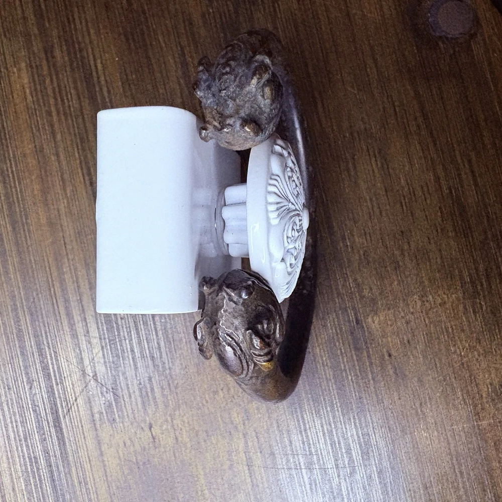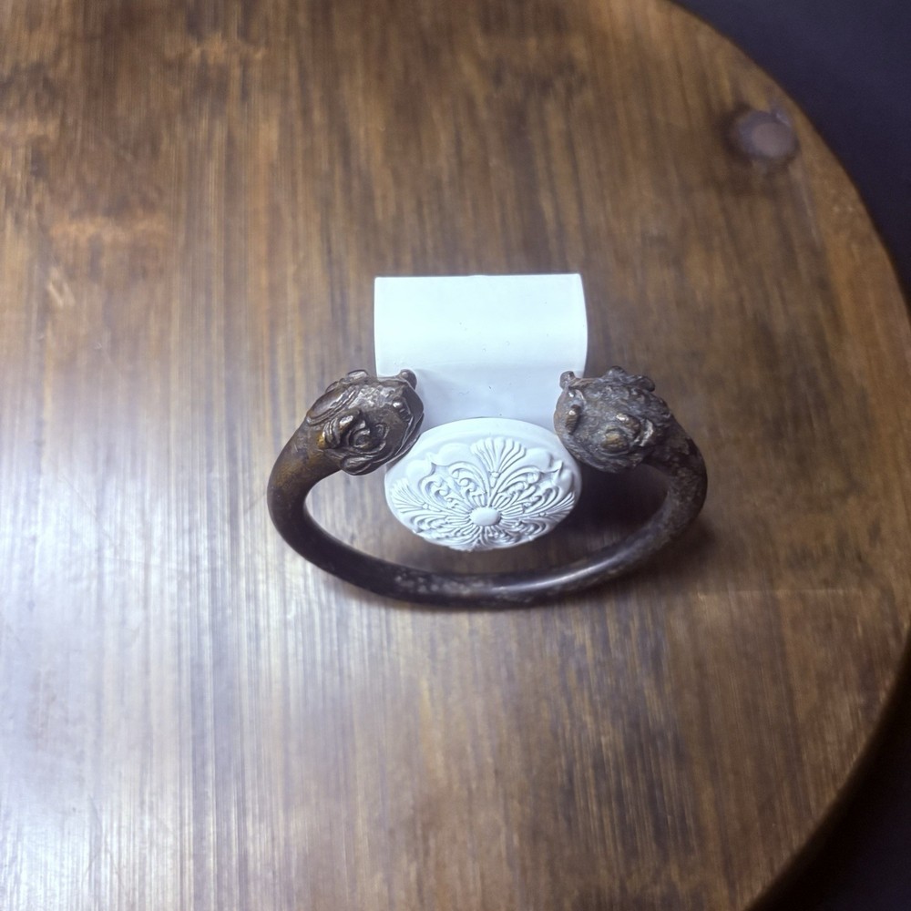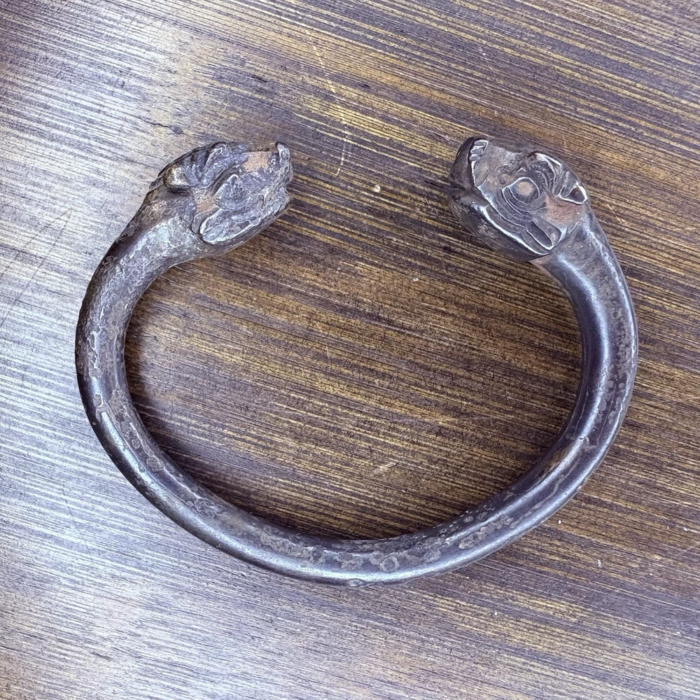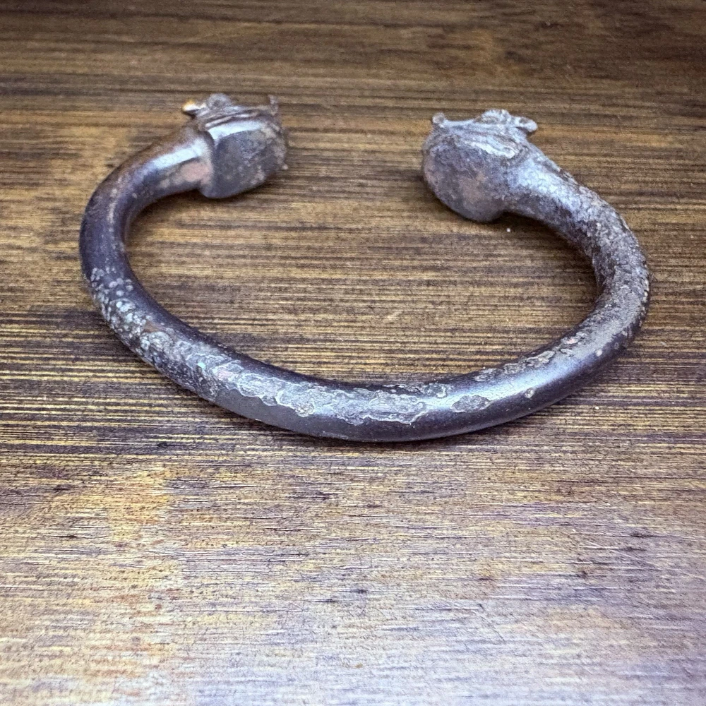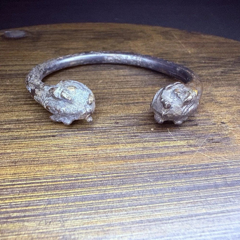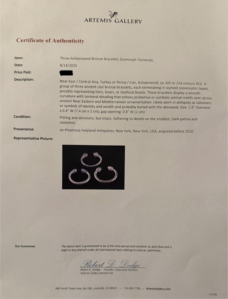 The bangle likely originated near East / Central Asia, Turkey or Persia during the achaemenid empire from 6th to 2nd century BCE. This is an ancient cast bronze bracelet terminating in stylized zoomorphic heads, possibly representing lions, boars, or mythical beasts. The bracelet display a smooth curvature with terminal detailing that echoes protective or symbolic animal motifs seen across ancient eastern and mediterranean ornamentation. Likely worn in antiquity as talismans or symbols of identity and wealth. These bangles would usually be buried with the deceased. Condition: Pitting and abrasions, but intact. Softening to details on the smallest. Dark patina and oxidation. Size: 2.9" Diameter x 0.4" W (7.4 cm x 1 cm); gap opening: 0.8" W (2 cm) Provenance: ex-Phoenicia Holyland Antiquities, New York, New York, USA, acquired before 2010 . This item is legal to buy/sell under U.S. Statute covering cultural patrimony Code 2600, CHAPTER 14, and are guaranteed to be as described or your money back.