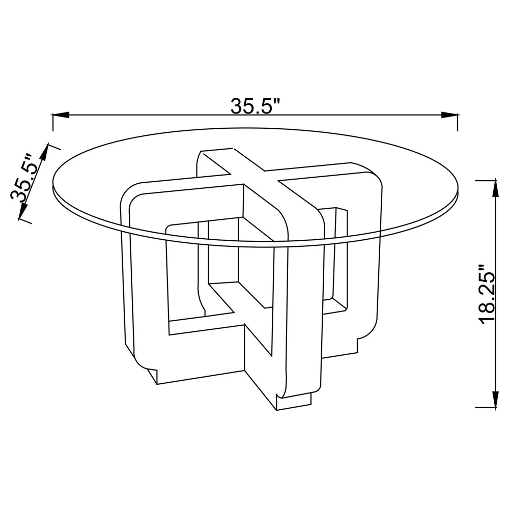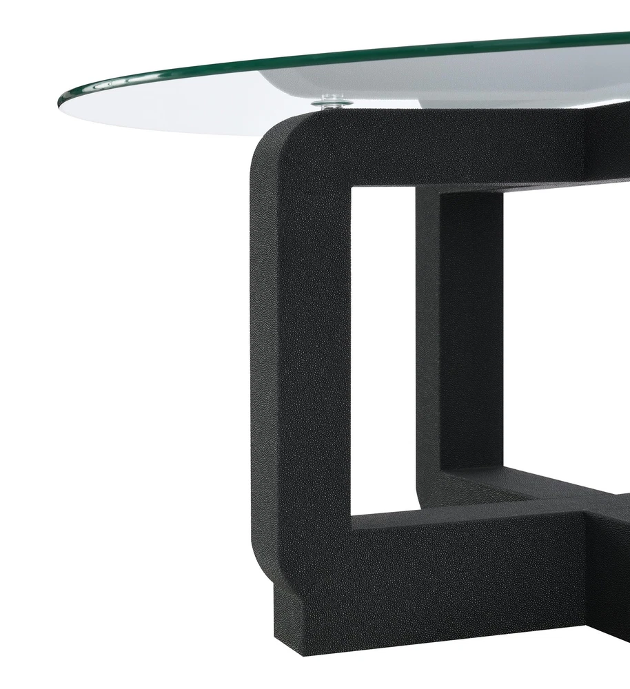 Includes: One (1) coffee table Charming open base brings sculpted flair to a modern coffee table design Features a round glass top that adds light, airy appeal to a decorative base design Base is constructed in MDF and wrapped in black faux leather to create alluring texture and depth Four C-shaped legs create a compelling geometric crossing silhouette for an open base The overall weight limit of this mirrored coffee table is 50 pounds
