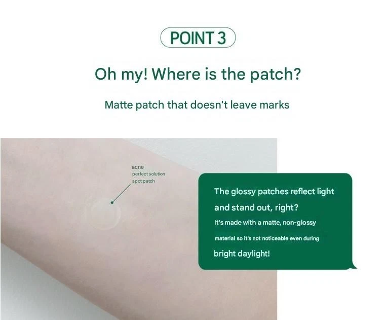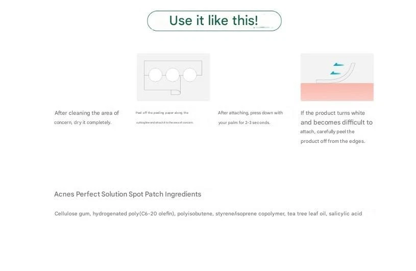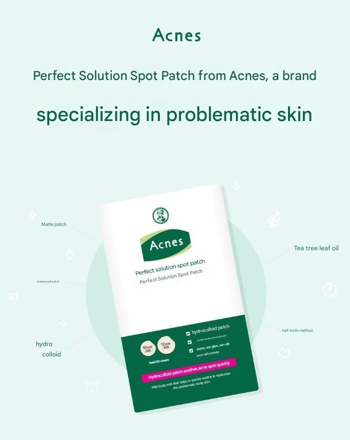 Acnes Perfect Solution Spot Patch A specialized hydrocolloid acne patch designed to soothe, protect, and heal skin problem areas quickly and discreetly. Key Features πΏ Tea Tree Leaf Oil β Soothes irritated skin and provides gentle care for troubled spots. π§ High-Adhesion Hydrocolloid β Maintains a moist environment to promote faster healing while protecting against external irritants. π» Ultra-Thin & Invisible β Only 0.16mm thick, matte finish makes it barely noticeable, even in bright daylight. πΏ Waterproof & Long-Lasting β Stays firmly in place throughout the day, even after showering. βοΈ Half-Knife Sheet Design β Easier and cleaner to peel off without contaminating the patch. π Flawless Coverage β Blends seamlessly with skin, preventing makeup disruption. How to Use Clean and dry the affected area completely. Peel off the patch from the sheet and apply directly onto the spot. Press gently for 2β3 seconds to secure adhesion. Remove once the patch turns white or after desired usage time. Ingredients Cellulose gum, Hydrogenated poly(C6-20 olefin), Polyisobutene, Styrene/isoprene copolymer, Tea tree leaf oil, Salicylic acid